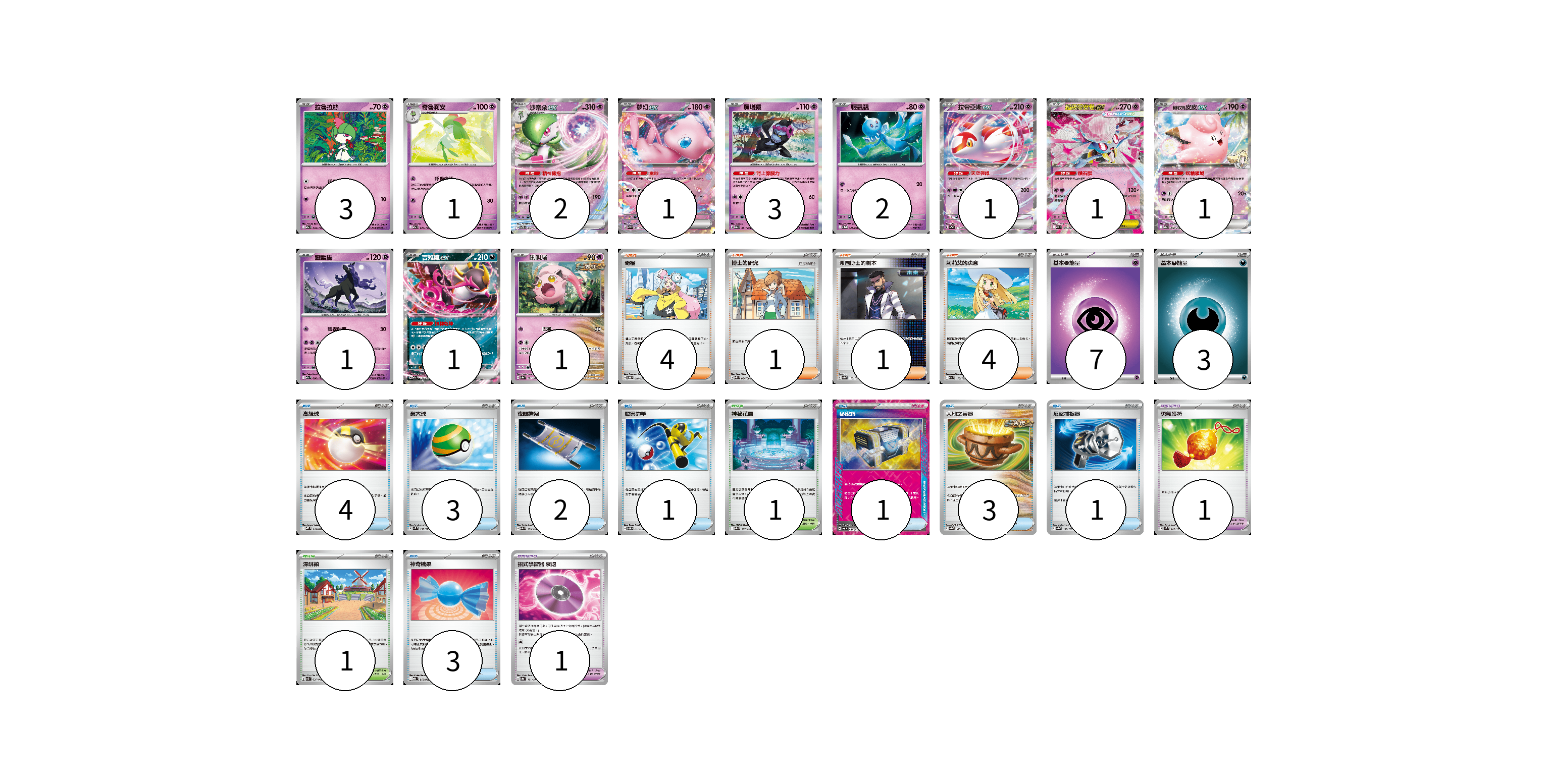 牌組構築方案 以此牌組為基礎新構築牌組 顯示卡面 顯示列表 寶可夢卡(18) 3 1 2 1 3 2 1 1 1 1 1 1 寶可夢道具(2) 1 1 物品卡(18) 4 3 2 1 1 3 1 3 支援者卡(10) 4 1 1 4 競技場卡(2) 1 1 能量卡(10) 7 3 寶可夢卡(18) 卡牌名稱 張數 卡牌名稱 張數 拉魯拉絲 M2a 069/193 03 奇魯莉安 M2a 070/193 01 沙奈朵ex SVTS 004/022 02 夢幻ex SVK 001/042 01 願增猿 M2a 081/193 03 輕飄飄 SV11W 041/086 02 拉帝亞斯ex SV7a 019/064 01 超級蒂安希ex MBD 006/022 01 莉莉艾的皮皮ex M2a 060/193 01 靈幽馬 M2a 080/193 01 吉雉雞ex M2a 114/193 01 吼叫尾 SV8a 071/187 01 寶可夢道具(2) 卡牌名稱 張數 卡牌名稱 張數 勇氣護符 SVM 142/175 01 招式學習器 衰退 SV8a 161/187 01 物品卡(18) 卡牌名稱 張數 卡牌名稱 張數 高級球 MBD 014/022 04 巢穴球 SVM 133/175 03 夜間擔架 M2a 159/193 02 厲害釣竿 SVOM 011/021 01 秘密箱 SV6 092/101 01 大地之容器 SV8a 143/187 03 反擊捕捉器 SV8a 139/187 01 神奇糖果 MBG 013/022 03 支援者卡(10) 卡牌名稱 張數 卡牌名稱 張數 奇樹 SVOD 016/020 04 博士的研究 SV11B 084/086 01 弗圖博士的劇本 SV8a 175/187 01 莉莉艾的決意 M2a 175/193 04 競技場卡(2) 卡牌名稱 張數 卡牌名稱 張數 神秘花園 M2a 187/193 01 深缽鎮 SVK 039/042 01 能量卡(10) 卡牌名稱 張數 卡牌名稱 張數 基本【超】能量 MBD PSY 07 基本【惡】能量 MBG DAR 03 以此牌組為基礎新構築牌組 牌組編碼 plWNVO-ozqaib-kTLzUe copy 列印牌組單 牌組編碼已複製 分享至SNS