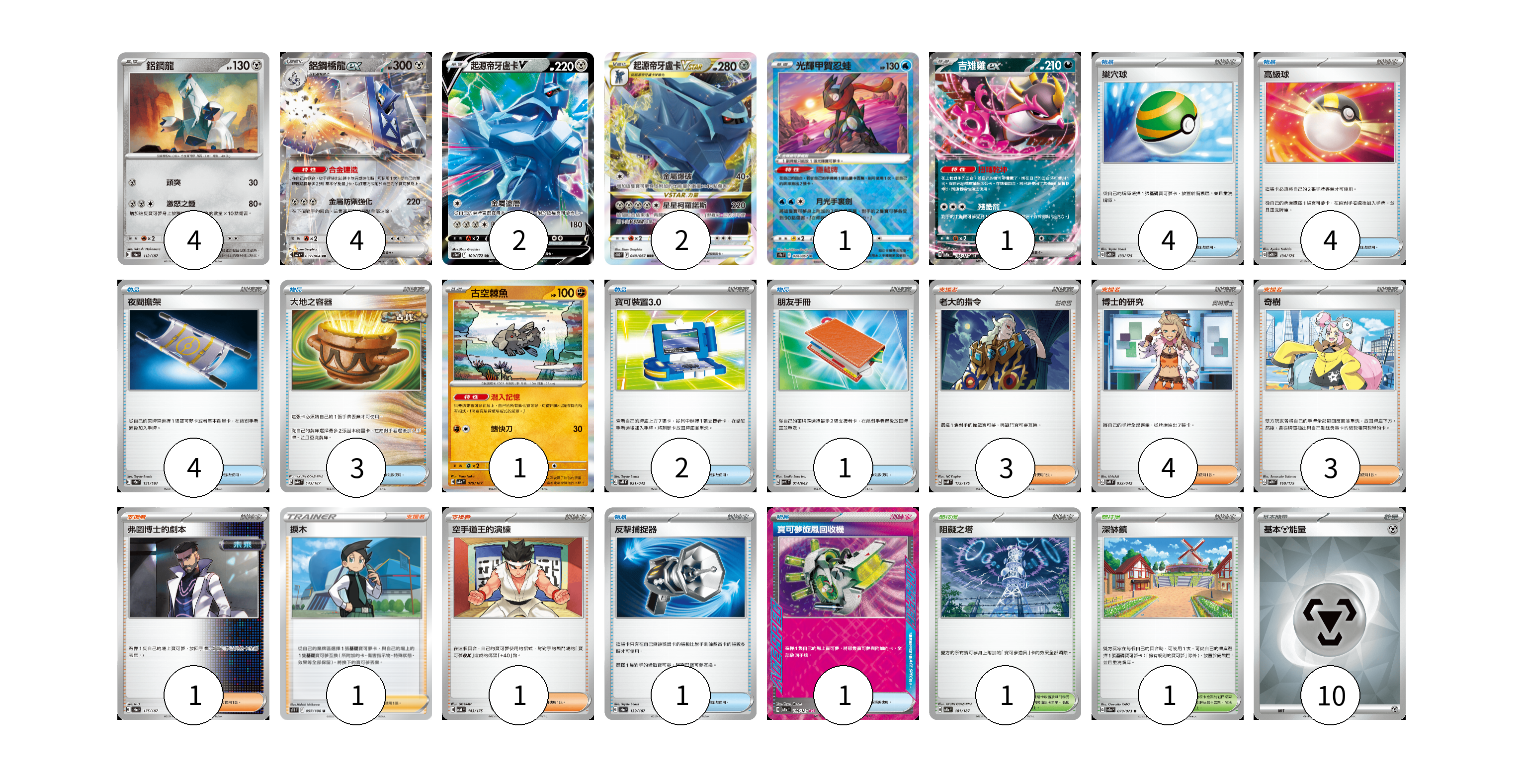 牌組構築方案 以此牌組為基礎新構築牌組 顯示卡面 顯示列表 寶可夢卡(15) 4 4 2 2 1 1 1 物品卡(20) 4 4 4 3 2 1 1 1 支援者卡(13) 3 4 3 1 1 1 競技場卡(2) 1 1 能量卡(10) 10 寶可夢卡(15) 卡牌名稱 張數 卡牌名稱 張數 鋁鋼龍 SV8a 112/187 04 鋁鋼橋龍ex SV7a 037/064 04 起源帝牙盧卡V S12a 100/172 02 起源帝牙盧卡VSTAR S10D 049/067 02 光輝甲賀忍蛙 S9a 026/067 01 吉雉雞ex SV8a 104/187 01 古空棘魚 SV8a 079/187 01 物品卡(20) 卡牌名稱 張數 卡牌名稱 張數 巢穴球 SVM 133/175 04 高級球 SVM 134/175 04 夜間擔架 SV8a 151/187 04 大地之容器 SV8a 143/187 03 寶可裝置3.0 SVK 021/042 02 朋友手冊 SVK 014/042 01 反擊捕捉器 SV8a 139/187 01 寶可夢旋風回收機 SV8a 149/187 01 支援者卡(13) 卡牌名稱 張數 卡牌名稱 張數 老大的指令 SVM 172/175 03 博士的研究 SVK 032/042 04 奇樹 SVM 160/175 03 弗圖博士的劇本 SV8a 175/187 01 捩木 S11 097/100 01 空手道王的演練 SVM 143/175 01 競技場卡(2) 卡牌名稱 張數 卡牌名稱 張數 阻礙之塔 SV8a 181/187 01 深缽鎮 SV1a 070/073 01 能量卡(10) 卡牌名稱 張數 卡牌名稱 張數 基本【鋼】能量 SVK MET 10 以此牌組為基礎新構築牌組 牌組編碼 pqXbQs-PHazOD-JHMhiU copy 列印牌組單 牌組編碼已複製 分享至SNS
