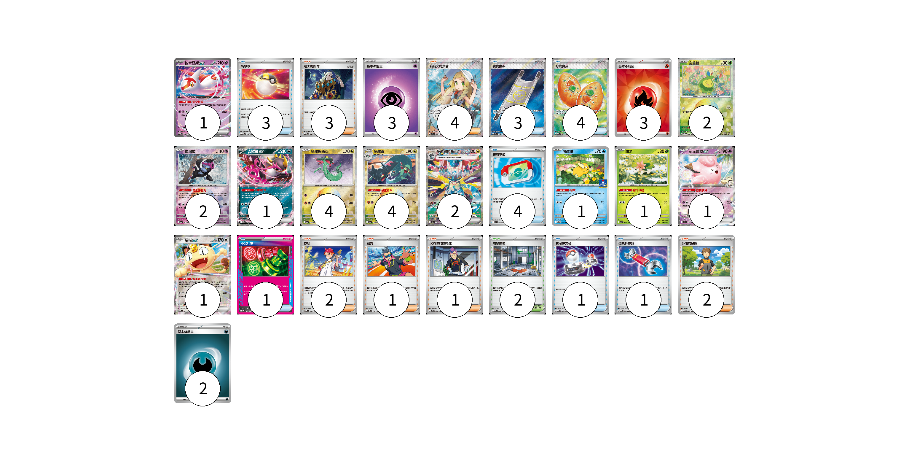 牌組構築方案 以此牌組為基礎新構築牌組 顯示卡面 顯示列表 寶可夢卡(20) 1 2 2 1 4 4 2 1 1 1 1 物品卡(17) 3 3 4 4 1 1 1 支援者卡(13) 3 4 2 1 1 2 競技場卡(2) 2 能量卡(8) 3 3 2 寶可夢卡(20) 卡牌名稱 張數 卡牌名稱 張數 拉帝亞斯ex MBD 003/022 01 含羞苞 SV8a 001/187 02 願增猿 SV8a 075/187 02 吉雉雞ex SV8a 104/187 01 多龍梅西亞 SV8a 118/187 04 多龍奇 SV8a 119/187 04 多龍巴魯托ex SV8a 221/187 02 可達鴨 SV-P 220/SV-P 01 謝米 M2a 012/193 01 莉莉艾的皮皮ex SV9 033/100 01 喵喵ex M3 061/080 01 物品卡(17) 卡牌名稱 張數 卡牌名稱 張數 高級球 MBD 014/022 03 夜間擔架 M1L 083/063 03 好友寶芬 M1S 081/063 04 寶可平板 MC 662/742 04 不公印章 MC 633/742 01 寶可夢交替 SVQP 016/023 01 道具拆除器 SV11W 080/086 01 支援者卡(13) 卡牌名稱 張數 卡牌名稱 張數 老大的指令 MBD 020/022 03 莉莉艾的決意 M1L 086/063 04 赤松 MC 696/742 02 裁判 MC 711/742 01 火箭隊的拉姆達 MC 734/742 01 小剛的發掘 SV9 096/100 02 競技場卡(2) 卡牌名稱 張數 卡牌名稱 張數 險惡廢墟 M1L 063/063 02 能量卡(8) 卡牌名稱 張數 卡牌名稱 張數 基本【超】能量 MBD PSY 03 基本【火】能量 SVQL FIR 03 基本【惡】能量 SVF DAR 02 以此牌組為基礎新構築牌組 牌組編碼 psiHRB-VjKnmh-GQkVcx copy 列印牌組單 牌組編碼已複製 分享至SNS