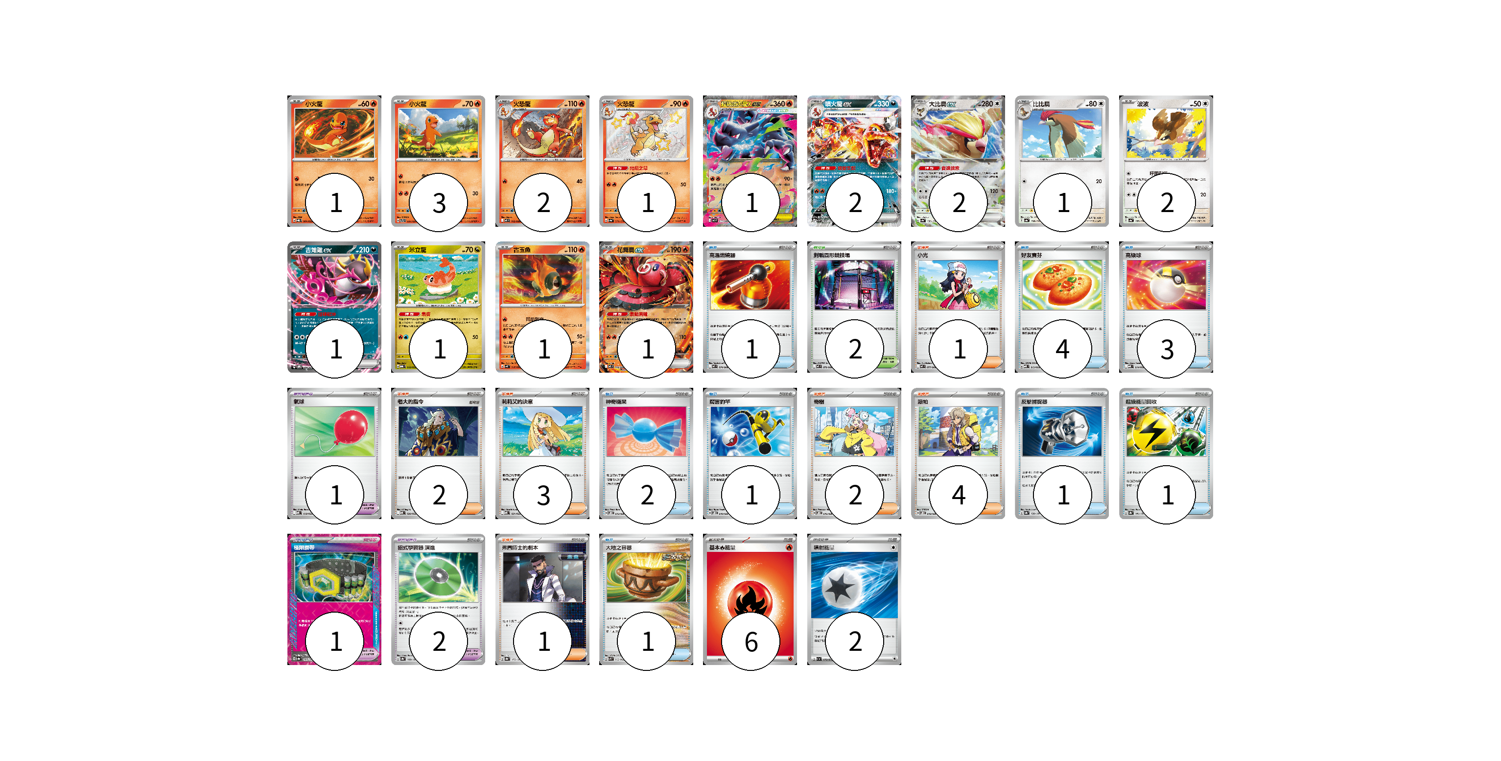 牌組構築方案 以此牌組為基礎新構築牌組 顯示卡面 顯示列表 寶可夢卡(19) 1 3 2 1 1 2 2 1 2 1 1 1 1 寶可夢道具(3) 1 2 物品卡(15) 1 4 3 1 2 1 1 1 1 支援者卡(13) 1 2 3 2 4 1 競技場卡(2) 2 能量卡(8) 6 2 寶可夢卡(19) 卡牌名稱 張數 卡牌名稱 張數 小火龍 SVQL 001/022 01 小火龍 SVTL 001/021 03 火恐龍 M2 012/080 02 火恐龍 SV4a 211/190 01 超級噴火龍Xex M2 013/080 01 噴火龍ex SV3 066/108 02 大比鳥ex SV4a 139/190 02 比比鳥 SV4a 138/190 01 波波 SV4a 137/190 02 吉雉雞ex SVOM 009/021 01 米立龍 MBG 010/022 01 古玉魚 SV4K 016/066 01 花舞鳥ex M2 018/080 01 寶可夢道具(3) 卡牌名稱 張數 卡牌名稱 張數 極限腰帶 SV8a 159/187 01 招式學習器 演進 SV8a 160/187 02 物品卡(15) 卡牌名稱 張數 卡牌名稱 張數 高溫燃燒器 M2 074/080 01 好友寶芬 MBD 013/022 04 高級球 MBD 014/022 03 氣球 MBD 018/022 01 神奇糖果 SVOD 013/020 02 厲害釣竿 SVOD 010/020 01 反擊捕捉器 SV8a 139/187 01 超級能量回收 SV8a 141/187 01 大地之容器 SVK 012/042 01 支援者卡(13) 卡牌名稱 張數 卡牌名稱 張數 小光 M2 077/080 01 老大的指令 MBD 020/022 02 莉莉艾的決意 MBD 021/022 03 奇樹 SVOD 016/020 02 派帕 SVOD 018/020 04 弗圖博士的劇本 SV8a 175/187 01 競技場卡(2) 卡牌名稱 張數 卡牌名稱 張數 對戰圓形競技場 M2 079/080 02 能量卡(8) 卡牌名稱 張數 卡牌名稱 張數 基本【火】能量 M-P FIR 06 噴射能量 SV1a 072/073 02 以此牌組為基礎新構築牌組 牌組編碼 pskRGF-UYJNVf-yGekCR copy 列印牌組單 牌組編碼已複製 分享至SNS