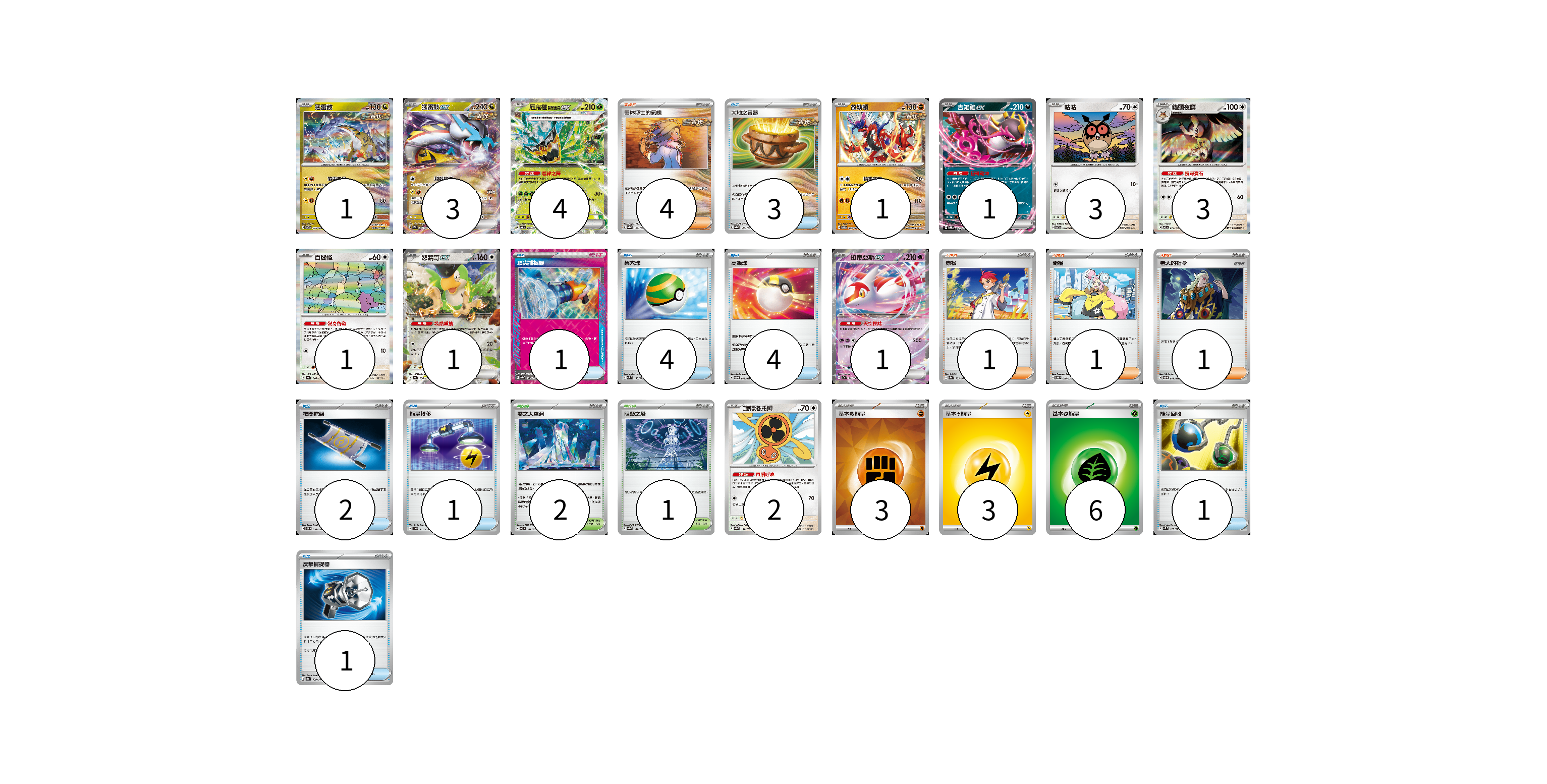 牌組構築方案 以此牌組為基礎新構築牌組 顯示卡面 顯示列表 寶可夢卡(21) 1 3 4 1 1 3 3 1 1 1 2 物品卡(17) 3 1 4 4 2 1 1 1 支援者卡(7) 4 1 1 1 競技場卡(3) 2 1 能量卡(12) 3 3 6 寶可夢卡(21) 卡牌名稱 張數 卡牌名稱 張數 猛雷鼓 SV7 075/102 01 猛雷鼓ex SV5K 053/071 03 厄鬼椪 碧草面具ex SV6 016/101 04 故勒頓 SV8 069/106 01 吉雉雞ex SVOD 004/020 01 咕咕 SV7 076/102 03 貓頭夜鷹 SV7 077/102 03 百變怪 SV4a 144/190 01 怒鸚哥ex SV4a 154/190 01 拉帝亞斯ex SV7a 019/064 01 旋轉洛托姆 SV8a 131/187 02 物品卡(17) 卡牌名稱 張數 卡牌名稱 張數 大地之容器 SV8a 143/187 03 頂尖捕捉器 SV8a 148/187 01 巢穴球 SVM 133/175 04 高級球 SVOD 012/020 04 夜間擔架 SVOM 016/021 02 能量轉移 SVD 111/139 01 能量回收 SVM 125/175 01 反擊捕捉器 SV8a 139/187 01 支援者卡(7) 卡牌名稱 張數 卡牌名稱 張數 奧琳博士的氣魄 SV8a 167/187 04 赤松 SV8a 163/187 01 奇樹 SVOD 016/020 01 老大的指令 SVOD 019/020 01 競技場卡(3) 卡牌名稱 張數 卡牌名稱 張數 零之大空洞 SV7 102/102 02 阻礙之塔 SV8a 181/187 01 能量卡(12) 卡牌名稱 張數 卡牌名稱 張數 基本【鬥】能量 SVK FIG 03 基本【雷】能量 SVHM LIG 03 基本【草】能量 SVF GRA 06 以此牌組為基礎新構築牌組 牌組編碼 ptLzxp-BQcINc-uOozOP copy 列印牌組單 牌組編碼已複製 分享至SNS