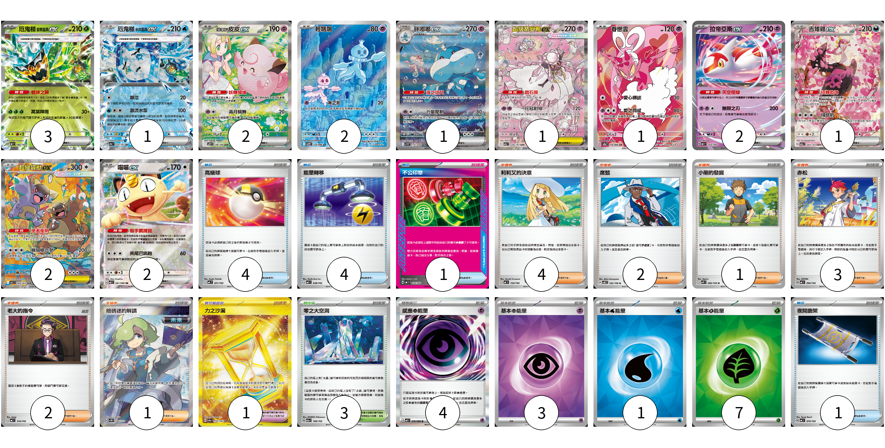 牌組構築方案 以此牌組為基礎新構築牌組 顯示卡面 顯示列表 寶可夢卡(18) 3 1 2 2 1 1 1 2 1 2 2 寶可夢道具(1) 1 物品卡(10) 4 4 1 1 支援者卡(13) 4 2 1 3 2 1 競技場卡(3) 3 能量卡(15) 4 3 1 7 寶可夢卡(18) 卡牌名稱 張數 卡牌名稱 張數 厄鬼椪 碧草面具ex MC 082/742 03 厄鬼椪 水井面具ex SV8a 050/187 01 莉莉艾的皮皮ex SV9 126/100 02 輕飄飄 SV11W 124/086 02 胖嘟嘟ex SV11W 170/086 01 超級蒂安希ex M2a 238/193 01 眷戀雲 SV5a 074/066 01 拉帝亞斯ex MC 312/742 02 吉雉雞ex M2a 244/193 01 超級袋獸ex M1S 089/063 02 喵喵ex M3 061/080 02 寶可夢道具(1) 卡牌名稱 張數 卡牌名稱 張數 力之沙漏 SV6a 094/064 01 物品卡(10) 卡牌名稱 張數 卡牌名稱 張數 高級球 MC 651/742 04 能量轉移 MC 638/742 04 不公印章 MC 633/742 01 夜間擔架 MC 670/742 01 支援者卡(13) 卡牌名稱 張數 卡牌名稱 張數 莉莉艾的決意 MC 729/742 04 席藍 SV8 102/106 02 小剛的發掘 SV9 096/100 01 赤松 MC 696/742 03 老大的指令 MC 724/742 02 暗碼迷的解讀 SV5M 090/071 01 競技場卡(3) 卡牌名稱 張數 卡牌名稱 張數 零之大空洞 M2a 184/193 03 能量卡(15) 卡牌名稱 張數 卡牌名稱 張數 感應【超】能量 M3 079/080 04 基本【超】能量 SVOD PSY 03 基本【水】能量 SVM WAT 01 基本【草】能量 SVM GRA 07 以此牌組為基礎新構築牌組 牌組編碼 qECrxO-tZdqdU-giBNRz copy 列印牌組單 牌組編碼已複製 分享至SNS