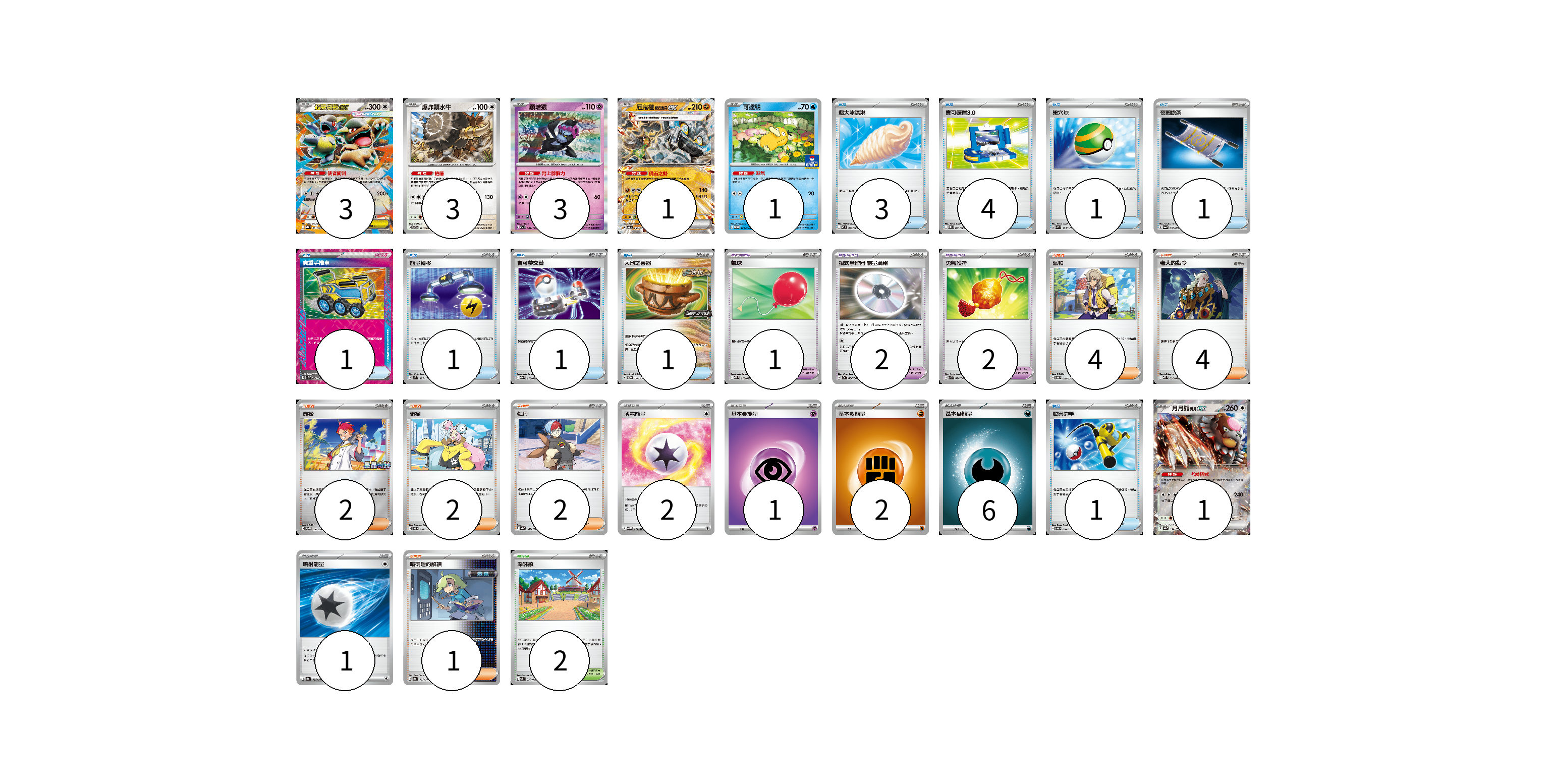 牌組構築方案 以此牌組為基礎新構築牌組 顯示卡面 顯示列表 寶可夢卡(12) 3 3 3 1 1 1 寶可夢道具(4) 2 2 物品卡(15) 3 4 1 1 1 1 1 1 1 1 支援者卡(15) 4 4 2 2 2 1 競技場卡(2) 2 能量卡(12) 2 1 2 6 1 寶可夢卡(12) 卡牌名稱 張數 卡牌名稱 張數 超級袋獸ex M1S 051/063 03 爆炸頭水牛 SV7 081/102 03 願增猿 M2a 081/193 03 厄鬼椪 礎石面具ex SV6 065/101 01 可達鴨 SV-P 220/SV-P 01 月月熊 赫月ex SV8a 134/187 01 寶可夢道具(4) 卡牌名稱 張數 卡牌名稱 張數 招式學習器 能量渦輪 SV3a 056/062 02 勇氣護符 SVK 024/042 02 物品卡(15) 卡牌名稱 張數 卡牌名稱 張數 超大冰淇淋 M2 073/080 03 寶可裝置3.0 SV11B 081/086 04 巢穴球 SVM 133/175 01 夜間擔架 SV6a 056/064 01 貴重手推車 SVK 020/042 01 能量轉移 SVM 127/175 01 寶可夢交替 MBG 015/022 01 大地之容器 SV-P 137/SV-P 01 氣球 MBD 018/022 01 厲害釣竿 SVOD 010/020 01 支援者卡(15) 卡牌名稱 張數 卡牌名稱 張數 派帕 SVOD 018/020 04 老大的指令 MBD 020/022 04 赤松 SV-P 150/SV-P 02 奇樹 SVOD 016/020 02 牡丹 SV4a 182/190 02 暗碼迷的解讀 SV8a 165/187 01 競技場卡(2) 卡牌名稱 張數 卡牌名稱 張數 深缽鎮 SVK 039/042 02 能量卡(12) 卡牌名稱 張數 卡牌名稱 張數 薄霧能量 SV5M 071/071 02 基本【超】能量 SVHM PSY 01 基本【鬥】能量 SVHK FIG 02 基本【惡】能量 MBG DAR 06 噴射能量 SV8a 185/187 01 以此牌組為基礎新構築牌組 牌組編碼 qECuvS-UUvfdF-KQHZxS copy 列印牌組單 牌組編碼已複製 分享至SNS