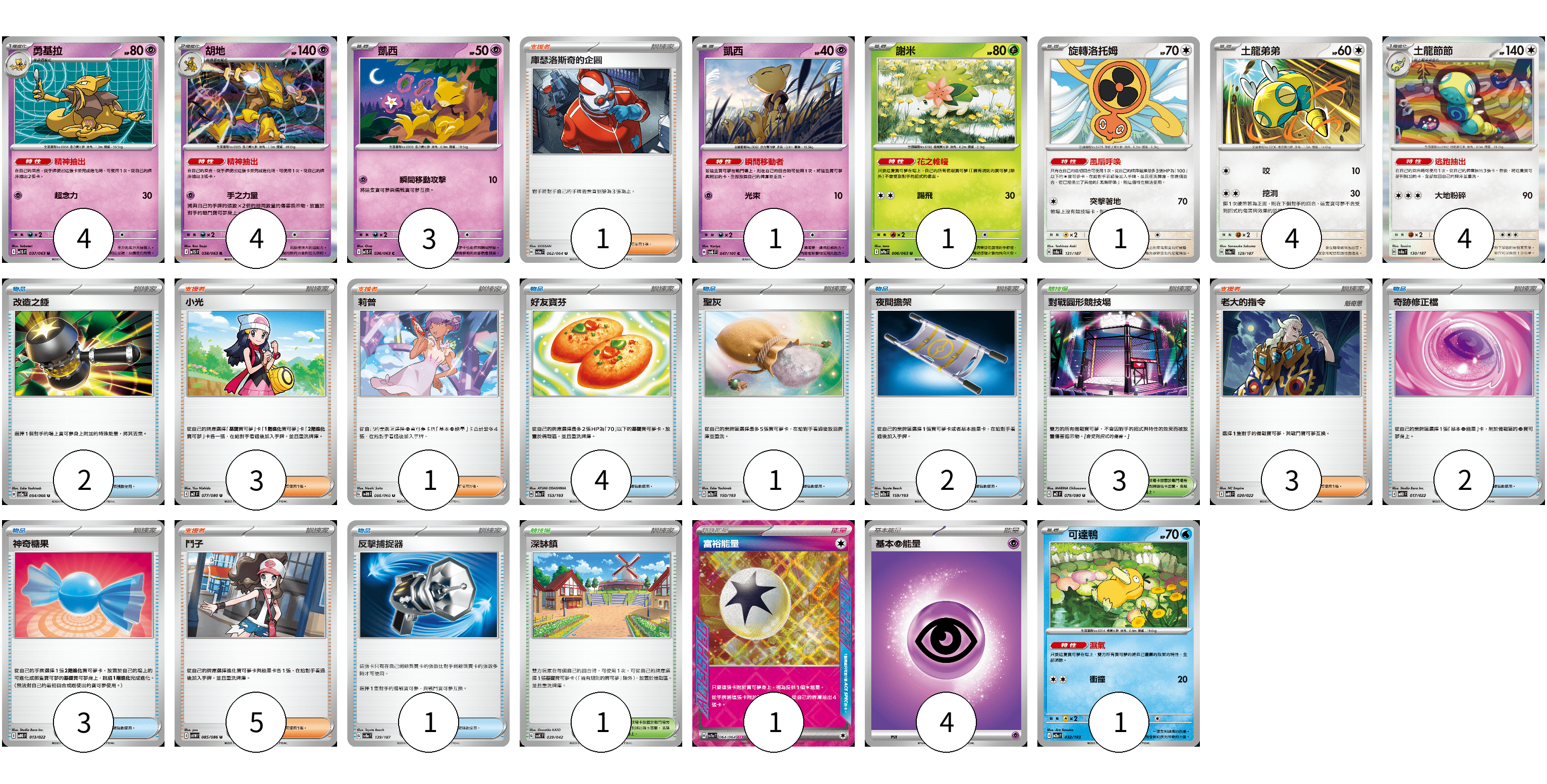 牌組構築方案 以此牌組為基礎新構築牌組 顯示卡面 顯示列表 寶可夢卡(23) 4 4 3 1 1 1 4 4 1 物品卡(15) 2 4 1 2 2 3 1 支援者卡(13) 1 3 1 3 5 競技場卡(4) 3 1 能量卡(5) 1 4 寶可夢卡(23) 卡牌名稱 張數 卡牌名稱 張數 勇基拉 M1S 037/063 04 胡地 M1S 038/063 04 凱西 M1S 036/063 03 凱西 SV6 047/101 01 謝米 SV9a 006/063 01 旋轉洛托姆 SV8a 131/187 01 土龍弟弟 SV8a 129/187 04 土龍節節 SV8a 130/187 04 可達鴨 M2a 032/193 01 物品卡(15) 卡牌名稱 張數 卡牌名稱 張數 改造之錘 SV5a 054/066 02 好友寶芬 M2a 153/193 04 聖灰 M2a 150/193 01 夜間擔架 M2a 159/193 02 奇跡修正檔 MBD 017/022 02 神奇糖果 MBG 013/022 03 反擊捕捉器 SV8a 139/187 01 支援者卡(13) 卡牌名稱 張數 卡牌名稱 張數 庫瑟洛斯奇的企圖 SV6a 062/064 01 小光 M2 077/080 03 莉普 SV4M 066/066 01 老大的指令 MBD 020/022 03 鬥子 SV11W 085/086 05 競技場卡(4) 卡牌名稱 張數 卡牌名稱 張數 對戰圓形競技場 M2 079/080 03 深缽鎮 SVK 039/042 01 能量卡(5) 卡牌名稱 張數 卡牌名稱 張數 富裕能量 SV7a 064/064 01 基本【超】能量 MBD PSY 04 以此牌組為基礎新構築牌組 牌組編碼 qEDwir-LbHamX-uCdkmL copy 列印牌組單 牌組編碼已複製 分享至SNS