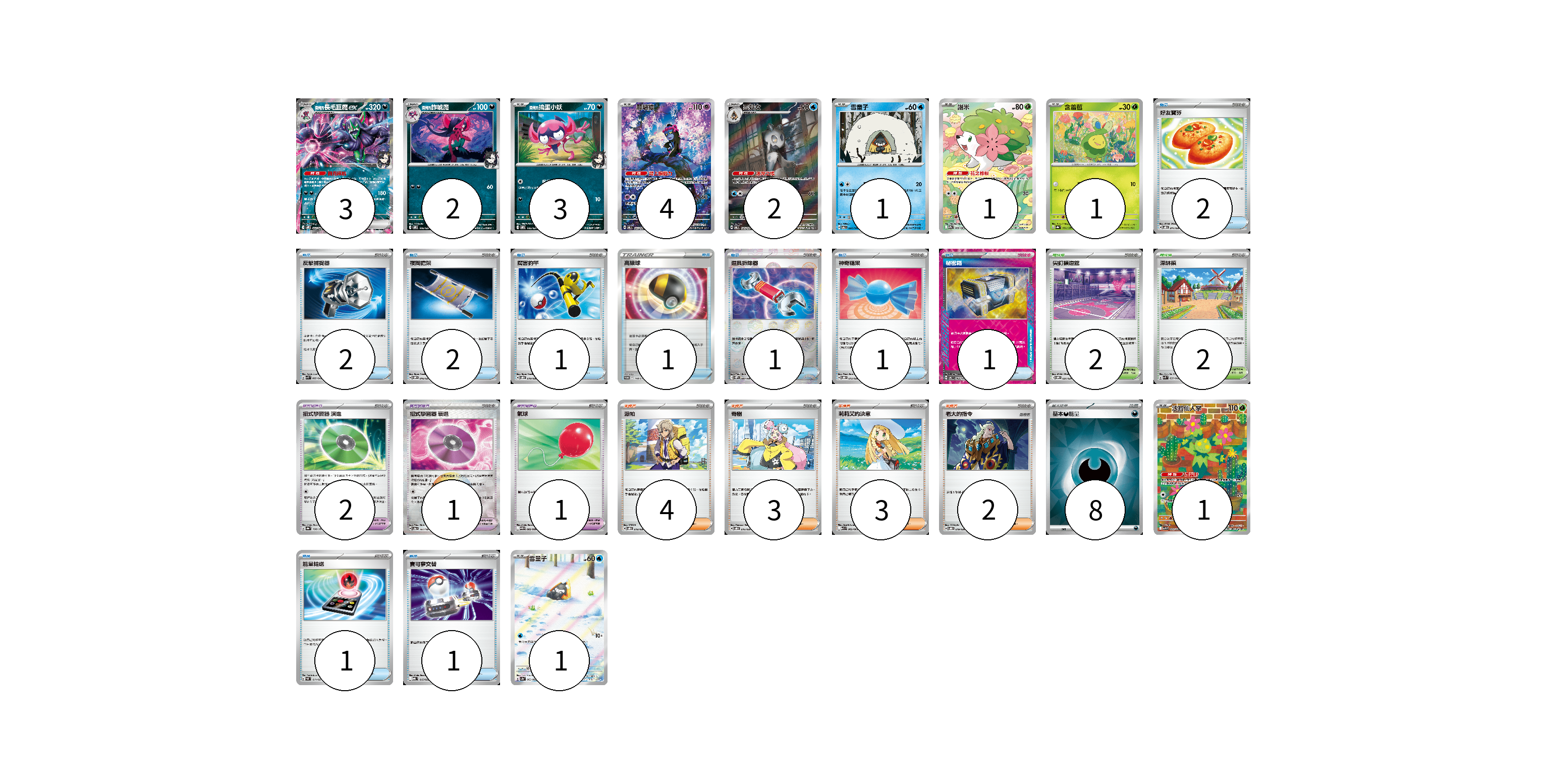 牌組構築方案 以此牌組為基礎新構築牌組 顯示卡面 顯示列表 寶可夢卡(19) 3 2 3 4 2 1 1 1 1 1 寶可夢道具(4) 2 1 1 物品卡(13) 2 2 2 1 1 1 1 1 1 1 支援者卡(12) 4 3 3 2 競技場卡(4) 2 2 能量卡(8) 8 寶可夢卡(19) 卡牌名稱 張數 卡牌名稱 張數 <瑪俐的>長毛巨魔ex SVOM 007/021 03 <瑪俐的>詐唬魔 SVOM 006/021 02 <瑪俐的>搗蛋小妖 SVOM 005/021 03 願增猿 SV6 107/101 04 雪妖女 SV6 104/101 02 雪童子 SV6 031/101 01 謝米 SV9a 066/063 01 含羞苞 SV8a 001/187 01 沙鈴仙人掌 SV9 101/100 01 雪童子 SV3a 063/062 01 寶可夢道具(4) 卡牌名稱 張數 卡牌名稱 張數 招式學習器 演進 SV8a 160/187 02 招式學習器 衰退 SV8a 161/187 01 氣球 SV11B 082/086 01 物品卡(13) 卡牌名稱 張數 卡牌名稱 張數 好友寶芬 SVOD 011/020 02 反擊捕捉器 SVK 009/042 02 夜間擔架 SVOM 016/021 02 厲害釣竿 SVOD 010/020 01 高級球 S-P 148/S-P 01 道具拆除器 SV11W 080/086 01 神奇糖果 SVOD 013/020 01 秘密箱 SV6 092/101 01 能量輸送 SVAL 011/021 01 寶可夢交替 MBG 015/022 01 支援者卡(12) 卡牌名稱 張數 卡牌名稱 張數 派帕 SVOD 018/020 04 奇樹 SVOD 016/020 03 莉莉艾的決意 M1L 062/063 03 老大的指令 SVOD 019/020 02 競技場卡(4) 卡牌名稱 張數 卡牌名稱 張數 尖釘鎮道館 SVOM 021/021 02 深缽鎮 SVK 039/042 02 能量卡(8) 卡牌名稱 張數 卡牌名稱 張數 基本【惡】能量 SVOM DAR 08 以此牌組為基礎新構築牌組 牌組編碼 qNQmxe-HDQFWs-BkTsEq copy 列印牌組單 牌組編碼已複製 分享至SNS