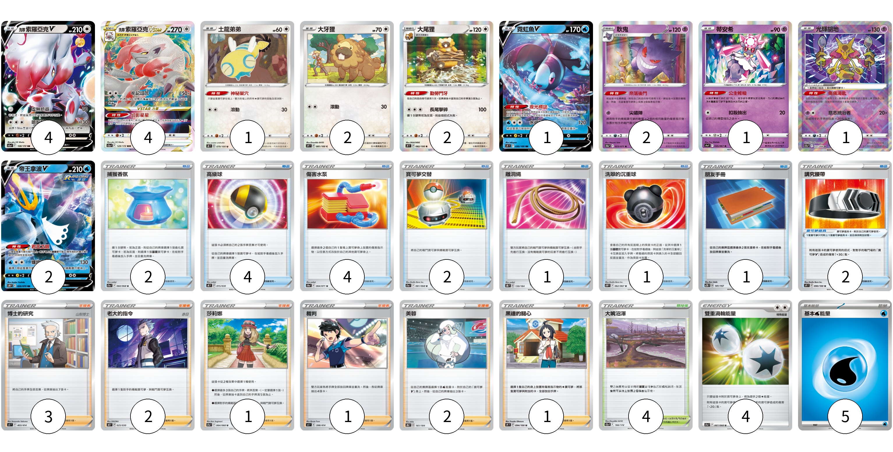 牌組構築方案 以此牌組為基礎新構築牌組 顯示卡面 顯示列表 寶可夢卡(20) 4 4 1 2 2 1 2 1 1 2 寶可夢道具(2) 2 物品卡(15) 2 4 4 2 1 1 1 支援者卡(10) 3 2 1 1 2 1 競技場卡(4) 4 能量卡(9) 4 5 寶可夢卡(20) 卡牌名稱 張數 卡牌名稱 張數 洗翠 索羅亞克V S12a 128/172 04 洗翠 索羅亞克VSTAR S12a 129/172 04 土龍弟弟 S8 079/100 01 大牙狸 S9 081/100 02 大尾狸 S9 082/100 02 霓虹魚V S9 030/100 01 耿鬼 S10a 023/071 02 蒂安希 S9a 035/067 01 光輝胡地 S11a 031/068 01 帝王拿波V S5R 026/070 02 寶可夢道具(2) 卡牌名稱 張數 卡牌名稱 張數 講究腰帶 S9 090/100 02 物品卡(15) 卡牌名稱 張數 卡牌名稱 張數 捕獲香氛 S11a 060/068 02 高級球 SK 015/030 04 傷害水泵 S10a 064/071 04 寶可夢交替 S11a 061/068 02 離洞繩 S8b 130/184 01 洗翠的沉重球 S10P 062/067 01 朋友手冊 SC2D 141/157 01 支援者卡(10) 卡牌名稱 張數 卡牌名稱 張數 博士的研究(山梨博士) SI 403/414 03 老大的指令(赤日) SK 025/030 02 莎莉娜 S11a 064/068 01 裁判 SI 398/414 01 美蓉 S8b 161/184 02 黑連的關心 S9 094/100 01 競技場卡(4) 卡牌名稱 張數 卡牌名稱 張數 大嘴沼澤 S12a 166/172 04 能量卡(9) 卡牌名稱 張數 卡牌名稱 張數 雙重渦輪能量 S11a 067/068 04 基本水能量 sv-p WAT 05 以此牌組為基礎新構築牌組 牌組編碼 qRAMlG-EBWbOa-tjOfLJ copy 列印牌組單 牌組編碼已複製 分享至SNS