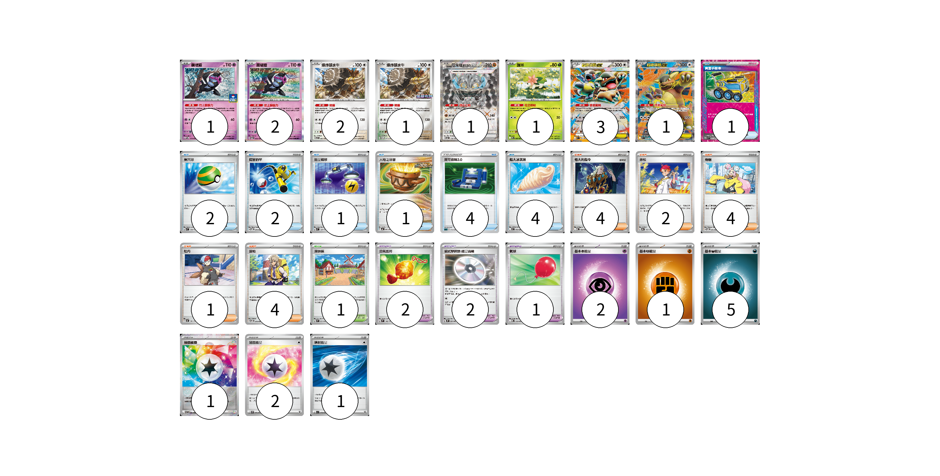 牌組構築方案 以此牌組為基礎新構築牌組 顯示卡面 顯示列表 寶可夢卡(12) 1 2 2 1 1 1 3 1 寶可夢道具(5) 2 2 1 物品卡(15) 1 2 2 1 1 4 4 支援者卡(15) 4 2 4 1 4 競技場卡(1) 1 能量卡(12) 2 1 5 1 2 1 寶可夢卡(12) 卡牌名稱 張數 卡牌名稱 張數 願增猿 M-P 014/M-P 01 願增猿 SV6 055/101 02 爆炸頭水牛 SV7 081/102 02 爆炸頭水牛 SV-P 147/SV-P 01 厄鬼椪 礎石面具ex SV6 119/101 01 謝米 SV9a 006/063 01 超級袋獸ex M1S 051/063 03 超級袋獸ex M1S 080/063 01 寶可夢道具(5) 卡牌名稱 張數 卡牌名稱 張數 勇氣護符 SVM 142/175 02 招式學習器 能量渦輪 SV3a 056/062 02 氣球 MBG 019/022 01 物品卡(15) 卡牌名稱 張數 卡牌名稱 張數 貴重手推車 SVK 020/042 01 巢穴球 SVM 133/175 02 厲害釣竿 SVOD 010/020 02 能量轉移 SVM 127/175 01 大地之容器 SV4K 060/066 01 寶可齒輪3.0 SLD 014/020 04 超大冰淇淋 M2 073/080 04 支援者卡(15) 卡牌名稱 張數 卡牌名稱 張數 老大的指令 MBD 020/022 04 赤松 SV8a 163/187 02 奇樹 SVOD 016/020 04 牡丹 SV4a 182/190 01 派帕 SVOD 018/020 04 競技場卡(1) 卡牌名稱 張數 卡牌名稱 張數 深缽鎮 SVK 039/042 01 能量卡(12) 卡牌名稱 張數 卡牌名稱 張數 基本【超】能量 MBD PSY 02 基本【鬥】能量 M-P FIG 01 基本【惡】能量 M-P DAR 05 稜鏡能量 SV11B 086/086 01 薄霧能量 SV5M 071/071 02 噴射能量 SV1a 072/073 01 以此牌組為基礎新構築牌組 牌組編碼 qTGvGg-qfADuZ-fesKfB copy 列印牌組單 牌組編碼已複製 分享至SNS