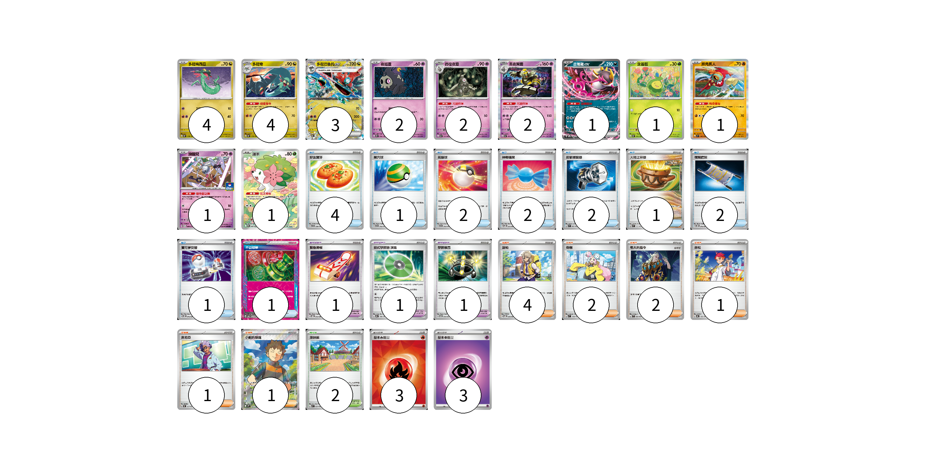 牌組構築方案 以此牌組為基礎新構築牌組 顯示卡面 顯示列表 寶可夢卡(22) 4 4 3 2 2 2 1 1 1 1 1 寶可夢道具(3) 1 1 1 物品卡(16) 4 1 2 2 2 1 2 1 1 支援者卡(11) 4 2 2 1 1 1 競技場卡(2) 2 能量卡(6) 3 3 寶可夢卡(22) 卡牌名稱 張數 卡牌名稱 張數 多龍梅西亞 SV8a 118/187 04 多龍奇 SV8a 119/187 04 多龍巴魯托ex SV8a 120/187 03 夜巡靈 SV8a 064/187 02 彷徨夜靈 SV6a 019/064 02 黑夜魔靈 SV6a 020/064 02 吉雉雞ex SVOM 009/021 01 含羞苞 SV8a 001/187 01 摔角鷹人 SV1S 045/078 01 鑰圈兒 SV-P 089/SV-P 01 謝米 SV9a 066/063 01 寶可夢道具(3) 卡牌名稱 張數 卡牌名稱 張數 緊急滑板 SVOD 015/020 01 招式學習器 演進 SV8a 160/187 01 學習裝置 SVTM 016/022 01 物品卡(16) 卡牌名稱 張數 卡牌名稱 張數 好友寶芬 SVTH 009/018 04 巢穴球 SVTG 012/019 01 高級球 SVTG 013/019 02 神奇糖果 SVOD 013/020 02 反擊捕捉器 SVK 009/042 02 大地之容器 SVK 012/042 01 夜間擔架 SVOM 016/021 02 寶可夢交替 SVOM 015/021 01 不公印章 SV5a 053/066 01 支援者卡(11) 卡牌名稱 張數 卡牌名稱 張數 派帕 SVOD 018/020 04 奇樹 SVM 160/175 02 老大的指令 SVHM 022/022 02 赤松 SV8a 163/187 01 吉尼亞 SVAL 017/021 01 小剛的發掘 SV9 123/100 01 競技場卡(2) 卡牌名稱 張數 卡牌名稱 張數 深缽鎮 SVK 039/042 02 能量卡(6) 卡牌名稱 張數 卡牌名稱 張數 基本【火】能量 SVK FIR 03 基本【超】能量 SVTS PSY 03 以此牌組為基礎新構築牌組 牌組編碼 qTxJku-HmooZx-nDdlHi copy 列印牌組單 牌組編碼已複製 分享至SNS