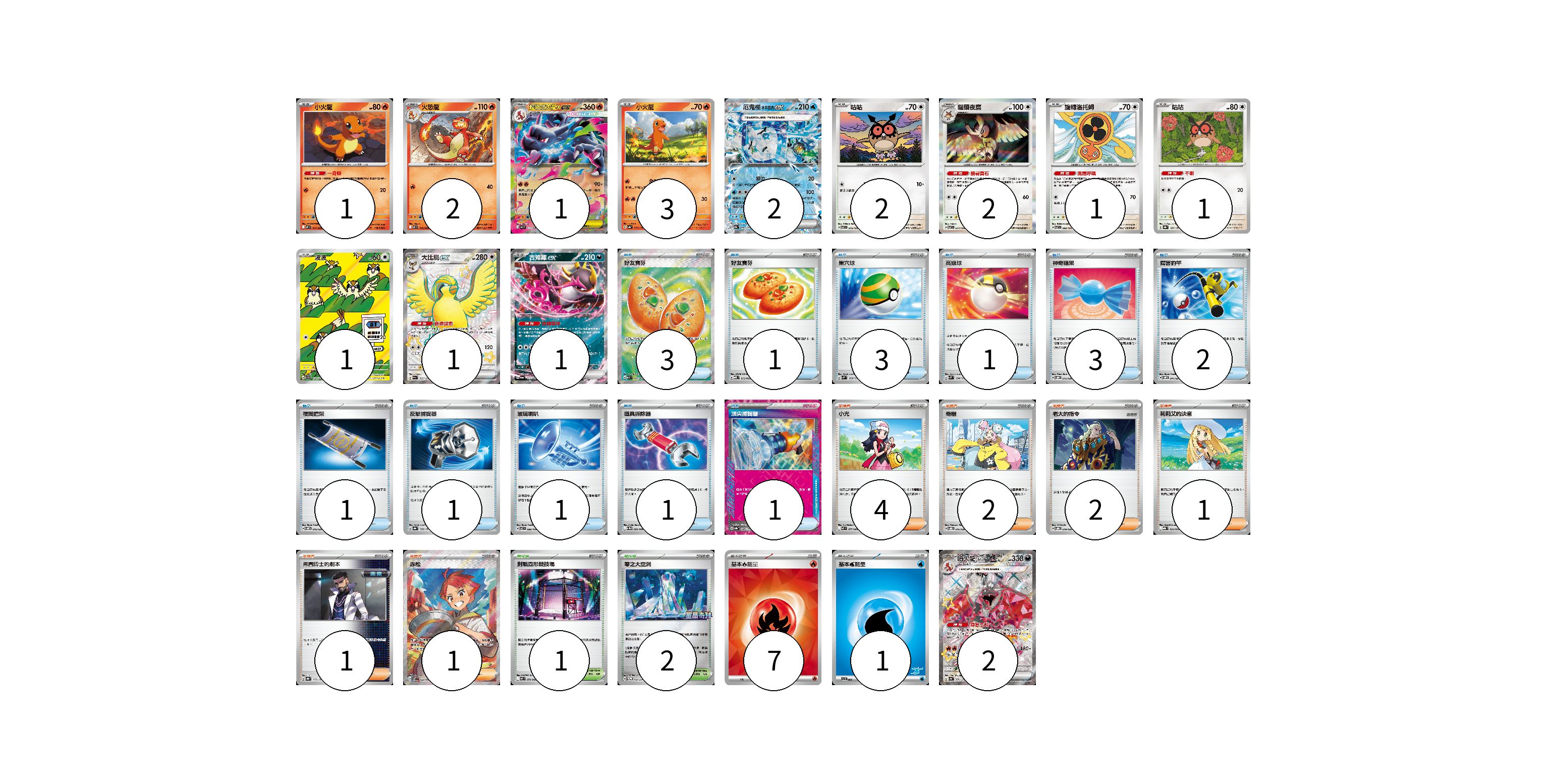 牌組構築方案 以此牌組為基礎新構築牌組 顯示卡面 顯示列表 寶可夢卡(20) 1 2 1 3 2 2 2 1 1 1 1 1 2 物品卡(18) 3 1 3 1 3 2 1 1 1 1 1 支援者卡(11) 4 2 2 1 1 1 競技場卡(3) 1 2 能量卡(8) 7 1 寶可夢卡(20) 卡牌名稱 張數 卡牌名稱 張數 小火龍 M2 011/080 01 火恐龍 M2 012/080 02 超級噴火龍Xex M2 013/080 01 小火龍 SV4a 025/190 03 厄鬼椪 水井面具ex SV8a 050/187 02 咕咕 SV7 076/102 02 貓頭夜鷹 SV7 077/102 02 旋轉洛托姆 SV7 080/102 01 咕咕 SV8a 127/187 01 波波 SV3 118/108 01 大比鳥ex SV4a 335/190 01 吉雉雞ex SV6a 038/064 01 噴火龍ex SV4a 331/190 02 物品卡(18) 卡牌名稱 張數 卡牌名稱 張數 好友寶芬 M1S 081/063 03 好友寶芬 MBD 013/022 01 巢穴球 SVM 133/175 03 高級球 SVM 134/175 01 神奇糖果 SVOD 013/020 03 厲害釣竿 SVOM 011/021 02 夜間擔架 SVOM 016/021 01 反擊捕捉器 SV8a 139/187 01 玻璃喇叭 SV7 089/102 01 道具拆除器 SV11W 080/086 01 頂尖捕捉器 SV8a 148/187 01 支援者卡(11) 卡牌名稱 張數 卡牌名稱 張數 小光 M2 077/080 04 奇樹 SVOD 016/020 02 老大的指令 SVOD 019/020 02 莉莉艾的決意 MBG 022/022 01 弗圖博士的劇本 SV8a 175/187 01 赤松 SV7 123/102 01 競技場卡(3) 卡牌名稱 張數 卡牌名稱 張數 對戰圓形競技場 M2 079/080 01 零之大空洞 SV-P 151/SV-P 02 能量卡(8) 卡牌名稱 張數 卡牌名稱 張數 基本【火】能量 SVQL FIR 07 基本【水】能量 SVI WAT 01 以此牌組為基礎新構築牌組 牌組編碼 qVAeNy-gswXxD-pfikJp copy 列印牌組單 牌組編碼已複製 分享至SNS