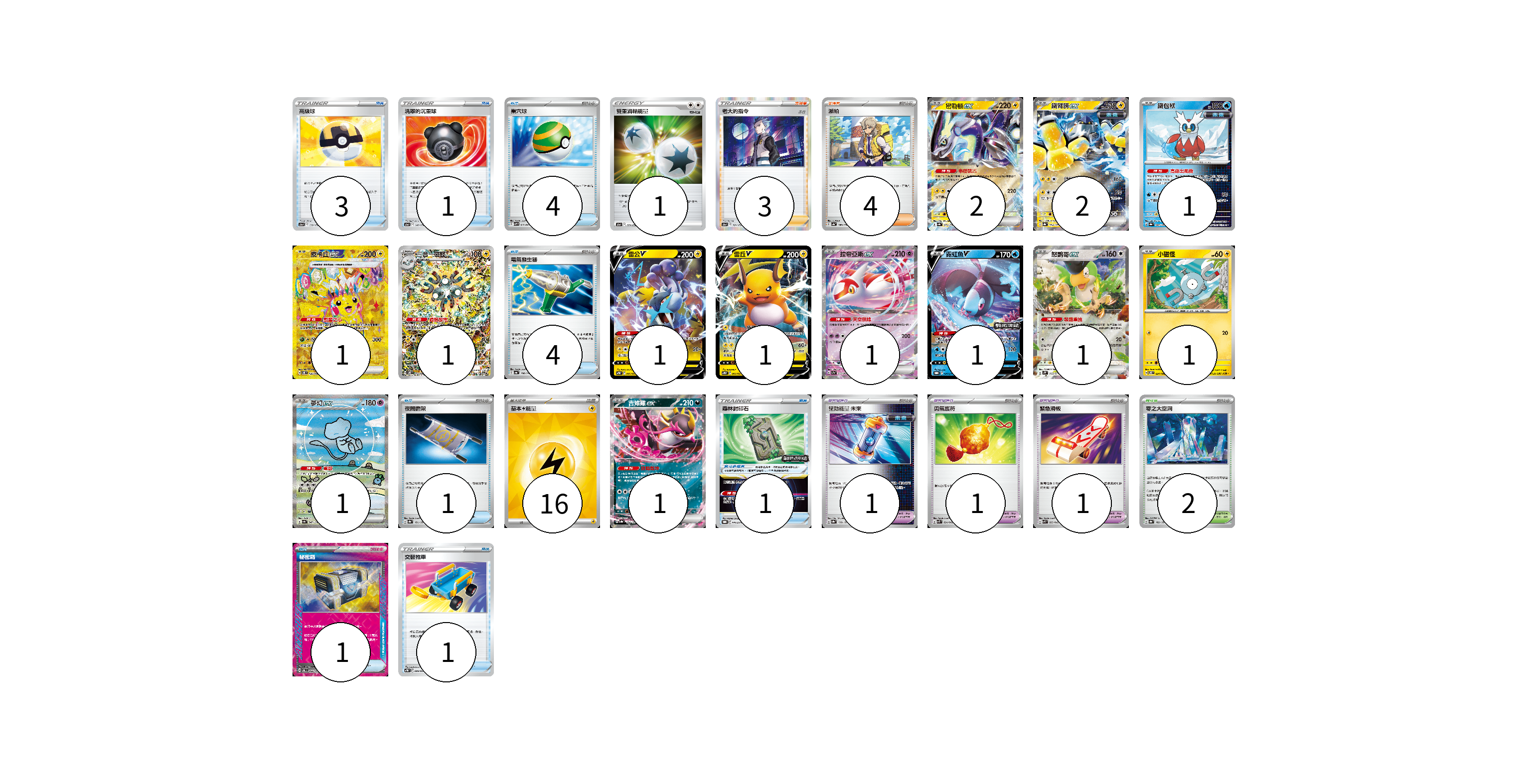 牌組構築方案 以此牌組為基礎新構築牌組 顯示卡面 顯示列表 寶可夢卡(15) 2 2 1 1 1 1 1 1 1 1 1 1 1 寶可夢道具(4) 1 1 1 1 物品卡(15) 3 1 4 4 1 1 1 支援者卡(7) 3 4 競技場卡(2) 2 能量卡(17) 1 16 寶可夢卡(15) 卡牌名稱 張數 卡牌名稱 張數 密勒頓ex SV4a 071/190 02 鐵臂膀ex SV8a 054/187 02 鐵包袱 SV8a 047/187 01 皮卡丘ex SV8 136/106 01 三合一磁怪 SV8 112/106 01 雷公V SVTR 005/021 01 雷丘V SVTR 003/021 01 拉帝亞斯ex SV7a 019/064 01 霓虹魚V SV-P 134/SV-P 01 怒鸚哥ex SV2P 065/071 01 小磁怪 SV8 034/106 01 夢幻ex SV4a 347/190 01 吉雉雞ex SV8a 104/187 01 寶可夢道具(4) 卡牌名稱 張數 卡牌名稱 張數 森林封印石 SV-P 141/SV-P 01 驅勁能量 未來 SV8a 158/187 01 勇氣護符 SVK 024/042 01 緊急滑板 SVK 023/042 01 物品卡(15) 卡牌名稱 張數 卡牌名稱 張數 高級球 S12a 138/172 03 洗翠的沉重球 S12a 140/172 01 巢穴球 SVHM 012/022 04 電氣發生器 SV4a 156/190 04 夜間擔架 SV8a 151/187 01 秘密箱 SV6 092/101 01 交替推車 SVTR 009/021 01 支援者卡(7) 卡牌名稱 張數 卡牌名稱 張數 老大的指令(赤日) S12a 161/172 03 派帕 SV4a 180/190 04 競技場卡(2) 卡牌名稱 張數 卡牌名稱 張數 零之大空洞 SV8a 182/187 02 能量卡(17) 卡牌名稱 張數 卡牌名稱 張數 雙重渦輪能量 S12a 171/172 01 基本【雷】能量 SVK LIG 16 以此牌組為基礎新構築牌組 牌組編碼 qZoKvo-wUaVcb-hOVEaq copy 列印牌組單 牌組編碼已複製 分享至SNS