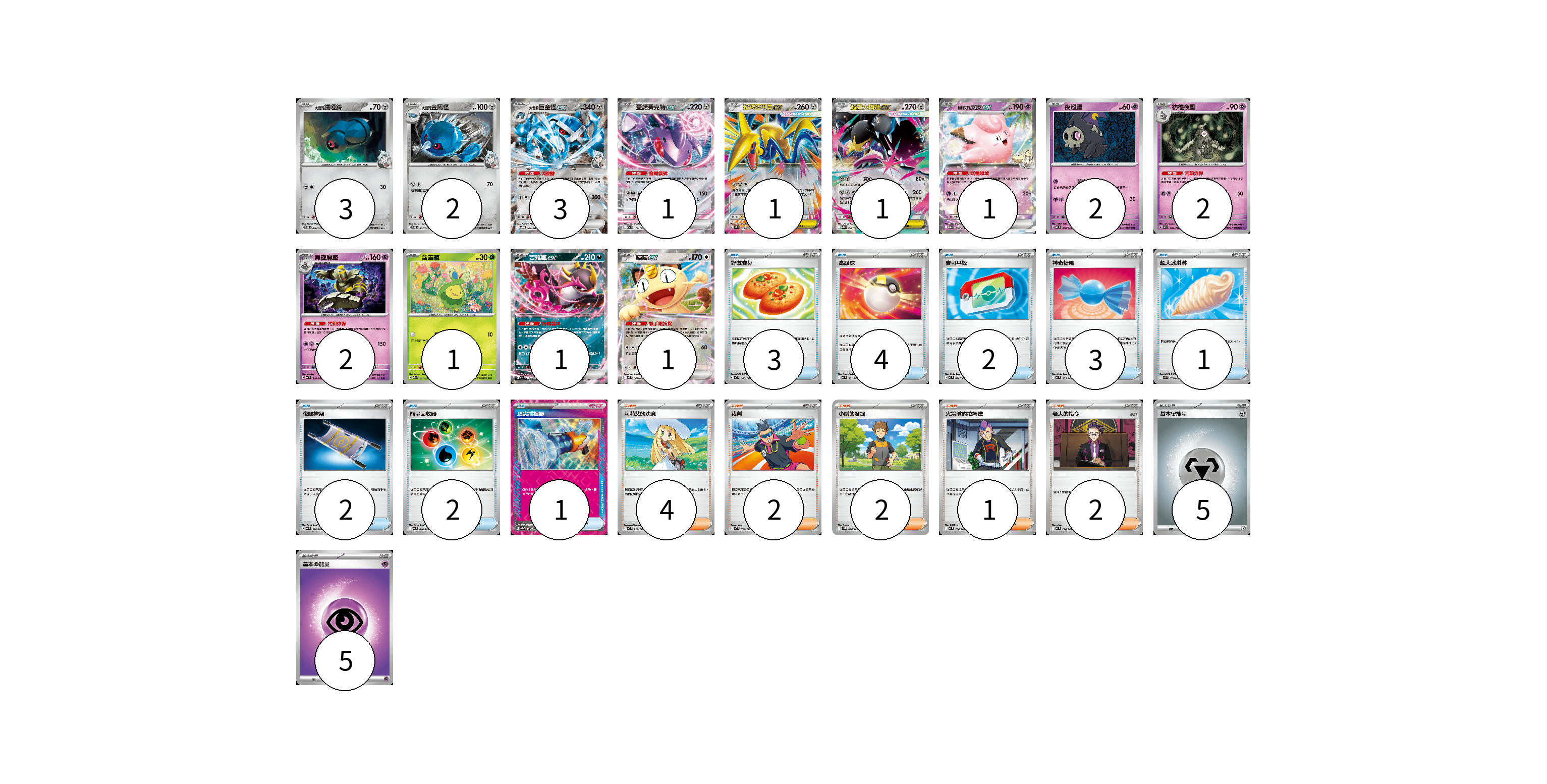 牌組構築方案 以此牌組為基礎新構築牌組 顯示卡面 顯示列表 寶可夢卡(21) 3 2 3 1 1 1 1 2 2 2 1 1 1 物品卡(18) 3 4 2 3 1 2 2 1 支援者卡(11) 4 2 2 1 2 能量卡(10) 5 5 寶可夢卡(21) 卡牌名稱 張數 卡牌名稱 張數 <大吾的>鐵啞鈴 SVOD 006/020 03 <大吾的>金屬怪 SVOD 007/020 02 <大吾的>巨金怪ex SVOD 008/020 03 蓋諾賽克特ex M2a 119/193 01 超級盔甲鳥ex M3 054/080 01 超級大嘴娃ex M1L 046/063 01 莉莉艾的皮皮ex M2a 060/193 01 夜巡靈 MC 308/742 02 彷徨夜靈 MC 309/742 02 黑夜魔靈 MC 310/742 02 含羞苞 M2a 011/193 01 吉雉雞ex M2a 114/193 01 喵喵ex M3 061/080 01 物品卡(18) 卡牌名稱 張數 卡牌名稱 張數 好友寶芬 MC 648/742 03 高級球 MC 651/742 04 寶可平板 M3 070/080 02 神奇糖果 MC 655/742 03 超大冰淇淋 M2 073/080 01 夜間擔架 MC 670/742 02 能量回收器 MC 640/742 02 頂尖捕捉器 SV8a 148/187 01 支援者卡(11) 卡牌名稱 張數 卡牌名稱 張數 莉莉艾的決意 MC 729/742 04 裁判 MC 711/742 02 小剛的發掘 SV9 096/100 02 火箭隊的拉姆達 MC 734/742 01 老大的指令 MC 724/742 02 能量卡(10) 卡牌名稱 張數 卡牌名稱 張數 基本【鋼】能量 MC MET 05 基本【超】能量 MC PSY 05 以此牌組為基礎新構築牌組 牌組編碼 qaCGHe-QDeVJh-PwLsaI copy 列印牌組單 牌組編碼已複製 分享至SNS