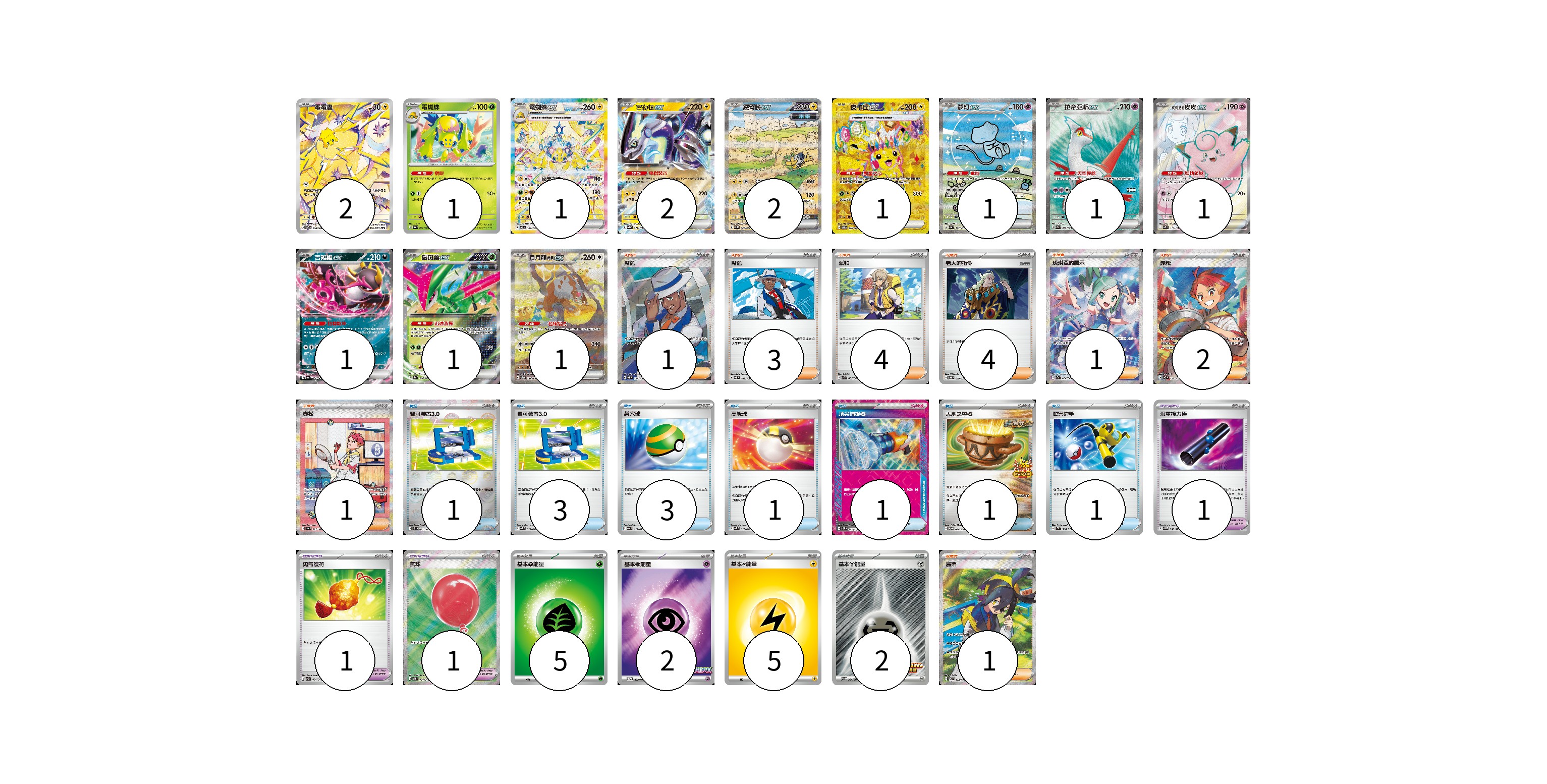 牌組構築方案 以此牌組為基礎新構築牌組 顯示卡面 顯示列表 寶可夢卡(15) 2 1 1 2 2 1 1 1 1 1 1 1 寶可夢道具(3) 1 1 1 物品卡(11) 1 3 3 1 1 1 1 支援者卡(17) 1 3 4 4 1 2 1 1 能量卡(14) 5 2 5 2 寶可夢卡(15) 卡牌名稱 張數 卡牌名稱 張數 電電蟲 SV7 108/102 02 電蜘蛛 SV6a 002/064 01 電蜘蛛ex SV7 128/102 01 密勒頓ex SV4a 071/190 02 鐵臂膀ex SV4M 088/066 02 皮卡丘ex SV8 136/106 01 夢幻ex SV4a 347/190 01 拉帝亞斯ex SV7a 078/064 01 莉莉艾的皮皮ex SV9 115/100 01 吉雉雞ex SV6a 038/064 01 鐵斑葉ex SV8a 016/187 01 月月熊 赫月 ex SV5a 091/066 01 寶可夢道具(3) 卡牌名稱 張數 卡牌名稱 張數 沉重接力棒 SV5M 066/071 01 勇氣護符 SVK 024/042 01 氣球 M1L 084/063 01 物品卡(11) 卡牌名稱 張數 卡牌名稱 張數 寶可裝置3.0 SV11B 081/086 01 寶可裝置3.0 SVK 021/042 03 巢穴球 SVAL 012/021 03 高級球 SVK 018/042 01 頂尖捕捉器 SV5M 062/071 01 大地之容器 SV-P 084/SV-P 01 厲害釣竿 SV2P 066/071 01 支援者卡(17) 卡牌名稱 張數 卡牌名稱 張數 席藍 SV8 127/106 01 席藍 SV8 102/106 03 派帕 SVK 035/042 04 老大的指令 SVOD 019/020 04 琉琪亞的展示 SV7a 086/064 01 赤松 SV7 123/102 02 赤松 SV8a 227/187 01 烏栗 SV6 122/101 01 能量卡(14) 卡牌名稱 張數 卡牌名稱 張數 基本【草】能量 M-P GRA 05 基本【超】能量 M-P 033/M-P 02 基本【雷】能量 SVAL LIG 05 基本【鋼】能量 SV-P 264/SV-P 02 以此牌組為基礎新構築牌組 牌組編碼 qcBcGq-qvsNUf-Thlelg copy 列印牌組單 牌組編碼已複製 分享至SNS