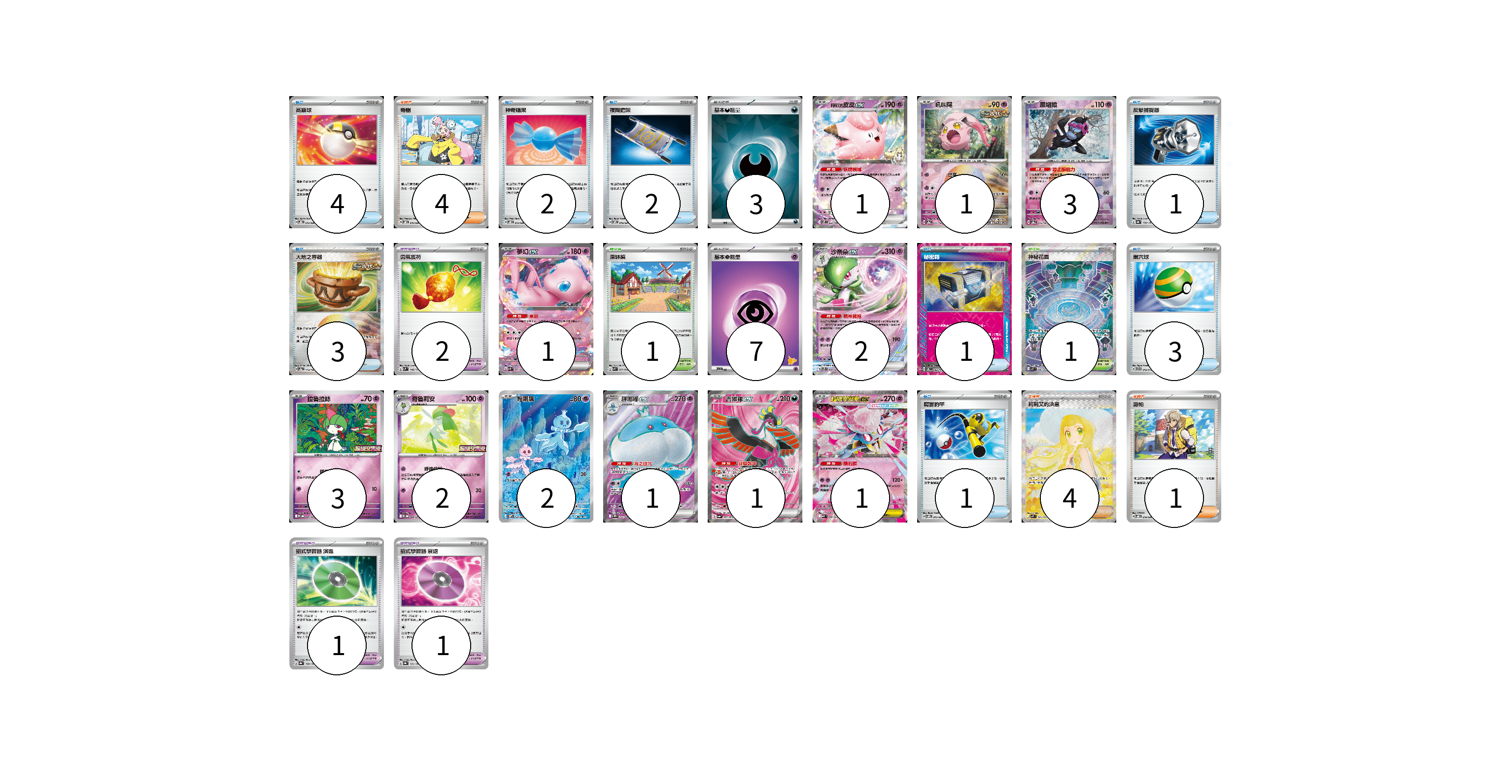 牌組構築方案 以此牌組為基礎新構築牌組 顯示卡面 顯示列表 寶可夢卡(18) 1 1 3 1 2 3 2 2 1 1 1 寶可夢道具(4) 2 1 1 物品卡(17) 4 2 2 1 3 1 3 1 支援者卡(9) 4 4 1 競技場卡(2) 1 1 能量卡(10) 3 7 寶可夢卡(18) 卡牌名稱 張數 卡牌名稱 張數 莉莉艾的皮皮ex SV9 033/100 01 吼叫尾 SV8a 071/187 01 願增猿 SV8a 075/187 03 夢幻ex SVK 001/042 01 沙奈朵ex SVTS 004/022 02 拉魯拉絲 M-P 005/M-P 03 奇魯莉安 M-P 006/M-P 02 輕飄飄 SV11W 124/086 02 胖嘟嘟ex SV11W 162/086 01 吉雉雞ex SV6a 081/064 01 超級蒂安希ex MBD 006/022 01 寶可夢道具(4) 卡牌名稱 張數 卡牌名稱 張數 勇氣護符 SVM 142/175 02 招式學習器 演進 SV8a 160/187 01 招式學習器 衰退 SV8a 161/187 01 物品卡(17) 卡牌名稱 張數 卡牌名稱 張數 高級球 SVOD 012/020 04 神奇糖果 SVOD 013/020 02 夜間擔架 SVOM 016/021 02 反擊捕捉器 SV8a 139/187 01 大地之容器 SV8a 143/187 03 秘密箱 SV6 092/101 01 巢穴球 SVTG 012/019 03 厲害釣竿 SVOM 011/021 01 支援者卡(9) 卡牌名稱 張數 卡牌名稱 張數 奇樹 SVOD 016/020 04 莉莉艾的決意 M1L 091/063 04 派帕 SVOD 018/020 01 競技場卡(2) 卡牌名稱 張數 卡牌名稱 張數 深缽鎮 SVK 039/042 01 神秘花園 M1S 086/063 01 能量卡(10) 卡牌名稱 張數 卡牌名稱 張數 基本【惡】能量 SVOM DAR 03 基本【超】能量 SVI PSY 07 以此牌組為基礎新構築牌組 牌組編碼 qcdAoO-PIoRel-YWDohD copy 列印牌組單 牌組編碼已複製 分享至SNS