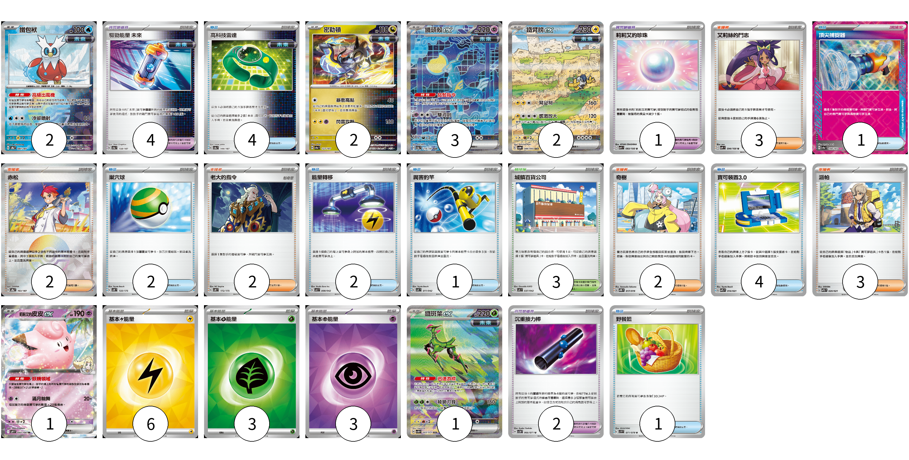 牌組構築方案 以此牌組為基礎新構築牌組 顯示卡面 顯示列表 寶可夢卡(11) 2 2 3 2 1 1 寶可夢道具(7) 4 1 2 物品卡(15) 4 1 2 2 1 4 1 支援者卡(12) 3 2 2 2 3 競技場卡(3) 3 能量卡(12) 6 3 3 寶可夢卡(11) 卡牌名稱 張數 卡牌名稱 張數 鐵包袱 SV8a 047/187 02 密勒頓 SV8a 123/187 02 鐵頭殼ex SV8a 214/187 03 鐵臂膀ex SV4M 088/066 02 莉莉艾的皮皮ex SV9 033/100 01 鐵斑葉ex SV5M 093/071 01 寶可夢道具(7) 卡牌名稱 張數 卡牌名稱 張數 驅勁能量 未來 SV8a 158/187 04 莉莉艾的珍珠 SV9 093/100 01 沉重接力棒 SV5M 066/071 02 物品卡(15) 卡牌名稱 張數 卡牌名稱 張數 高科技雷達 SV8a 144/187 04 頂尖捕捉器 SV8a 148/187 01 巢穴球 SVM 133/175 02 能量轉移 SVK 008/042 02 厲害釣竿 SVK 011/042 01 寶可裝置3.0 SVTL 014/021 04 野餐籃 SV1V 071/078 01 支援者卡(12) 卡牌名稱 張數 卡牌名稱 張數 艾莉絲的鬥志 SV9 094/100 03 赤松 SV8a 163/187 02 老大的指令 SVM 172/175 02 奇樹 SVTG 017/019 02 派帕 SVTL 020/021 03 競技場卡(3) 卡牌名稱 張數 卡牌名稱 張數 城鎮百貨公司 SVK 037/042 03 能量卡(12) 卡牌名稱 張數 卡牌名稱 張數 基本【雷】能量 SVK LIG 06 基本【草】能量 SVK GRA 03 基本【超】能量 SVK PSY 03 以此牌組為基礎新構築牌組 牌組編碼 qcotVc-itNPhi-MPVlUK copy 列印牌組單 牌組編碼已複製 分享至SNS