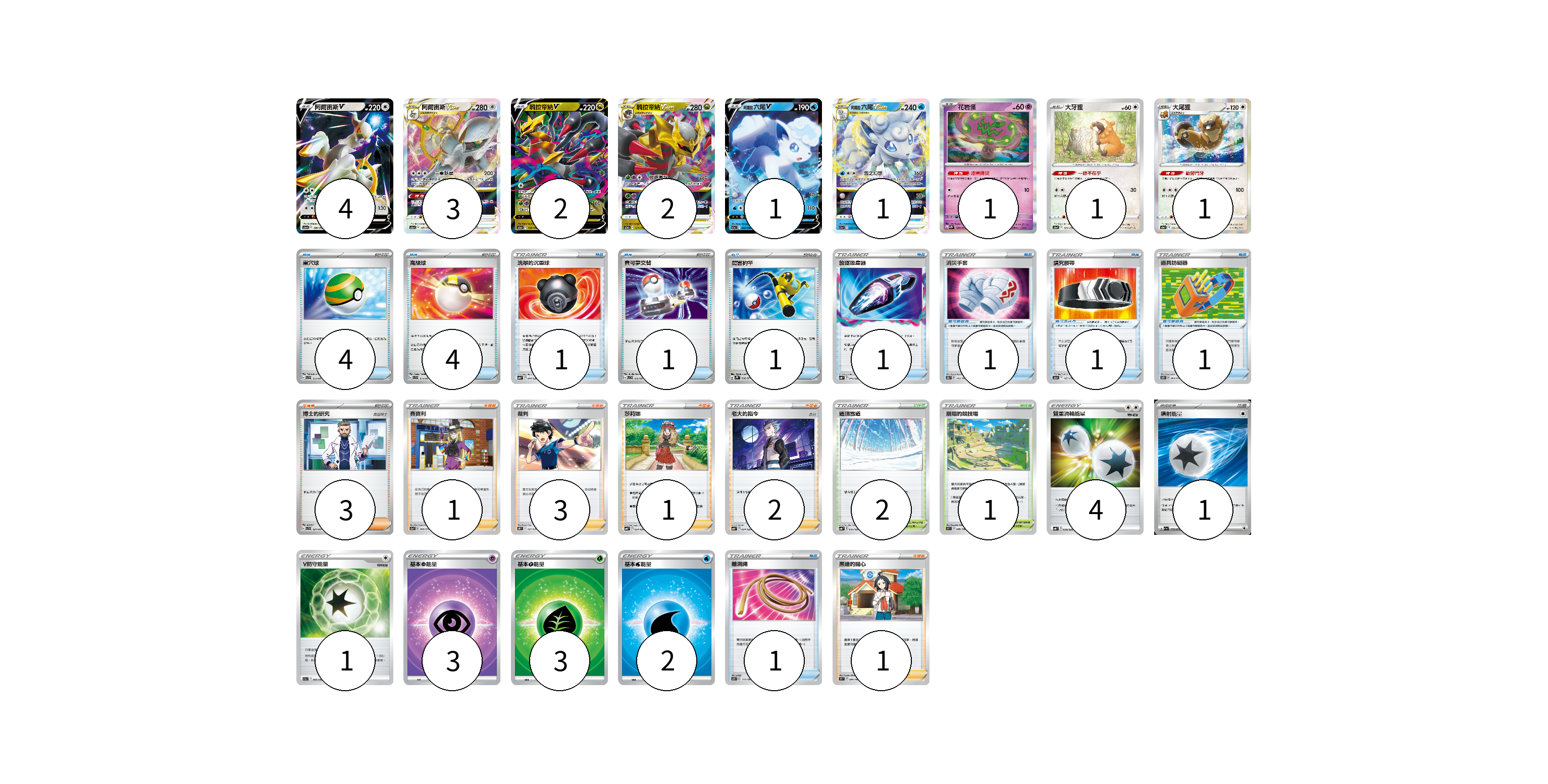 牌組構築方案 以此牌組為基礎新構築牌組 顯示卡面 顯示列表 寶可夢卡(16) 4 3 2 2 1 1 1 1 1 寶可夢道具(3) 1 1 1 物品卡(13) 4 4 1 1 1 1 1 支援者卡(11) 3 1 3 1 2 1 競技場卡(3) 2 1 能量卡(14) 4 1 1 3 3 2 寶可夢卡(16) 卡牌名稱 張數 卡牌名稱 張數 阿爾宙斯V S12a 126/172 04 阿爾宙斯VSTAR S12a 127/172 03 騎拉帝納V S12a 110/172 02 騎拉帝納VSTAR S12a 111/172 02 阿羅拉 六尾V S11a 022/068 01 阿羅拉 六尾VSTAR S11a 023/068 01 花岩怪 SV2D 028/071 01 大牙狸 S12a 121/172 01 大尾狸 S12a 122/172 01 寶可夢道具(3) 卡牌名稱 張數 卡牌名稱 張數 消災手套 S8b 142/184 01 講究腰帶 S12a 145/172 01 道具妨礙器 S5R 064/070 01 物品卡(13) 卡牌名稱 張數 卡牌名稱 張數 巢穴球 SVC 013/021 04 高級球 SVC 014/021 04 洗翠的沉重球 SVB 014/028 01 寶可夢交替 SVC 016/021 01 厲害釣竿 SV2P 066/071 01 放逐吸塵器 SVB 016/028 01 離洞繩 SCB 117/156 01 支援者卡(11) 卡牌名稱 張數 卡牌名稱 張數 博士的研究(弗圖博士) SVC 021/021 03 賽寶利 S5a 068/070 01 裁判 SN 021/024 03 莎莉娜 SVB 020/028 01 老大的指令(赤日) SVB 024/028 02 黑連的關心 S9 094/100 01 競技場卡(3) 卡牌名稱 張數 卡牌名稱 張數 通頂雪道 SVB 026/028 02 崩塌的競技場 S9 098/100 01 能量卡(14) 卡牌名稱 張數 卡牌名稱 張數 雙重渦輪能量 SVB 028/028 04 噴射能量 SV1a 072/073 01 V防守能量 S11a 068/068 01 基本【超】能量 SI PSY 03 基本【草】能量 SI GRA 03 基本【水】能量 SI WAT 02 以此牌組為基礎新構築牌組 牌組編碼 qeZpwv-ORLFse-mSLASi copy 列印牌組單 牌組編碼已複製 分享至SNS