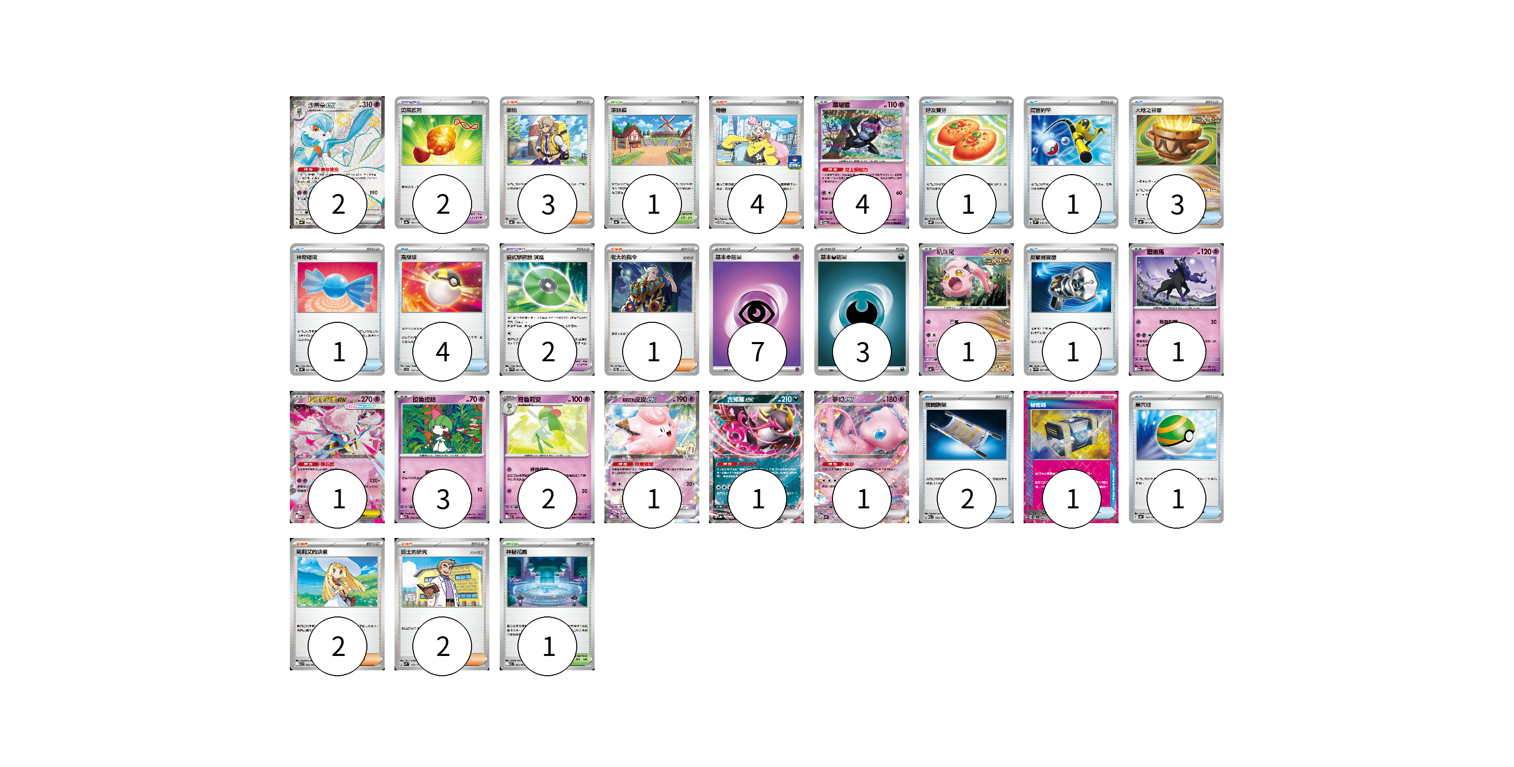 牌組構築方案 以此牌組為基礎新構築牌組 顯示卡面 顯示列表 寶可夢卡(17) 2 4 1 1 1 3 2 1 1 1 寶可夢道具(4) 2 2 物品卡(15) 1 1 3 1 4 1 2 1 1 支援者卡(12) 3 4 1 2 2 競技場卡(2) 1 1 能量卡(10) 7 3 寶可夢卡(17) 卡牌名稱 張數 卡牌名稱 張數 沙奈朵ex SV4a 328/190 02 願增猿 SV6 055/101 04 吼叫尾 SV4K 032/066 01 靈幽馬 M2a 080/193 01 超級蒂安希ex MBD 006/022 01 拉魯拉絲 M1S 040/063 03 奇魯莉安 M1S 041/063 02 莉莉艾的皮皮ex M2a 060/193 01 吉雉雞ex SV8a 104/187 01 夢幻ex SV4a 076/190 01 寶可夢道具(4) 卡牌名稱 張數 卡牌名稱 張數 勇氣護符 SV4a 169/190 02 招式學習器 演進 SV4M 063/066 02 物品卡(15) 卡牌名稱 張數 卡牌名稱 張數 好友寶芬 SV5K 063/071 01 厲害釣竿 SV2P 066/071 01 大地之容器 SV4K 060/066 03 神奇糖果 SV3a 053/062 01 高級球 SVD 119/139 04 反擊捕捉器 SV4M 059/066 01 夜間擔架 M2a 159/193 02 秘密箱 SV6 092/101 01 巢穴球 SV4a 159/190 01 支援者卡(12) 卡牌名稱 張數 卡牌名稱 張數 派帕 SV4a 180/190 03 奇樹 SV-P 106/SV-P 04 老大的指令 SVEM 020/020 01 莉莉艾的決意 M1L 062/063 02 博士的研究 SVM 162/175 02 競技場卡(2) 卡牌名稱 張數 卡牌名稱 張數 深缽鎮 SV4a 185/190 01 神秘花園 M1S 063/063 01 能量卡(10) 卡牌名稱 張數 卡牌名稱 張數 基本【超】能量 SVF PSY 07 基本【惡】能量 SVD DAR 03 以此牌組為基礎新構築牌組 牌組編碼 qgWlRx-TSSnVM-zAXJGp copy 列印牌組單 牌組編碼已複製 分享至SNS