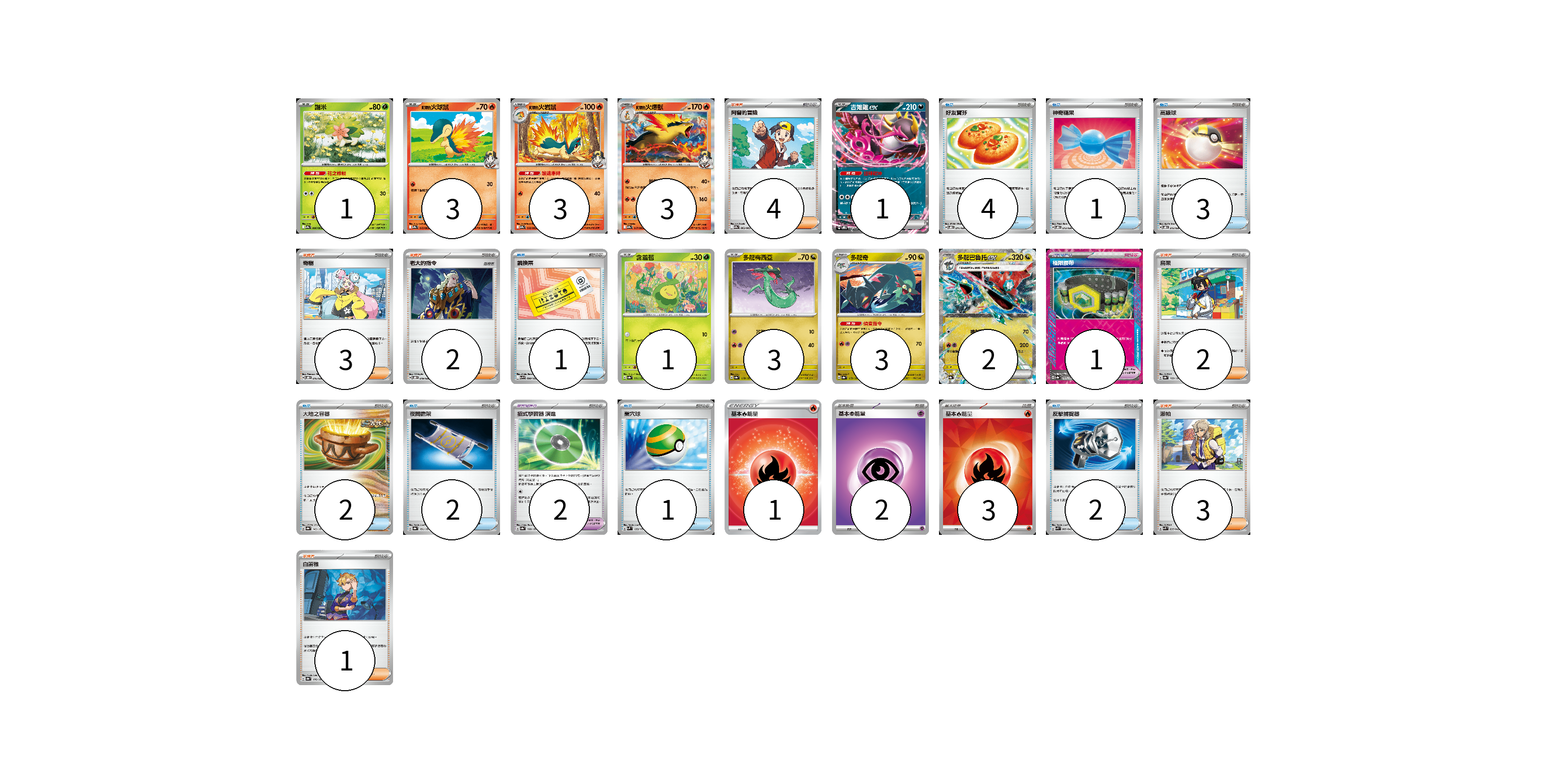 牌組構築方案 以此牌組為基礎新構築牌組 顯示卡面 顯示列表 寶可夢卡(20) 1 3 3 3 1 1 3 3 2 寶可夢道具(3) 1 2 物品卡(16) 4 1 3 1 2 2 1 2 支援者卡(15) 4 3 2 2 3 1 能量卡(6) 1 2 3 寶可夢卡(20) 卡牌名稱 張數 卡牌名稱 張數 謝米 SV9a 006/063 01 <阿響的>火球鼠 SV9a 015/063 03 <阿響的>火岩鼠 SV9a 016/063 03 <阿響的>火爆獸 SV9a 017/063 03 吉雉雞ex SVOD 004/020 01 含羞苞 SV8a 001/187 01 多龍梅西亞 SV8a 118/187 03 多龍奇 SV8a 119/187 03 多龍巴魯托ex SV8a 120/187 02 寶可夢道具(3) 卡牌名稱 張數 卡牌名稱 張數 極限腰帶 SV8a 159/187 01 招式學習器 演進 SV8a 160/187 02 物品卡(16) 卡牌名稱 張數 卡牌名稱 張數 好友寶芬 SVOD 011/020 04 神奇糖果 SVOD 013/020 01 高級球 SVOD 012/020 03 調換票 SV9 090/100 01 大地之容器 SV8a 143/187 02 夜間擔架 SV8a 151/187 02 巢穴球 SVM 133/175 01 反擊捕捉器 SVK 009/042 02 支援者卡(15) 卡牌名稱 張數 卡牌名稱 張數 阿響的冒險 SV9a 063/063 04 奇樹 SVOD 016/020 03 老大的指令 SVOD 019/020 02 烏栗 SV8a 169/187 02 派帕 SVK 035/042 03 白蕾雅 SV8a 176/187 01 能量卡(6) 卡牌名稱 張數 卡牌名稱 張數 基本【炎】能量 SI FIR 01 基本【超】能量 SVAW PSY 02 基本【火】能量 SVK FIR 03 以此牌組為基礎新構築牌組 牌組編碼 qjznRg-mPvJrj-JuDhfr copy 列印牌組單 牌組編碼已複製 分享至SNS
