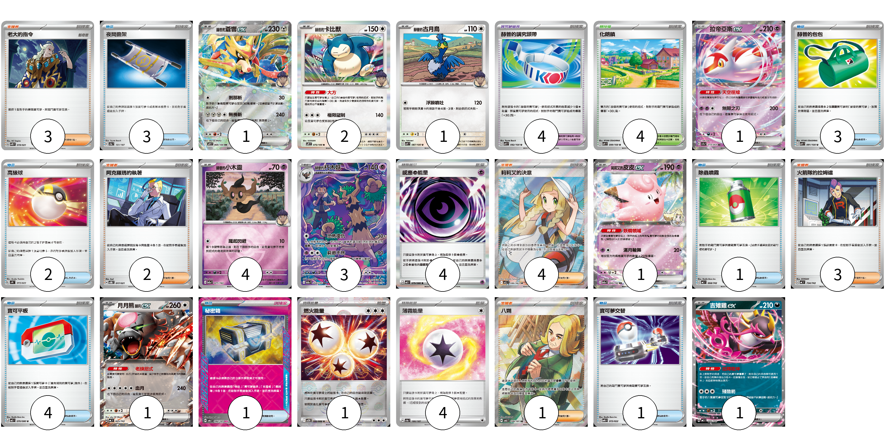 牌組構築方案 以此牌組為基礎新構築牌組 顯示卡面 顯示列表 寶可夢卡(15) 1 2 1 1 4 3 1 1 1 寶可夢道具(4) 4 物品卡(15) 3 3 2 1 4 1 1 支援者卡(13) 3 2 4 3 1 競技場卡(4) 4 能量卡(9) 4 1 4 寶可夢卡(15) 卡牌名稱 張數 卡牌名稱 張數 赫普的蒼響ex SV9 069/100 01 赫普的卡比獸 SV9 075/100 02 赫普的古月鳥 SV9 087/100 01 拉帝亞斯ex SV7a 019/064 01 赫普的小木靈 M2a 077/193 04 赫普的朽木妖 M2a 204/193 03 莉莉艾的皮皮ex M2a 060/193 01 月月熊 赫月 ex MC 625/742 01 吉雉雞ex MC 489/742 01 寶可夢道具(4) 卡牌名稱 張數 卡牌名稱 張數 赫普的講究頭帶 SV9 092/100 04 物品卡(15) 卡牌名稱 張數 卡牌名稱 張數 夜間擔架 SV8a 151/187 03 赫普的包包 SV9 091/100 03 高級球 SVHK 013/022 02 除蟲噴霧 MC 668/742 01 寶可平板 M3 070/080 04 秘密箱 SV6 092/101 01 寶可夢交替 MBG 015/022 01 支援者卡(13) 卡牌名稱 張數 卡牌名稱 張數 老大的指令 SVTR 019/021 03 阿克羅瑪的執著 SVOM 017/021 02 莉莉艾的決意 M1L 086/063 04 火箭隊的拉姆達 MC 734/742 03 八朔 SV6 124/101 01 競技場卡(4) 卡牌名稱 張數 卡牌名稱 張數 化朗鎮 SV9 099/100 04 能量卡(9) 卡牌名稱 張數 卡牌名稱 張數 感應【超】能量 M3 079/080 04 燃火能量 SV11W 086/086 01 薄霧能量 SV8a 186/187 04 以此牌組為基礎新構築牌組 牌組編碼 qlnrTe-XfwwNk-OAJjwB copy 列印牌組單 牌組編碼已複製 分享至SNS