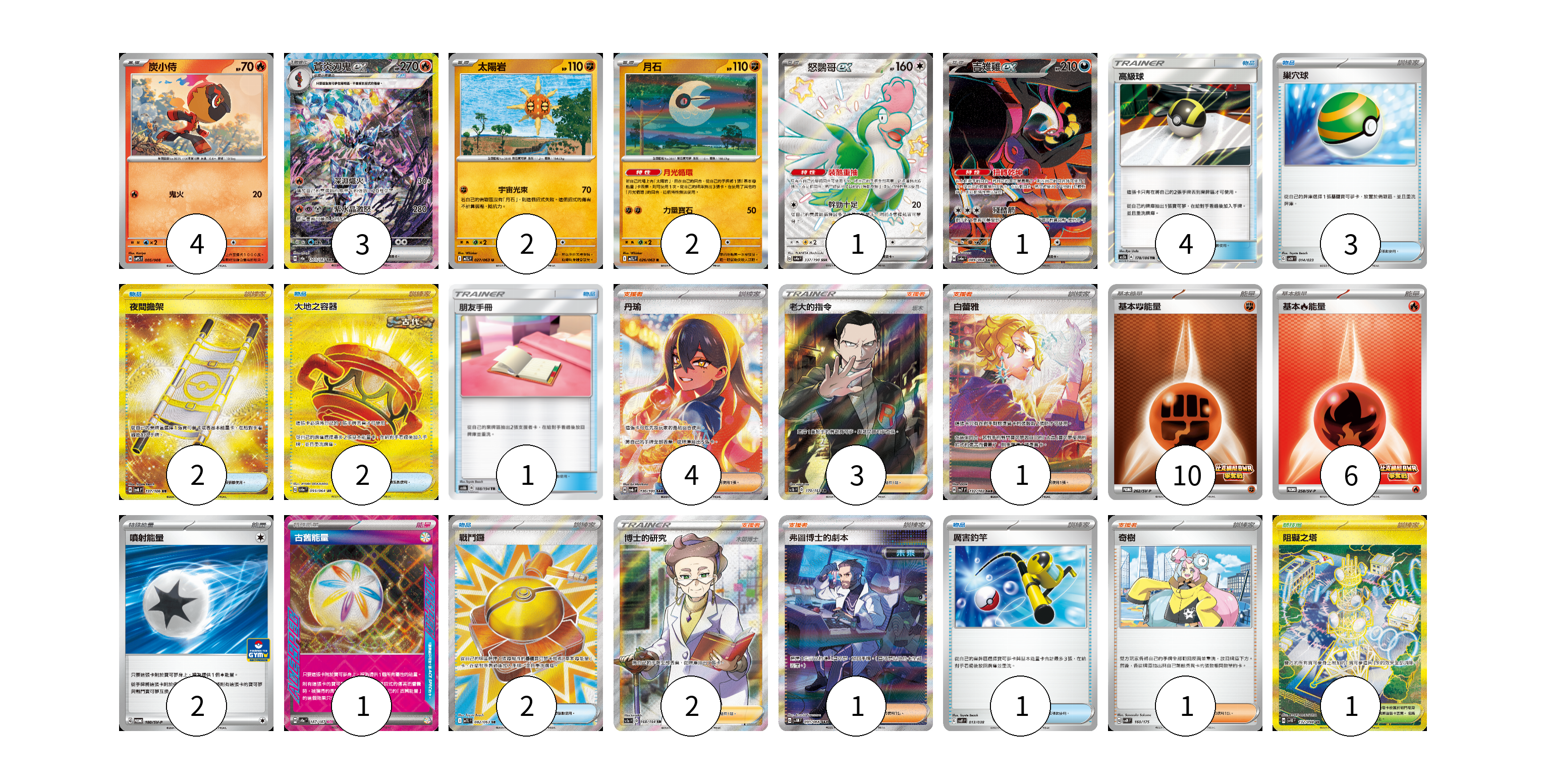 牌組構築方案 以此牌組為基礎新構築牌組 顯示卡面 顯示列表 寶可夢卡(13) 4 3 2 2 1 1 物品卡(15) 4 3 2 2 1 2 1 支援者卡(12) 4 3 1 2 1 1 競技場卡(1) 1 能量卡(19) 10 6 2 1 寶可夢卡(13) 卡牌名稱 張數 卡牌名稱 張數 炭小侍 SVPS 005/008 04 蒼炎刃鬼ex SV8a 203/187 03 太陽岩 M1L 027/063 02 月石 M1L 026/063 02 怒鸚哥ex SV4a 337/190 01 吉雉雞ex SV6a 089/064 01 物品卡(15) 卡牌名稱 張數 卡牌名稱 張數 高級球 AS5b 178/186 04 巢穴球 SVAW 014/023 03 夜間擔架 SV8 137/106 02 大地之容器 SV6a 093/064 02 朋友手冊 AS6b 188/194 01 戰鬥鑼 M1L 082/063 02 厲害釣竿 SVF 013/038 01 支援者卡(12) 卡牌名稱 張數 卡牌名稱 張數 丹瑜 SV6 130/101 04 老大的指令(坂木) SC1b 170/153 03 白蕾雅 SV7 132/102 01 博士的研究(木蘭博士) SC1a 168/154 02 弗圖博士的劇本 SV4M 091/066 01 奇樹 SVM 160/175 01 競技場卡(1) 卡牌名稱 張數 卡牌名稱 張數 阻礙之塔 SV10 132/098 01 能量卡(19) 卡牌名稱 張數 卡牌名稱 張數 基本【鬥】能量 SV-P 262/SV-P 10 基本【火】能量 SV-P 258/SV-P 06 噴射能量 SV-P 180/SV-P 02 古舊能量 SV8a 187/187 01 以此牌組為基礎新構築牌組 牌組編碼 qmNbRH-tdivAr-sDjeHH copy 列印牌組單 牌組編碼已複製 分享至SNS