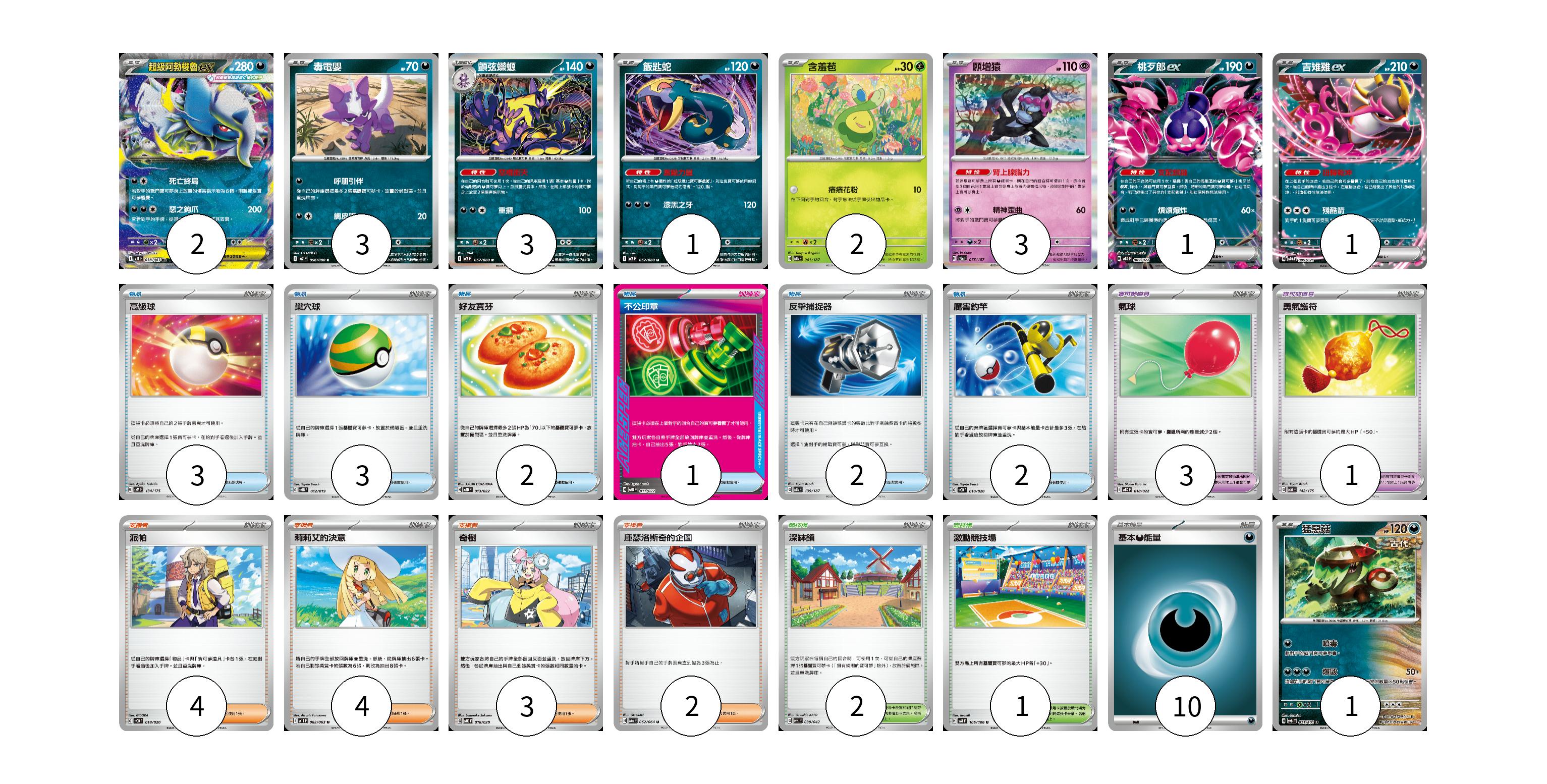 牌組構築方案 以此牌組為基礎新構築牌組 顯示卡面 顯示列表 寶可夢卡(17) 2 3 3 1 2 3 1 1 1 寶可夢道具(1) 1 物品卡(16) 3 3 2 1 2 2 3 支援者卡(13) 4 4 3 2 競技場卡(3) 2 1 能量卡(10) 10 寶可夢卡(17) 卡牌名稱 張數 卡牌名稱 張數 超級阿勃梭魯ex M1L 038/063 02 毒電嬰 M2 056/080 03 顫弦蠑螈 M2 057/080 03 飯匙蛇 M2 052/080 01 含羞苞 SV8a 001/187 02 願增猿 SV8a 075/187 03 桃歹郎ex MBG 009/022 01 吉雉雞ex SVOM 009/021 01 猛惡菇 SV6 071/101 01 寶可夢道具(1) 卡牌名稱 張數 卡牌名稱 張數 勇氣護符 SVM 142/175 01 物品卡(16) 卡牌名稱 張數 卡牌名稱 張數 高級球 SVM 134/175 03 巢穴球 SVTG 012/019 03 好友寶芬 MBD 013/022 02 不公印章 MBD 011/022 01 反擊捕捉器 SV8a 139/187 02 厲害釣竿 SVOD 010/020 02 氣球 MBD 018/022 03 支援者卡(13) 卡牌名稱 張數 卡牌名稱 張數 派帕 SVOD 018/020 04 莉莉艾的決意 M1L 062/063 04 奇樹 SVOD 016/020 03 庫瑟洛斯奇的企圖 SV6a 062/064 02 競技場卡(3) 卡牌名稱 張數 卡牌名稱 張數 深缽鎮 SVK 039/042 02 激動競技場 SV8 105/106 01 能量卡(10) 卡牌名稱 張數 卡牌名稱 張數 基本【惡】能量 SVF DAR 10 以此牌組為基礎新構築牌組 牌組編碼 qngsQp-GTlHQp-EqSQbi copy 列印牌組單 牌組編碼已複製 分享至SNS