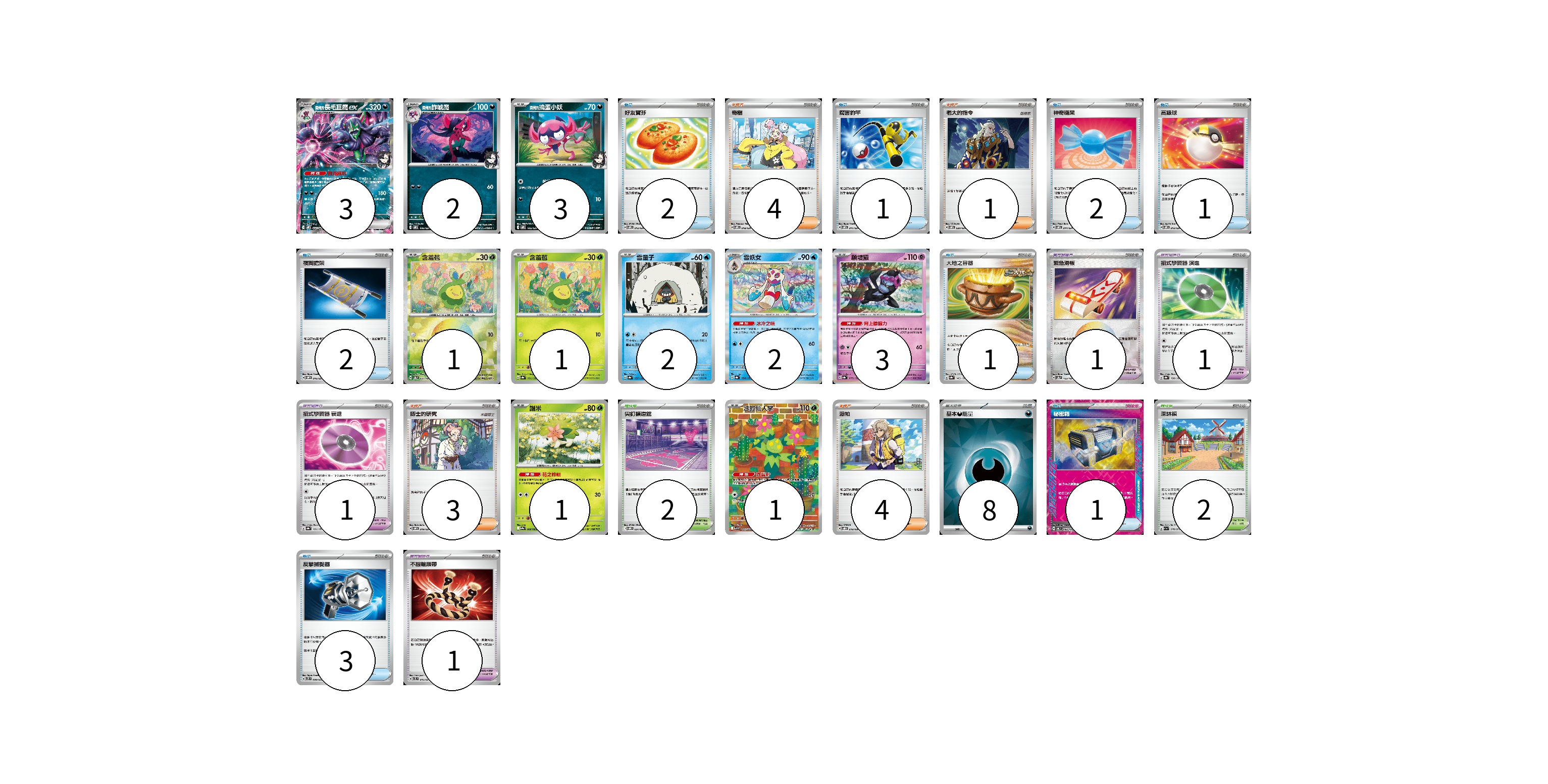 牌組構築方案 以此牌組為基礎新構築牌組 顯示卡面 顯示列表 寶可夢卡(19) 3 2 3 1 1 2 2 3 1 1 寶可夢道具(4) 1 1 1 1 物品卡(13) 2 1 2 1 2 1 1 3 支援者卡(12) 4 1 3 4 競技場卡(4) 2 2 能量卡(8) 8 寶可夢卡(19) 卡牌名稱 張數 卡牌名稱 張數 <瑪俐的>長毛巨魔ex SVOM 007/021 03 <瑪俐的>詐唬魔 SVOM 006/021 02 <瑪俐的>搗蛋小妖 SVOM 005/021 03 含羞苞 SV8a 001/187 01 含羞苞 SV8a 001/187 01 雪童子 SV8a 037/187 02 雪妖女 SV8a 038/187 02 願增猿 SV8a 075/187 03 謝米 SV9a 006/063 01 沙鈴仙人掌 SV9 101/100 01 寶可夢道具(4) 卡牌名稱 張數 卡牌名稱 張數 緊急滑板 SV8a 153/187 01 招式學習器 演進 SV8a 160/187 01 招式學習器 衰退 SV8a 161/187 01 不服輸頭帶 SVTL 016/021 01 物品卡(13) 卡牌名稱 張數 卡牌名稱 張數 好友寶芬 SVOM 012/021 02 厲害釣竿 SVOM 011/021 01 神奇糖果 SVOM 014/021 02 高級球 SVOM 013/021 01 夜間擔架 SVOM 016/021 02 大地之容器 SV8a 143/187 01 秘密箱 SV6 092/101 01 反擊捕捉器 SVTS 009/022 03 支援者卡(12) 卡牌名稱 張數 卡牌名稱 張數 奇樹 SVOM 018/021 04 老大的指令 SVOM 020/021 01 博士的研究 SVOM 019/021 03 派帕 SVOD 018/020 04 競技場卡(4) 卡牌名稱 張數 卡牌名稱 張數 尖釘鎮道館 SVOM 021/021 02 深缽鎮 SV1a 070/073 02 能量卡(8) 卡牌名稱 張數 卡牌名稱 張數 基本【惡】能量 SVOM DAR 08 以此牌組為基礎新構築牌組 牌組編碼 qrUXTX-QbqWqW-IvjcuL copy 列印牌組單 牌組編碼已複製 分享至SNS