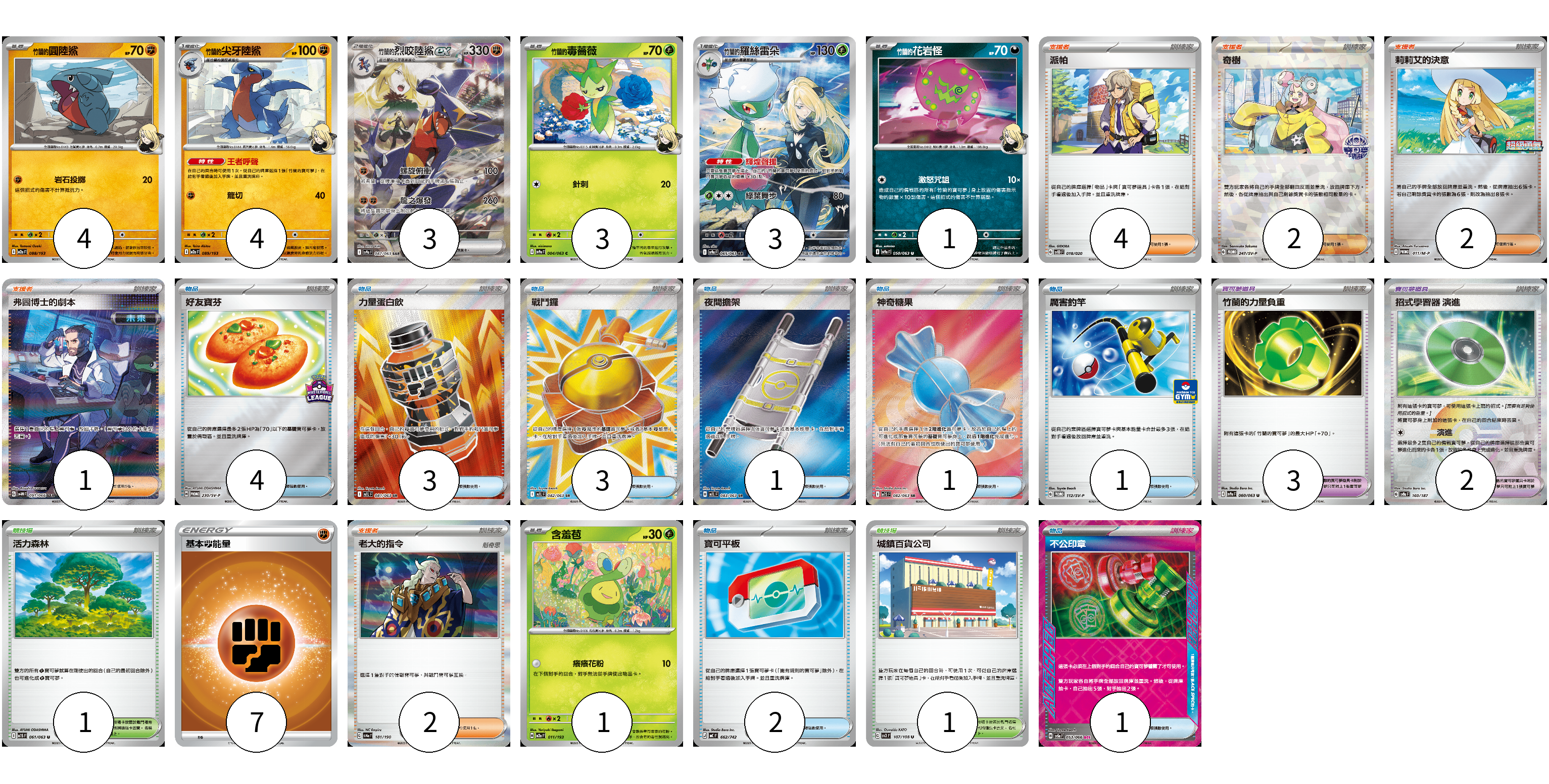 牌組構築方案 以此牌組為基礎新構築牌組 顯示卡面 顯示列表 寶可夢卡(19) 4 4 3 3 3 1 1 寶可夢道具(5) 3 2 物品卡(16) 4 3 3 1 1 1 2 1 支援者卡(11) 4 2 2 1 2 競技場卡(2) 1 1 能量卡(7) 7 寶可夢卡(19) 卡牌名稱 張數 卡牌名稱 張數 竹蘭的圓陸鯊 M2a 088/193 04 竹蘭的尖牙陸鯊 M2a 089/193 04 <竹蘭的>烈咬陸鯊ex SV9a 087/063 03 <竹蘭的>毒薔薇 SV9a 004/063 03 <竹蘭的>羅絲雷朵 SV9a 065/063 03 <竹蘭的>花岩怪 SV9a 050/063 01 含羞苞 M2a 011/193 01 寶可夢道具(5) 卡牌名稱 張數 卡牌名稱 張數 竹蘭的力量負重 SV9a 060/063 03 招式學習器 演進 SV8a 160/187 02 物品卡(16) 卡牌名稱 張數 卡牌名稱 張數 好友寶芬 SV-P 230/SV-P 04 力量蛋白飲 M1L 081/063 03 戰鬥鑼 M1L 082/063 03 夜間擔架 M1L 083/063 01 神奇糖果 M1S 082/063 01 厲害釣竿 SV-P 112/SV-P 01 寶可平板 MC 662/742 02 不公印章 SV5a 053/066 01 支援者卡(11) 卡牌名稱 張數 卡牌名稱 張數 派帕 SVOD 018/020 04 奇樹 SV-P 247/SV-P 02 莉莉艾的決意 M-P 011/M-P 02 弗圖博士的劇本 SV4M 091/066 01 老大的指令 SV4a 181/190 02 競技場卡(2) 卡牌名稱 張數 卡牌名稱 張數 活力森林 M1S 061/063 01 城鎮百貨公司 SV3 107/108 01 能量卡(7) 卡牌名稱 張數 卡牌名稱 張數 基本鬥能量 SLL FIG 07 以此牌組為基礎新構築牌組 牌組編碼 qsLqpE-ZJkaem-zsDZwr copy 列印牌組單 牌組編碼已複製 分享至SNS