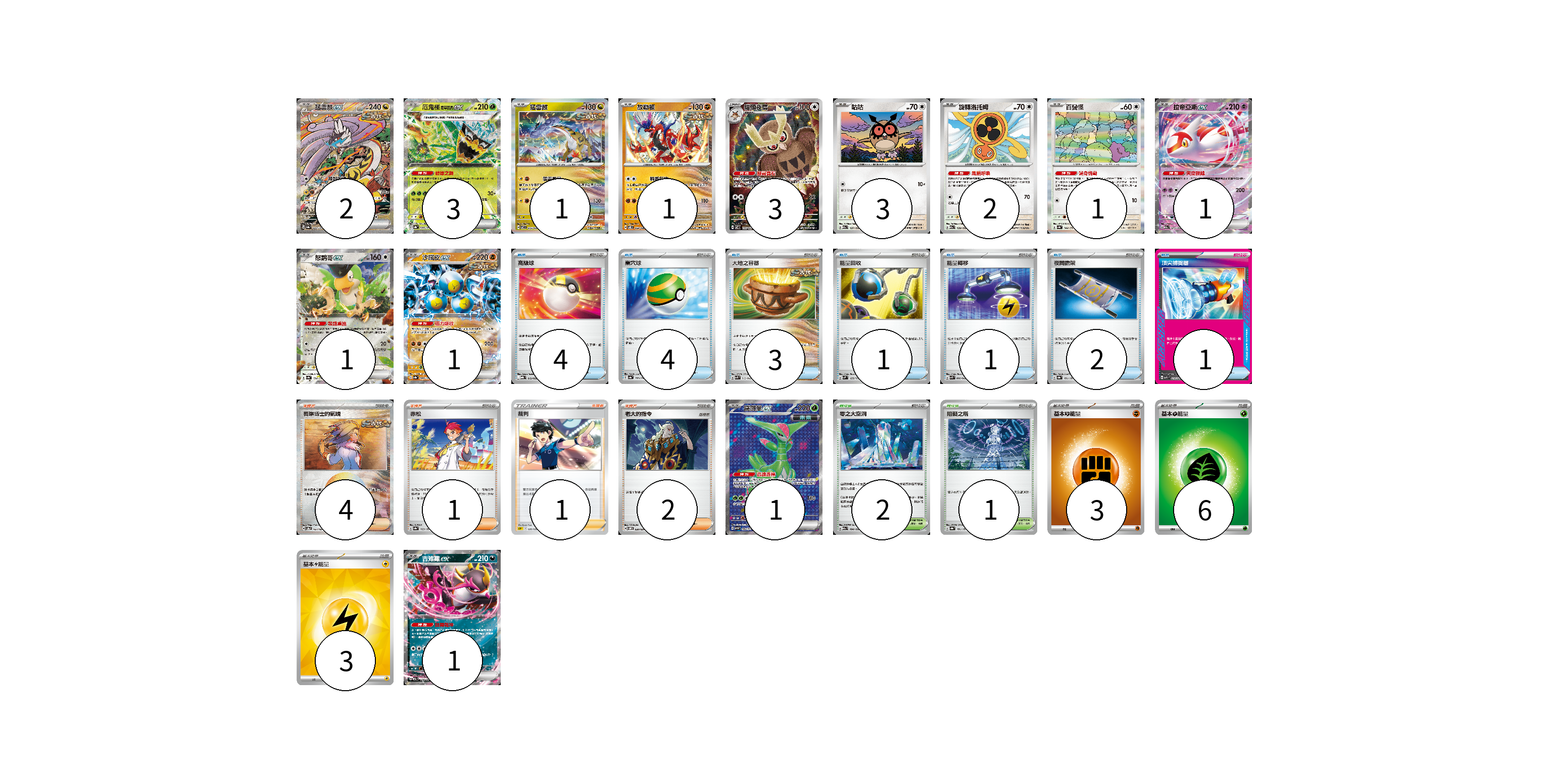 牌組構築方案 以此牌組為基礎新構築牌組 顯示卡面 顯示列表 寶可夢卡(21) 2 3 1 1 3 3 2 1 1 1 1 1 1 物品卡(16) 4 4 3 1 1 2 1 支援者卡(8) 4 1 1 2 競技場卡(3) 2 1 能量卡(12) 3 6 3 寶可夢卡(21) 卡牌名稱 張數 卡牌名稱 張數 猛雷鼓ex SV8a 222/187 02 厄鬼椪 碧草面具ex SV8a 020/187 03 猛雷鼓 SV7 075/102 01 故勒頓 SV8 069/106 01 貓頭夜鷹 SV7 114/102 03 咕咕 M2a 137/193 03 旋轉洛托姆 M2a 139/193 02 百變怪 SV4a 144/190 01 拉帝亞斯ex M2a 075/193 01 怒鸚哥ex SV4a 154/190 01 沙鐵皮ex SV8a 088/187 01 鐵斑葉ex SV5M 084/071 01 吉雉雞ex M2a 114/193 01 物品卡(16) 卡牌名稱 張數 卡牌名稱 張數 高級球 MBG 012/022 04 巢穴球 SV4a 159/190 04 大地之容器 SVK 012/042 03 能量回收 SVM 125/175 01 能量轉移 SVK 008/042 01 夜間擔架 SV8a 151/187 02 頂尖捕捉器 MBG 014/022 01 支援者卡(8) 卡牌名稱 張數 卡牌名稱 張數 奧琳博士的氣魄 SV8a 167/187 04 赤松 SV8a 163/187 01 裁判 SDP 020/022 01 老大的指令 SVOM 020/021 02 競技場卡(3) 卡牌名稱 張數 卡牌名稱 張數 零之大空洞 M2a 184/193 02 阻礙之塔 SV8a 181/187 01 能量卡(12) 卡牌名稱 張數 卡牌名稱 張數 基本【鬥】能量 M-P FIG 03 基本【草】能量 M-P GRA 06 基本【雷】能量 SVQP LIG 03 以此牌組為基礎新構築牌組 牌組編碼 qsSmpL-DyDjBE-CtHVKf copy 列印牌組單 牌組編碼已複製 分享至SNS