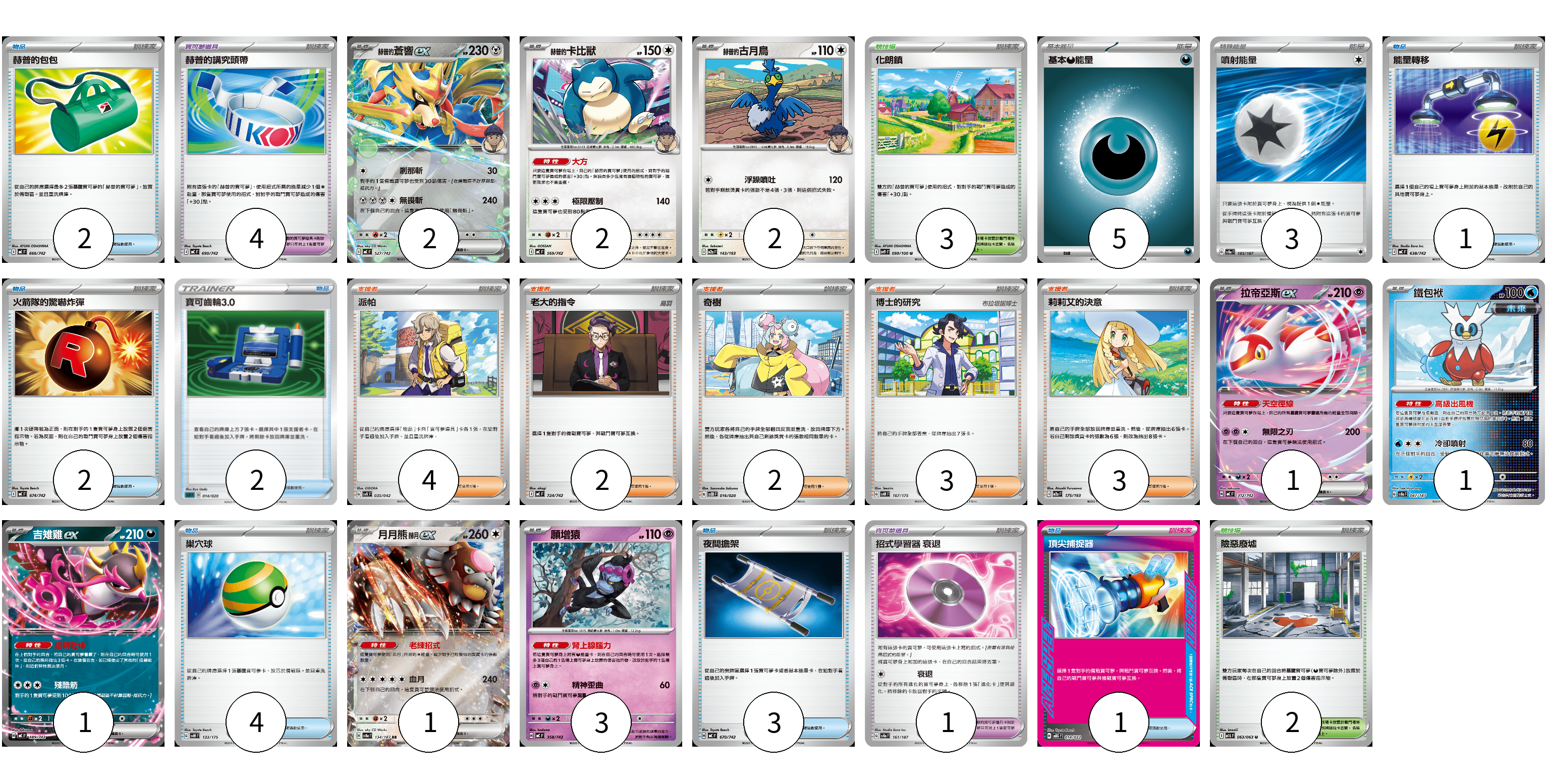 牌組構築方案 以此牌組為基礎新構築牌組 顯示卡面 顯示列表 寶可夢卡(13) 2 2 2 1 1 1 1 3 寶可夢道具(5) 4 1 物品卡(15) 2 1 2 2 4 3 1 支援者卡(14) 4 2 2 3 3 競技場卡(5) 3 2 能量卡(8) 5 3 寶可夢卡(13) 卡牌名稱 張數 卡牌名稱 張數 赫普的蒼響ex MC 527/742 02 赫普的卡比獸 MC 569/742 02 赫普的古月鳥 M2a 143/193 02 拉帝亞斯ex MC 312/742 01 鐵包袱 SV8a 047/187 01 吉雉雞ex MC 489/742 01 月月熊 赫月ex SV8a 134/187 01 願增猿 MC 358/742 03 寶可夢道具(5) 卡牌名稱 張數 卡牌名稱 張數 赫普的講究頭帶 MC 690/742 04 招式學習器 衰退 SV8a 161/187 01 物品卡(15) 卡牌名稱 張數 卡牌名稱 張數 赫普的包包 MC 666/742 02 能量轉移 MC 638/742 01 火箭隊的驚嚇炸彈 MC 674/742 02 寶可齒輪3.0 SLD 014/020 02 巢穴球 SVM 133/175 04 夜間擔架 MC 670/742 03 頂尖捕捉器 MBG 014/022 01 支援者卡(14) 卡牌名稱 張數 卡牌名稱 張數 派帕 SVK 035/042 04 老大的指令 MC 724/742 02 奇樹 SVOD 016/020 02 博士的研究 SVM 167/175 03 莉莉艾的決意 M2a 175/193 03 競技場卡(5) 卡牌名稱 張數 卡牌名稱 張數 化朗鎮 SV9 099/100 03 險惡廢墟 M1L 063/063 02 能量卡(8) 卡牌名稱 張數 卡牌名稱 張數 基本【惡】能量 MC DAR 05 噴射能量 SV8a 185/187 03 以此牌組為基礎新構築牌組 牌組編碼 qtMYml-PWOiau-UKhrEA copy 列印牌組單 牌組編碼已複製 分享至SNS