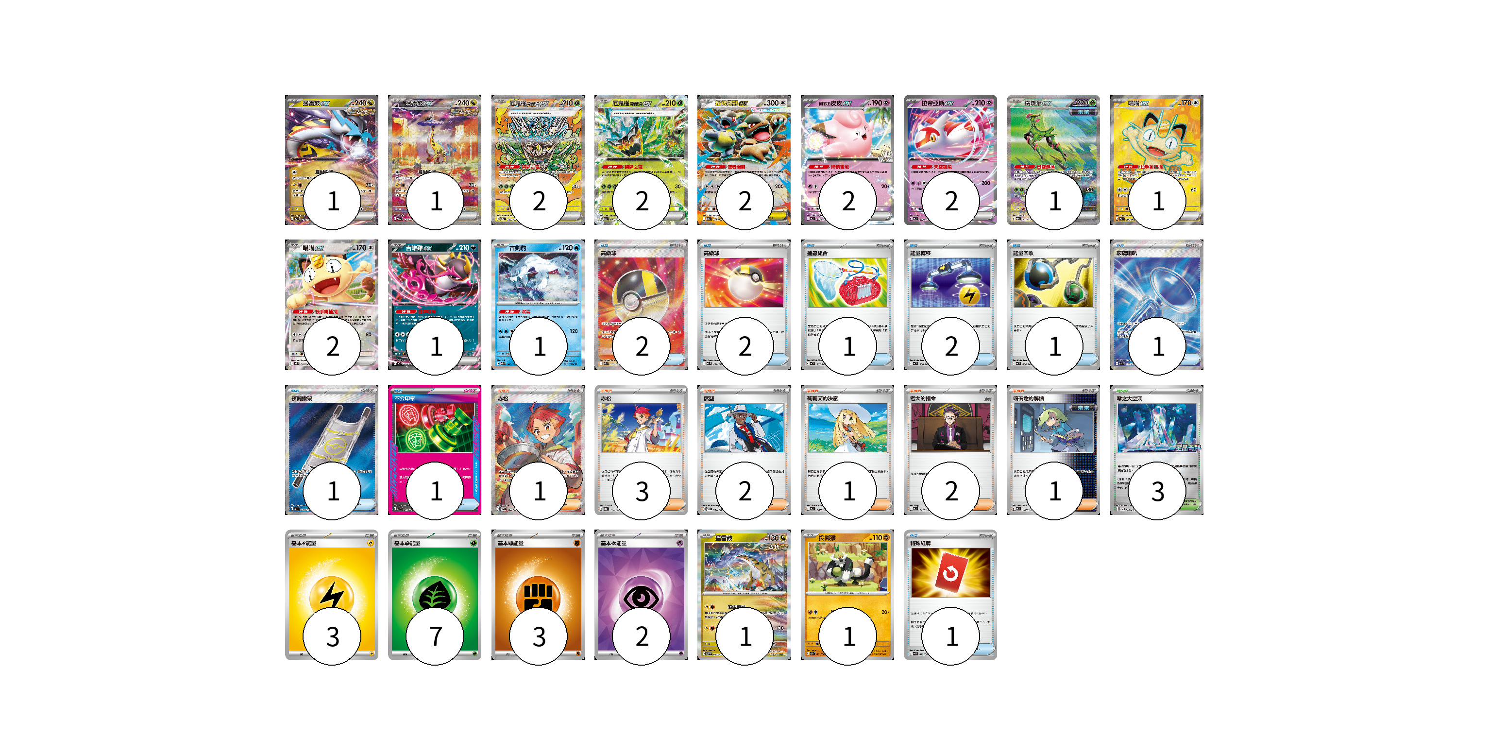 牌組構築方案 以此牌組為基礎新構築牌組 顯示卡面 顯示列表 寶可夢卡(20) 1 1 2 2 2 2 2 1 1 2 1 1 1 1 物品卡(12) 2 2 1 2 1 1 1 1 1 支援者卡(10) 1 3 2 1 2 1 競技場卡(3) 3 能量卡(15) 3 7 3 2 寶可夢卡(20) 卡牌名稱 張數 卡牌名稱 張數 猛雷鼓ex MC 554/742 01 猛雷鼓ex SV5K 095/071 01 厄鬼椪 碧草面具ex SV8a 201/187 02 厄鬼椪 碧草面具ex M2a 017/193 02 超級袋獸ex M1S 051/063 02 莉莉艾的皮皮ex MC 287/742 02 拉帝亞斯ex MC 312/742 02 鐵斑葉ex SV5M 093/071 01 喵喵ex M3 100/080 01 喵喵ex M3 061/080 02 吉雉雞ex MC 489/742 01 古劍豹 M2a 043/193 01 猛雷鼓 SV7 075/102 01 投擲猴 SV7a 031/064 01 物品卡(12) 卡牌名稱 張數 卡牌名稱 張數 高級球 M2a 216/193 02 高級球 MC 651/742 02 捕蟲組合 MC 667/742 01 能量轉移 MC 638/742 02 能量回收 MC 636/742 01 玻璃喇叭 M2a 215/193 01 夜間擔架 M1L 083/063 01 不公印章 MBD 011/022 01 特殊紅牌 M4 072/083 01 支援者卡(10) 卡牌名稱 張數 卡牌名稱 張數 赤松 SV7 123/102 01 赤松 SV8a 163/187 03 席藍 SV8 102/106 02 莉莉艾的決意 MC 729/742 01 老大的指令 MC 724/742 02 暗碼迷的解讀 MC 698/742 01 競技場卡(3) 卡牌名稱 張數 卡牌名稱 張數 零之大空洞 SV-P 151/SV-P 03 能量卡(15) 卡牌名稱 張數 卡牌名稱 張數 基本【雷】能量 MJ LIG 03 基本【草】能量 MJ GRA 07 基本【鬥】能量 MC FIG 03 基本【超】能量 SVOD PSY 02 以此牌組為基礎新構築牌組 牌組編碼 quMlVO-bDQavx-HnqvsA copy 列印牌組單 牌組編碼已複製 分享至SNS