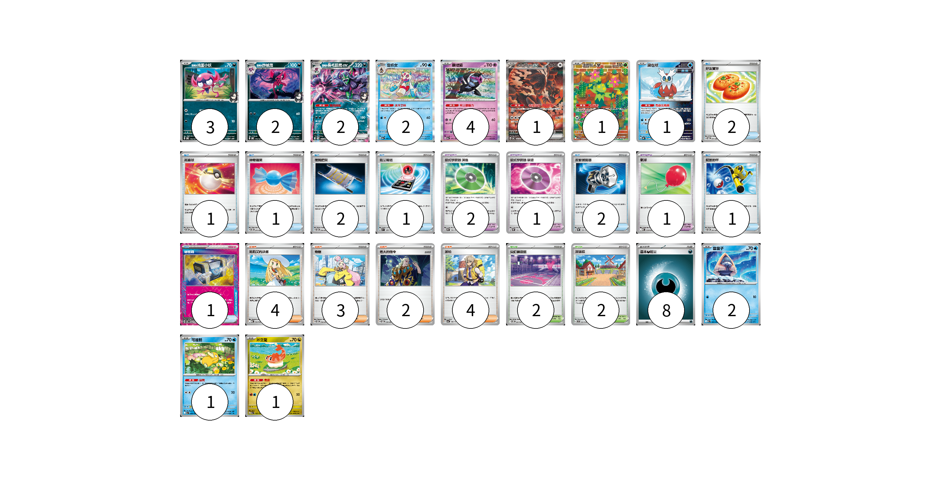 牌組構築方案 以此牌組為基礎新構築牌組 顯示卡面 顯示列表 寶可夢卡(20) 3 2 2 2 4 1 1 1 2 1 1 寶可夢道具(3) 2 1 物品卡(12) 2 1 1 2 1 2 1 1 1 支援者卡(13) 4 3 2 4 競技場卡(4) 2 2 能量卡(8) 8 寶可夢卡(20) 卡牌名稱 張數 卡牌名稱 張數 <瑪俐的>搗蛋小妖 SVOM 005/021 03 <瑪俐的>詐唬魔 SVOM 006/021 02 <瑪俐的>長毛巨魔ex SVOM 007/021 02 雪妖女 SV8a 038/187 02 願增猿 SV8a 075/187 04 月月熊 赫月ex SV8a 225/187 01 沙鈴仙人掌 SV9 101/100 01 鐵包袱 SV8a 047/187 01 雪童子 M2a 035/193 02 可達鴨 M2a 032/193 01 米立龍 M2a 135/193 01 寶可夢道具(3) 卡牌名稱 張數 卡牌名稱 張數 招式學習器 演進 SV8a 160/187 02 招式學習器 衰退 SV8a 161/187 01 物品卡(12) 卡牌名稱 張數 卡牌名稱 張數 好友寶芬 SVOD 011/020 02 高級球 SVOM 013/021 01 神奇糖果 SVOM 014/021 01 夜間擔架 SVOM 016/021 02 能量輸送 SVM 128/175 01 反擊捕捉器 SV8a 139/187 02 氣球 MBD 018/022 01 厲害釣竿 SVOM 011/021 01 秘密箱 SV6 092/101 01 支援者卡(13) 卡牌名稱 張數 卡牌名稱 張數 莉莉艾的決意 MBG 022/022 04 奇樹 SVOM 018/021 03 老大的指令 SVOD 019/020 02 派帕 SV4a 180/190 04 競技場卡(4) 卡牌名稱 張數 卡牌名稱 張數 尖釘鎮道館 SVOM 021/021 02 深缽鎮 SVF 036/038 02 能量卡(8) 卡牌名稱 張數 卡牌名稱 張數 基本【惡】能量 M-P DAR 08 以此牌組為基礎新構築牌組 牌組編碼 quzuZZ-cMlikA-NqnHwM copy 列印牌組單 牌組編碼已複製 分享至SNS
