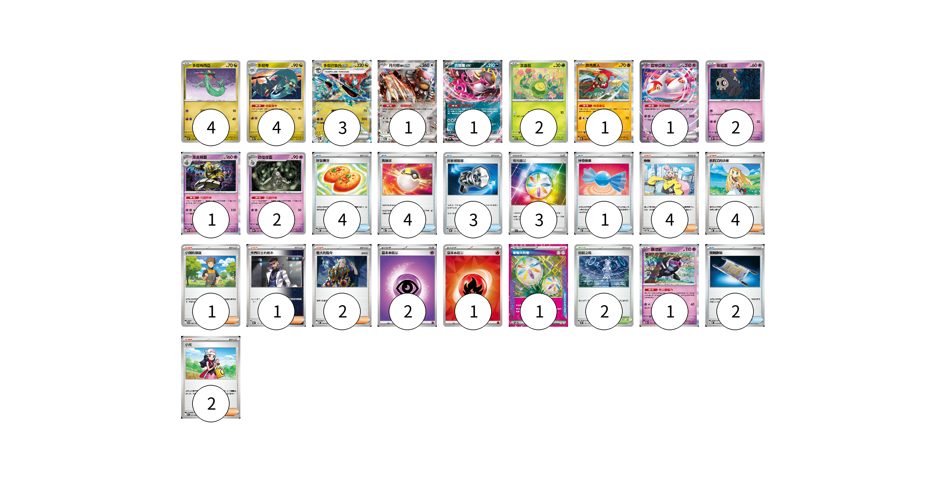 牌組構築方案 以此牌組為基礎新構築牌組 顯示卡面 顯示列表 寶可夢卡(23) 4 4 3 1 1 2 1 1 2 1 2 1 物品卡(14) 4 4 3 1 2 支援者卡(14) 4 4 1 1 2 2 競技場卡(2) 2 能量卡(7) 3 2 1 1 寶可夢卡(23) 卡牌名稱 張數 卡牌名稱 張數 多龍梅西亞 SV8a 118/187 04 多龍奇 SV8a 119/187 04 多龍巴魯托ex SV8a 120/187 03 月月熊 赫月ex SV8a 134/187 01 吉雉雞ex SV8a 104/187 01 含羞苞 SV8a 001/187 02 摔角鷹人 SV8a 084/187 01 拉帝亞斯ex MBD 003/022 01 夜巡靈 SV8a 064/187 02 黑夜魔靈 SV6a 020/064 01 彷徨夜靈 SV8a 065/187 02 願增猿 SV8a 075/187 01 物品卡(14) 卡牌名稱 張數 卡牌名稱 張數 好友寶芬 MBD 013/022 04 高級球 MBD 014/022 04 反擊捕捉器 SV8a 139/187 03 神奇糖果 MBG 013/022 01 夜間擔架 MBD 016/022 02 支援者卡(14) 卡牌名稱 張數 卡牌名稱 張數 奇樹 SVOD 016/020 04 莉莉艾的決意 MBD 021/022 04 小剛的發掘 SV9 096/100 01 弗圖博士的劇本 SV8a 175/187 01 老大的指令 MBD 020/022 02 小光 M2 077/080 02 競技場卡(2) 卡牌名稱 張數 卡牌名稱 張數 阻礙之塔 SV8a 181/187 02 能量卡(7) 卡牌名稱 張數 卡牌名稱 張數 夜光能量 SVK 042/042 03 基本【超】能量 MBD PSY 02 基本【火】能量 SVQL FIR 01 新衝天能量 SV5K 071/071 01 以此牌組為基礎新構築牌組 牌組編碼 qxNxtQ-xlszkM-PvjpyR copy 列印牌組單 牌組編碼已複製 分享至SNS