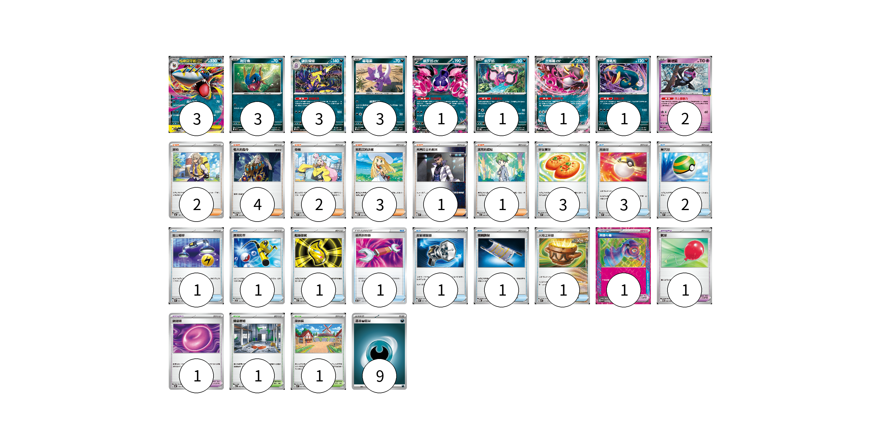 牌組構築方案 以此牌組為基礎新構築牌組 顯示卡面 顯示列表 寶可夢卡(18) 3 3 3 3 1 1 1 1 2 寶可夢道具(3) 1 1 1 物品卡(15) 3 3 2 1 1 1 1 1 1 1 支援者卡(13) 2 4 2 3 1 1 競技場卡(2) 1 1 能量卡(9) 9 寶可夢卡(18) 卡牌名稱 張數 卡牌名稱 張數 超級巨牙鯊ex M2 051/080 03 利牙魚 M2 050/080 03 顫弦蠑螈 M2 057/080 03 毒電嬰 M2 056/080 03 桃歹郎ex MBG 009/022 01 桃歹郎 SV8 075/106 01 吉雉雞ex SV8a 104/187 01 飯匙蛇 M2 052/080 01 願增猿 M-P 014/M-P 02 寶可夢道具(3) 卡牌名稱 張數 卡牌名稱 張數 英雄斗篷 SV5M 064/071 01 氣球 SV11B 082/086 01 鎖鏈糬 SV8a 154/187 01 物品卡(15) 卡牌名稱 張數 卡牌名稱 張數 好友寶芬 SVK 015/042 03 高級球 SVK 018/042 03 巢穴球 SVK 016/042 02 能量轉移 SVK 008/042 01 厲害釣竿 SVF 013/038 01 超級信號 M1S 058/063 01 道具拆除器 S8b 138/184 01 反擊捕捉器 SVK 009/042 01 夜間擔架 MBG 017/022 01 大地之容器 SVK 012/042 01 支援者卡(13) 卡牌名稱 張數 卡牌名稱 張數 派帕 SV4a 180/190 02 老大的指令 MBG 021/022 04 奇樹 SVK 031/042 02 莉莉艾的決意 MBD 021/022 03 弗圖博士的劇本 SVK 034/042 01 滿充的體貼 M1S 060/063 01 競技場卡(2) 卡牌名稱 張數 卡牌名稱 張數 險惡廢墟 M1L 063/063 01 深缽鎮 SVK 039/042 01 能量卡(9) 卡牌名稱 張數 卡牌名稱 張數 基本【惡】能量 SVF DAR 09 以此牌組為基礎新構築牌組 牌組編碼 qxziRl-iibrMK-FzlAOI copy 列印牌組單 牌組編碼已複製 分享至SNS