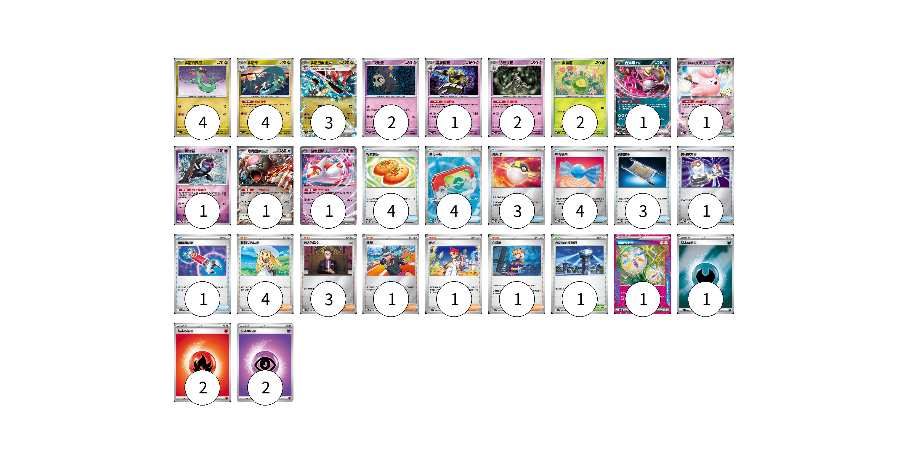 牌組構築方案 以此牌組為基礎新構築牌組 顯示卡面 顯示列表 寶可夢卡(23) 4 4 3 2 1 2 2 1 1 1 1 1 物品卡(20) 4 4 3 4 3 1 1 支援者卡(10) 4 3 1 1 1 競技場卡(1) 1 能量卡(6) 1 1 2 2 寶可夢卡(23) 卡牌名稱 張數 卡牌名稱 張數 多龍梅西亞 MC 546/742 04 多龍奇 MC 547/742 04 多龍巴魯托ex MC 548/742 03 夜巡靈 MC 308/742 02 黑夜魔靈 MC 310/742 01 彷徨夜靈 MC 309/742 02 含羞苞 M2a 011/193 02 吉雉雞ex MC 489/742 01 莉莉艾的皮皮ex MC 287/742 01 願增猿 M2a 081/193 01 月月熊 赫月 ex MC 625/742 01 拉帝亞斯ex MC 312/742 01 物品卡(20) 卡牌名稱 張數 卡牌名稱 張數 好友寶芬 MC 648/742 04 寶可平板 M3 103/080 04 高級球 MC 651/742 03 神奇糖果 MC 655/742 04 夜間擔架 MBD 016/022 03 寶可夢交替 MC 663/742 01 道具拆除器 SV11W 080/086 01 支援者卡(10) 卡牌名稱 張數 卡牌名稱 張數 莉莉艾的決意 MC 729/742 04 老大的指令 MC 724/742 03 裁判 MC 711/742 01 赤松 MC 696/742 01 白蕾雅 MC 722/742 01 競技場卡(1) 卡牌名稱 張數 卡牌名稱 張數 火箭隊的監視塔 M2a 189/193 01 能量卡(6) 卡牌名稱 張數 卡牌名稱 張數 新衝天能量 SV5K 071/071 01 基本【惡】能量 MC DAR 01 基本【火】能量 MC FIR 02 基本【超】能量 M-P PSY 02 以此牌組為基礎新構築牌組 牌組編碼 qyYBQP-VvlTmM-pgPzCg copy 列印牌組單 牌組編碼已複製 分享至SNS