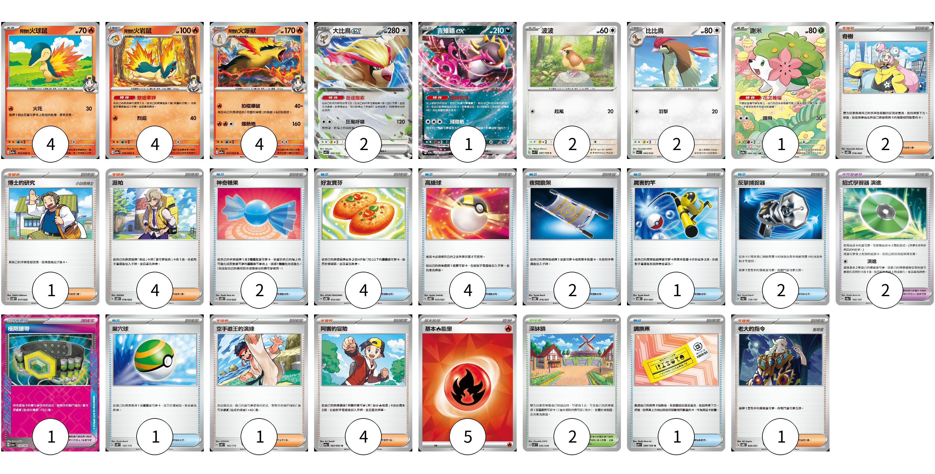 牌組構築方案 以此牌組為基礎新構築牌組 顯示卡面 顯示列表 寶可夢卡(20) 4 4 4 2 1 2 2 1 寶可夢道具(3) 2 1 物品卡(17) 2 4 4 2 1 2 1 1 支援者卡(13) 2 1 4 1 4 1 競技場卡(2) 2 能量卡(5) 5 寶可夢卡(20) 卡牌名稱 張數 卡牌名稱 張數 <阿響的>火球鼠 SV9a 015/063 04 <阿響的>火岩鼠 SV9a 016/063 04 <阿響的>火爆獸 SV9a 017/063 04 大比鳥ex SVK 005/042 02 吉雉雞ex SV6a 038/064 01 波波 SV3 087/108 02 比比鳥 SVK 004/042 02 謝米 SV9a 066/063 01 寶可夢道具(3) 卡牌名稱 張數 卡牌名稱 張數 招式學習器 演進 SV8a 160/187 02 極限腰帶 SV8a 159/187 01 物品卡(17) 卡牌名稱 張數 卡牌名稱 張數 神奇糖果 SVOD 013/020 02 好友寶芬 SVOM 012/021 04 高級球 SVOM 013/021 04 夜間擔架 SVOM 016/021 02 厲害釣竿 SVOM 011/021 01 反擊捕捉器 SV8a 139/187 02 巢穴球 SVM 133/175 01 調換票 SV9 090/100 01 支援者卡(13) 卡牌名稱 張數 卡牌名稱 張數 奇樹 SVOD 016/020 02 博士的研究 SVOD 017/020 01 派帕 SVOD 018/020 04 空手道王的演練 SVM 145/175 01 阿響的冒險 SV9a 063/063 04 老大的指令 SVOM 020/021 01 競技場卡(2) 卡牌名稱 張數 卡牌名稱 張數 深缽鎮 SVF 036/038 02 能量卡(5) 卡牌名稱 張數 卡牌名稱 張數 基本【火】能量 SVK FIR 05 以此牌組為基礎新構築牌組 牌組編碼 rDYROH-MvghCM-bgVszF copy 列印牌組單 牌組編碼已複製 分享至SNS