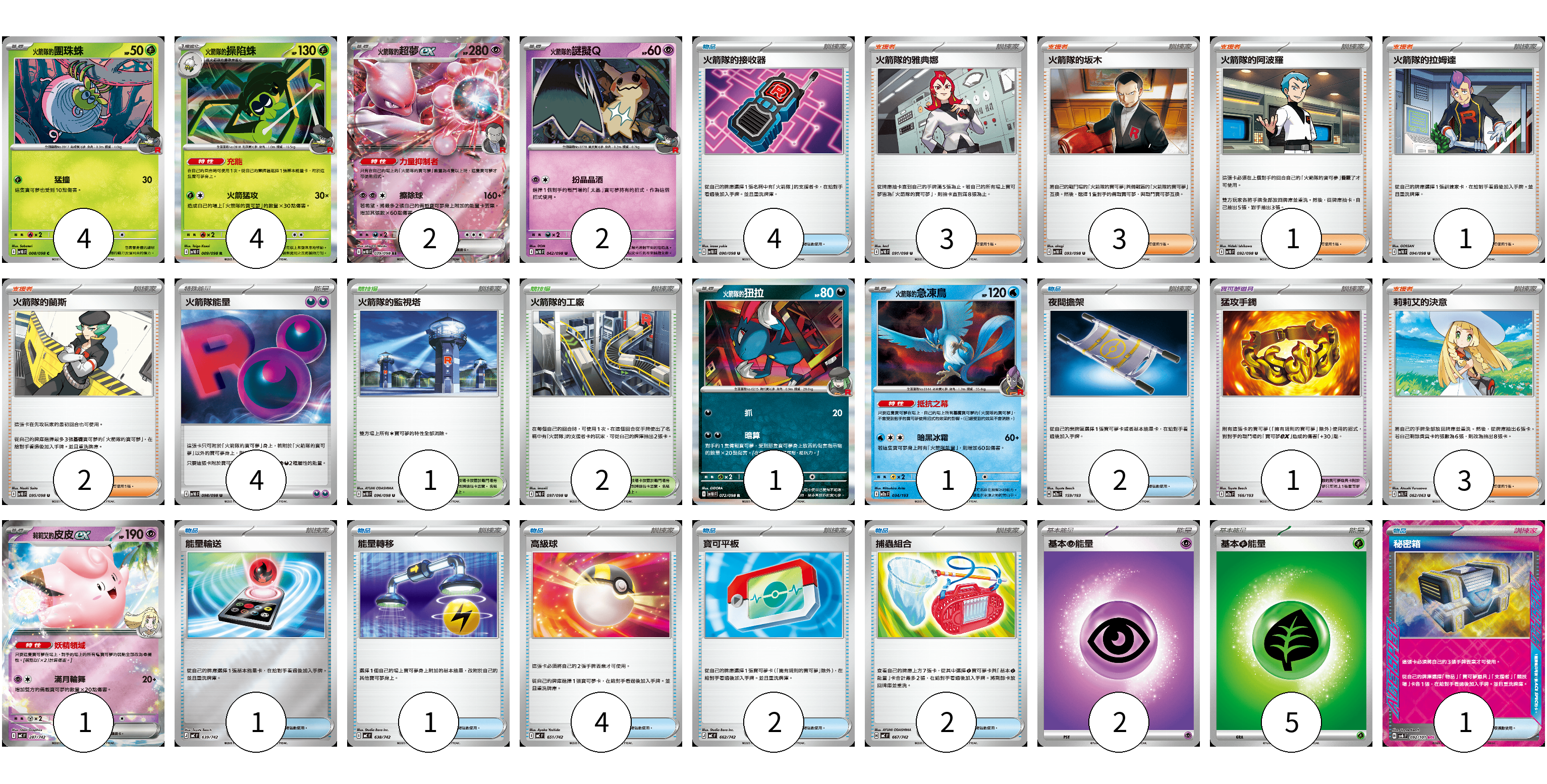 牌組構築方案 以此牌組為基礎新構築牌組 顯示卡面 顯示列表 寶可夢卡(15) 4 4 2 2 1 1 1 寶可夢道具(1) 1 物品卡(17) 4 2 1 1 4 2 2 1 支援者卡(13) 3 3 1 1 2 3 競技場卡(3) 1 2 能量卡(11) 4 2 5 寶可夢卡(15) 卡牌名稱 張數 卡牌名稱 張數 <火箭隊的>團珠蛛 SV10 008/098 04 <火箭隊的>操陷蛛 SV10 009/098 04 <火箭隊的>超夢ex SV10 039/098 02 <火箭隊的>謎擬Q SV10 042/098 02 <火箭隊的>狃拉 SV10 072/098 01 <火箭隊的>急凍鳥 M2a 034/193 01 莉莉艾的皮皮ex MC 287/742 01 寶可夢道具(1) 卡牌名稱 張數 卡牌名稱 張數 猛攻手鐲 M2a 166/193 01 物品卡(17) 卡牌名稱 張數 卡牌名稱 張數 火箭隊的接收器 SV10 090/098 04 夜間擔架 M2a 159/193 02 能量輸送 MC 639/742 01 能量轉移 MC 638/742 01 高級球 MC 651/742 04 寶可平板 MC 662/742 02 捕蟲組合 MC 667/742 02 秘密箱 SV6 092/101 01 支援者卡(13) 卡牌名稱 張數 卡牌名稱 張數 火箭隊的雅典娜 SV10 091/098 03 火箭隊的坂木 SV10 093/098 03 火箭隊的阿波羅 SV10 092/098 01 火箭隊的拉姆達 SV10 094/098 01 火箭隊的蘭斯 SV10 095/098 02 莉莉艾的決意 M1L 062/063 03 競技場卡(3) 卡牌名稱 張數 卡牌名稱 張數 火箭隊的監視塔 SV10 096/098 01 火箭隊的工廠 SV10 097/098 02 能量卡(11) 卡牌名稱 張數 卡牌名稱 張數 火箭隊能量 SV10 098/098 04 基本【超】能量 MC PSY 02 基本【草】能量 MC GRA 05 以此牌組為基礎新構築牌組 牌組編碼 rEFdRm-KyYpGr-AlMkpD copy 列印牌組單 牌組編碼已複製 分享至SNS