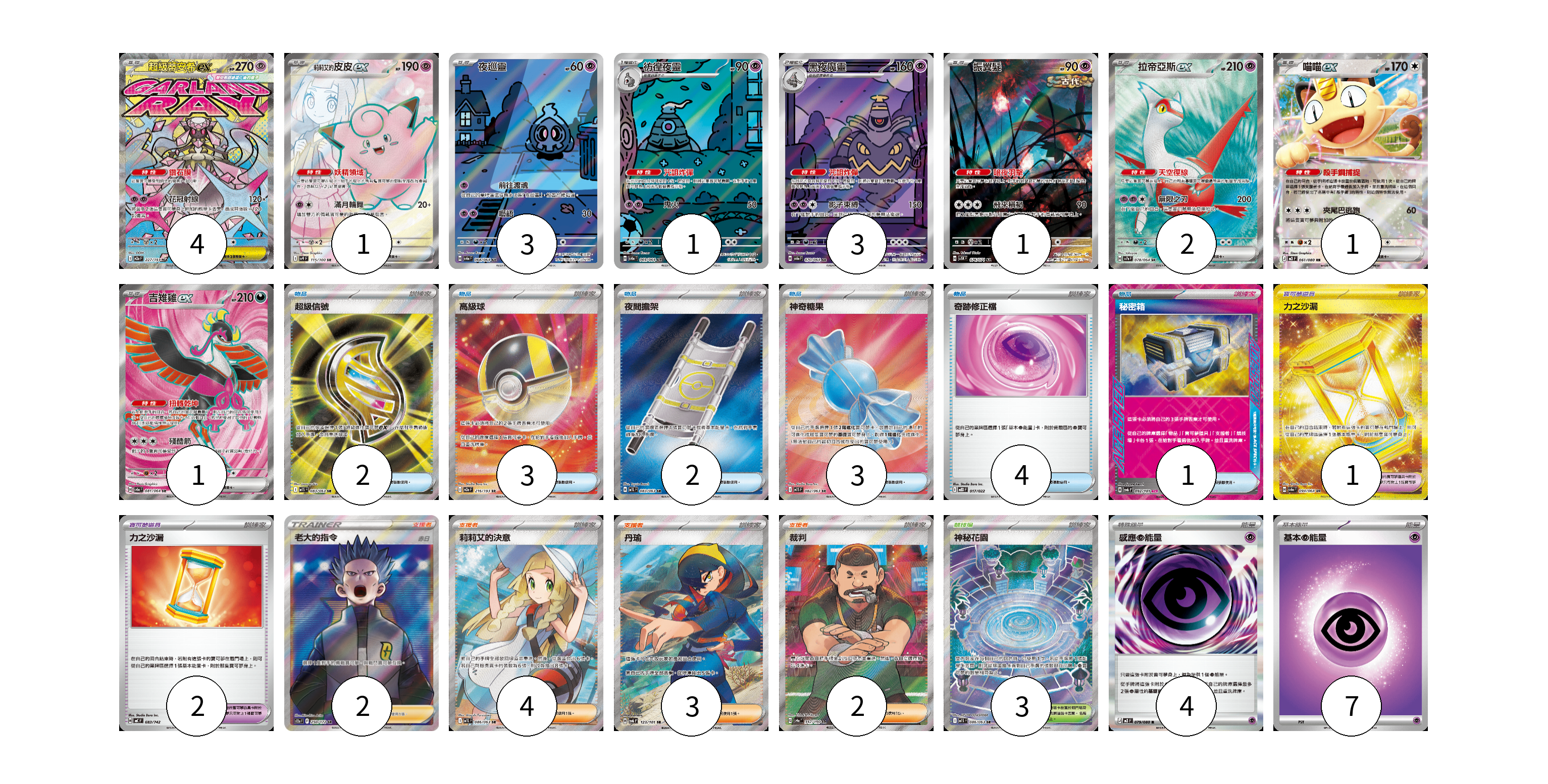 牌組構築方案 以此牌組為基礎新構築牌組 顯示卡面 顯示列表 寶可夢卡(17) 4 1 3 1 3 1 2 1 1 寶可夢道具(3) 1 2 物品卡(15) 2 3 2 3 4 1 支援者卡(11) 2 4 3 2 競技場卡(3) 3 能量卡(11) 4 7 寶可夢卡(17) 卡牌名稱 張數 卡牌名稱 張數 超級蒂安希ex M2a 227/193 04 莉莉艾的皮皮ex SV9 115/100 01 夜巡靈 SV6a 068/064 03 彷徨夜靈 SV6a 069/064 01 黑夜魔靈 SV6a 070/064 03 振翼髮 SV5K 076/071 01 拉帝亞斯ex SV7a 078/064 02 喵喵ex M3 061/080 01 吉雉雞ex SV6a 081/064 01 寶可夢道具(3) 卡牌名稱 張數 卡牌名稱 張數 力之沙漏 SV6a 094/064 01 力之沙漏 MC 683/742 02 物品卡(15) 卡牌名稱 張數 卡牌名稱 張數 超級信號 M1S 083/063 02 高級球 M2a 216/193 03 夜間擔架 M1L 083/063 02 神奇糖果 M1S 082/063 03 奇跡修正檔 MBD 017/022 04 秘密箱 SV6 092/101 01 支援者卡(11) 卡牌名稱 張數 卡牌名稱 張數 老大的指令(赤日) S12a 250/172 02 莉莉艾的決意 M1L 086/063 04 丹瑜 SV6 123/101 03 裁判 SV4a 342/190 02 競技場卡(3) 卡牌名稱 張數 卡牌名稱 張數 神秘花園 M1S 086/063 03 能量卡(11) 卡牌名稱 張數 卡牌名稱 張數 感應【超】能量 M3 079/080 04 基本【超】能量 MC PSY 07 以此牌組為基礎新構築牌組 牌組編碼 rEpUMj-GFSLsS-uUTZUf copy 列印牌組單 牌組編碼已複製 分享至SNS