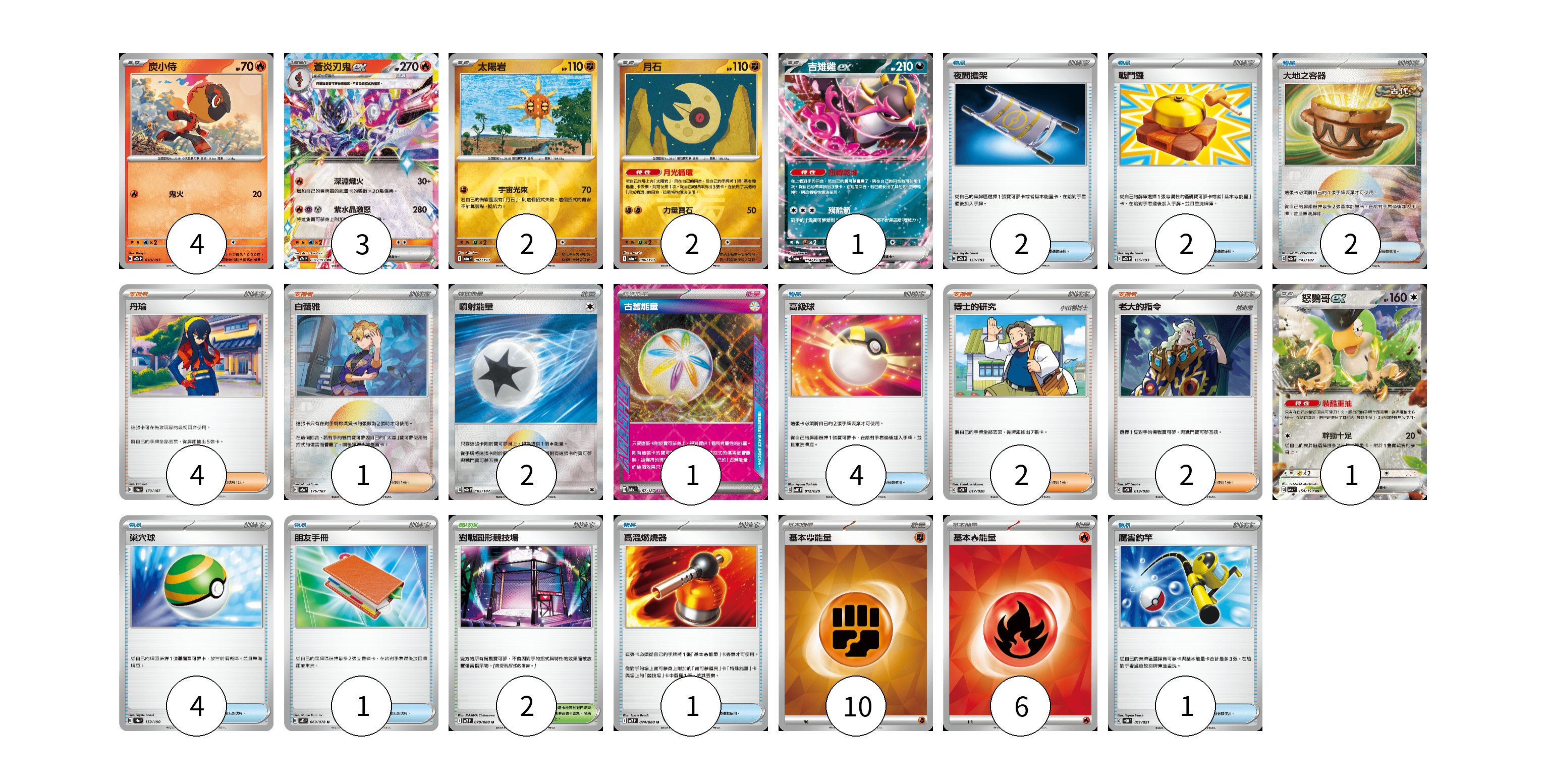 牌組構築方案 以此牌組為基礎新構築牌組 顯示卡面 顯示列表 寶可夢卡(13) 4 3 2 2 1 1 物品卡(17) 2 2 2 4 4 1 1 1 支援者卡(9) 4 1 2 2 競技場卡(2) 2 能量卡(19) 2 1 10 6 寶可夢卡(13) 卡牌名稱 張數 卡牌名稱 張數 炭小侍 M2a 030/193 04 蒼炎刃鬼ex M2a 031/193 03 太陽岩 M2a 087/193 02 月石 M2a 086/193 02 吉雉雞ex M2a 114/193 01 怒鸚哥ex SV4a 154/190 01 物品卡(17) 卡牌名稱 張數 卡牌名稱 張數 夜間擔架 M2a 159/193 02 戰鬥鑼 M2a 155/193 02 大地之容器 SV8a 143/187 02 高級球 SVOD 012/020 04 巢穴球 SV4a 159/190 04 朋友手冊 SV1S 069/078 01 高溫燃燒器 M2 074/080 01 厲害釣竿 SVOM 011/021 01 支援者卡(9) 卡牌名稱 張數 卡牌名稱 張數 丹瑜 SV8a 170/187 04 白蕾雅 SV8a 176/187 01 博士的研究 SVOD 017/020 02 老大的指令 SVOD 019/020 02 競技場卡(2) 卡牌名稱 張數 卡牌名稱 張數 對戰圓形競技場 M2 079/080 02 能量卡(19) 卡牌名稱 張數 卡牌名稱 張數 噴射能量 SV8a 185/187 02 古舊能量 SV8a 187/187 01 基本【鬥】能量 SVK FIG 10 基本【火】能量 SVK FIR 06 以此牌組為基礎新構築牌組 牌組編碼 rFgFPe-sNQoep-trqhcZ copy 列印牌組單 牌組編碼已複製 分享至SNS