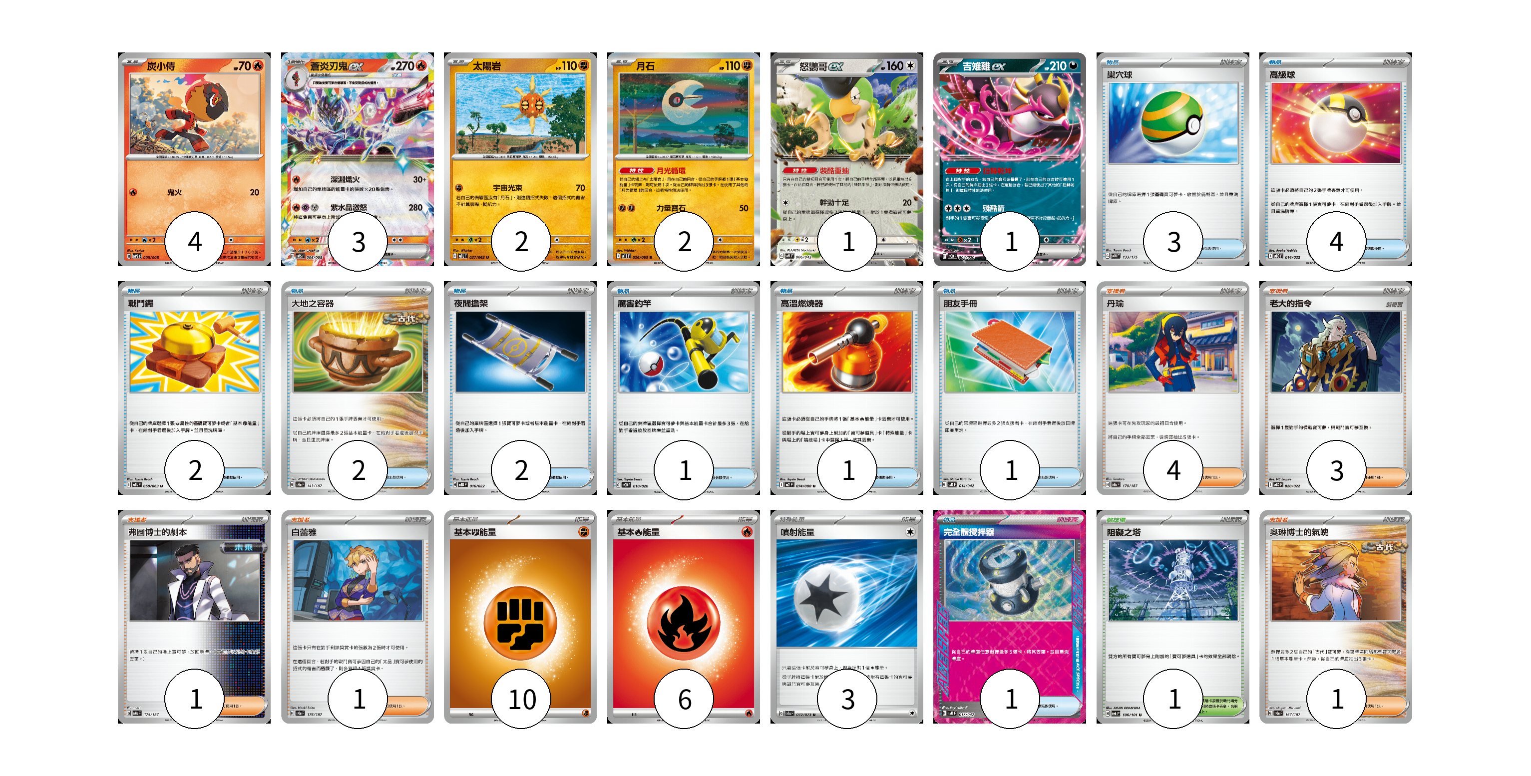 牌組構築方案 以此牌組為基礎新構築牌組 顯示卡面 顯示列表 寶可夢卡(13) 4 3 2 2 1 1 物品卡(17) 3 4 2 2 2 1 1 1 1 支援者卡(10) 4 3 1 1 1 競技場卡(1) 1 能量卡(19) 10 6 3 寶可夢卡(13) 卡牌名稱 張數 卡牌名稱 張數 炭小侍 SVPS 005/008 04 蒼炎刃鬼ex SVPS 006/008 03 太陽岩 M1L 027/063 02 月石 M1L 026/063 02 怒鸚哥ex SVK 006/042 01 吉雉雞ex SVOD 004/020 01 物品卡(17) 卡牌名稱 張數 卡牌名稱 張數 巢穴球 SVM 133/175 03 高級球 MBD 014/022 04 戰鬥鑼 M1L 059/063 02 大地之容器 SV8a 143/187 02 夜間擔架 MBD 016/022 02 厲害釣竿 SVOD 010/020 01 高溫燃燒器 M2 074/080 01 朋友手冊 SVK 014/042 01 完全體攪拌器 SVK 017/042 01 支援者卡(10) 卡牌名稱 張數 卡牌名稱 張數 丹瑜 SV8a 170/187 04 老大的指令 MBD 020/022 03 弗圖博士的劇本 SV8a 175/187 01 白蕾雅 SV8a 176/187 01 奧琳博士的氣魄 SV8a 167/187 01 競技場卡(1) 卡牌名稱 張數 卡牌名稱 張數 阻礙之塔 SV6 100/101 01 能量卡(19) 卡牌名稱 張數 卡牌名稱 張數 基本【鬥】能量 M-P FIG 10 基本【火】能量 M-P FIR 06 噴射能量 SV1a 072/073 03 以此牌組為基礎新構築牌組 牌組編碼 rFgLxv-tuxyXs-Wozqry copy 列印牌組單 牌組編碼已複製 分享至SNS