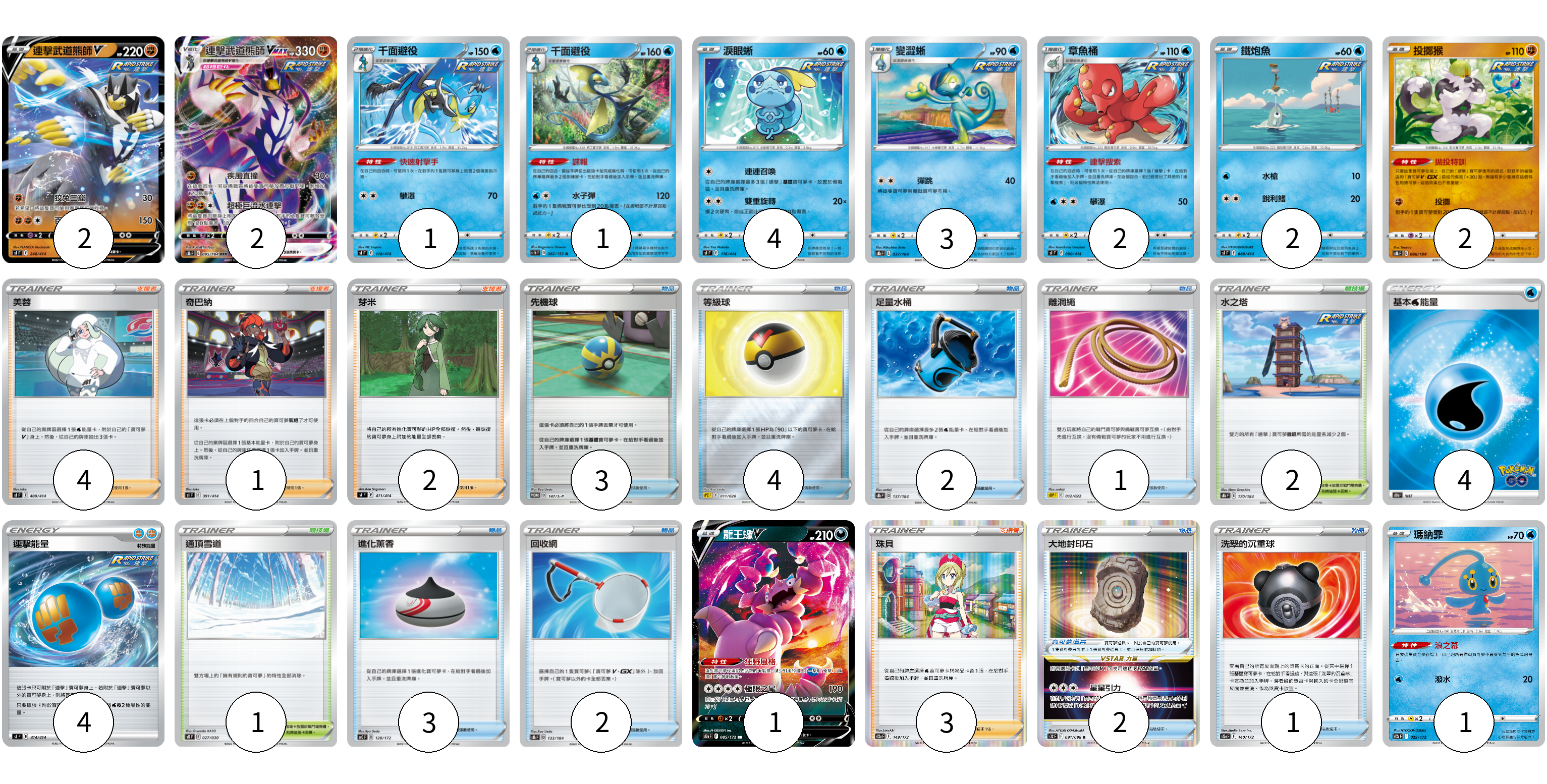 牌組構築方案 以此牌組為基礎新構築牌組 顯示卡面 顯示列表 寶可夢卡(21) 2 2 1 1 4 3 2 2 2 1 1 寶可夢道具(2) 2 物品卡(16) 3 4 2 1 3 2 1 支援者卡(10) 4 1 2 3 競技場卡(3) 2 1 能量卡(8) 4 4 寶可夢卡(21) 卡牌名稱 張數 卡牌名稱 張數 連擊武道熊師V SI 248/414 02 連擊武道熊師VMAX S8b 095/184 02 千面避役 SI 118/414 01 千面避役 SC1b 082/153 01 淚眼蜥 SI 116/414 04 變澀蜥 S8b 037/184 03 章魚桶 SI 090/414 02 鐵炮魚 SI 089/414 02 投擲猴 S8b 088/184 02 龍王蠍V S12a 085/172 01 瑪納霏 S12a 029/172 01 寶可夢道具(2) 卡牌名稱 張數 卡牌名稱 張數 大地封印石 S12 091/098 02 物品卡(16) 卡牌名稱 張數 卡牌名稱 張數 先機球 S-P 147/S-P 03 等級球 SPZ 011/020 04 足量水桶 S8b 137/184 02 離洞繩 SDP 012/022 01 進化薰香 SCC 128/172 03 回收網 S8b 133/184 02 洗翠的沉重球 S12a 140/172 01 支援者卡(10) 卡牌名稱 張數 卡牌名稱 張數 美蓉 SI 409/414 04 奇巴納 SI 391/414 01 芽米 SI 411/414 02 珠貝 S12a 149/172 03 競技場卡(3) 卡牌名稱 張數 卡牌名稱 張數 水之塔 S8b 170/184 02 通頂雪道 SK 027/030 01 能量卡(8) 卡牌名稱 張數 卡牌名稱 張數 基本水能量 S10b WAT 04 連擊能量 SI 414/414 04 以此牌組為基礎新構築牌組 牌組編碼 rHHHGh-jhGAuE-HKSCjL copy 列印牌組單 牌組編碼已複製 分享至SNS