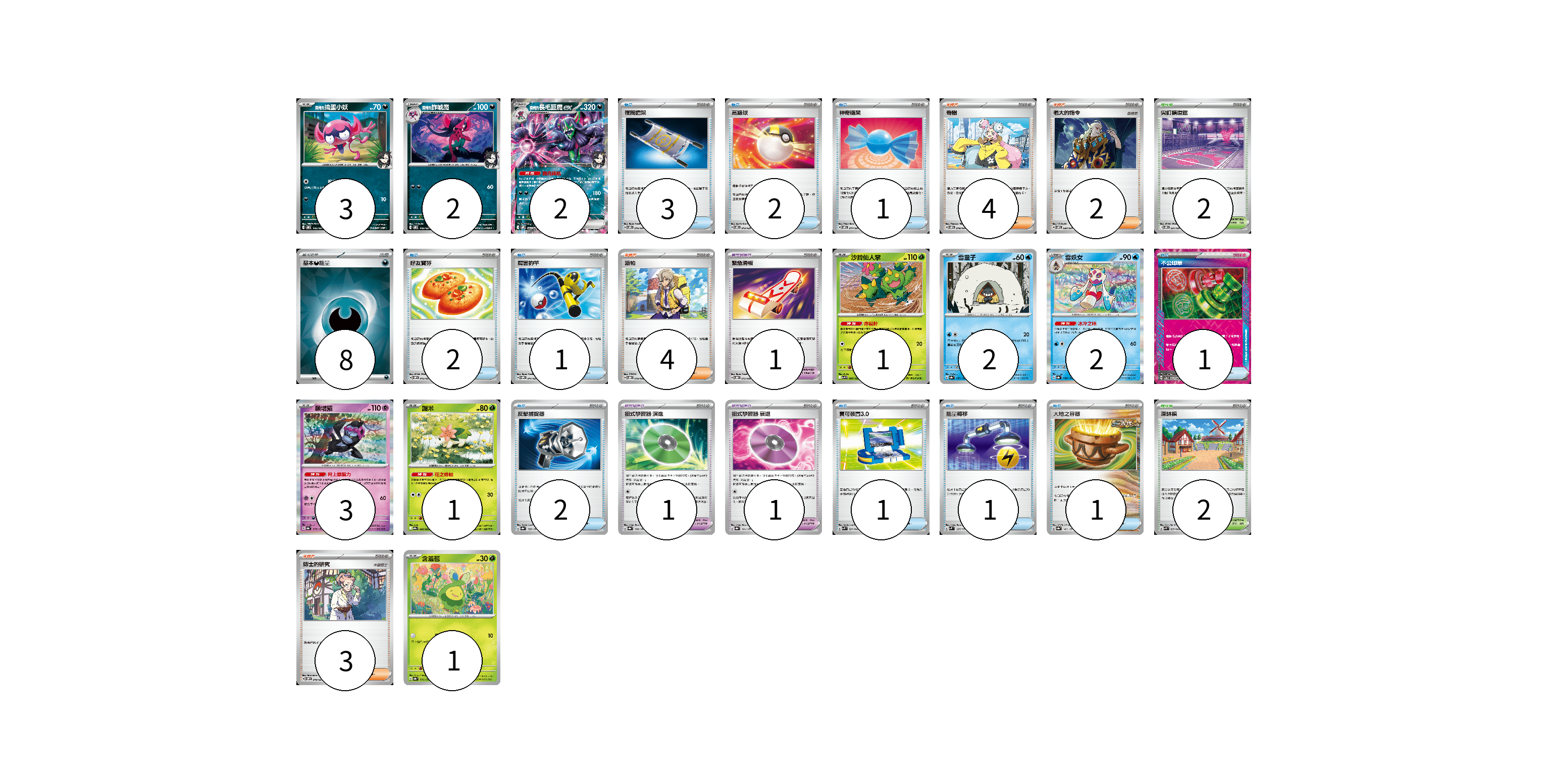 牌組構築方案 以此牌組為基礎新構築牌組 顯示卡面 顯示列表 寶可夢卡(17) 3 2 2 1 2 2 3 1 1 寶可夢道具(3) 1 1 1 物品卡(15) 3 2 1 2 1 1 2 1 1 1 支援者卡(13) 4 2 4 3 競技場卡(4) 2 2 能量卡(8) 8 寶可夢卡(17) 卡牌名稱 張數 卡牌名稱 張數 <瑪俐的>搗蛋小妖 SVOM 005/021 03 <瑪俐的>詐唬魔 SVOM 006/021 02 <瑪俐的>長毛巨魔ex SVOM 007/021 02 沙鈴仙人掌 SV9 006/100 01 雪童子 SV8a 037/187 02 雪妖女 SV8a 038/187 02 願增猿 SV8a 075/187 03 謝米 SV9a 006/063 01 含羞苞 SV8a 001/187 01 寶可夢道具(3) 卡牌名稱 張數 卡牌名稱 張數 緊急滑板 SVOD 015/020 01 招式學習器 演進 SV8a 160/187 01 招式學習器 衰退 SV8a 161/187 01 物品卡(15) 卡牌名稱 張數 卡牌名稱 張數 夜間擔架 SVOM 016/021 03 高級球 SVOM 013/021 02 神奇糖果 SVOM 014/021 01 好友寶芬 SVOM 012/021 02 厲害釣竿 SVOM 011/021 01 不公印章 SV5a 053/066 01 反擊捕捉器 SV8a 139/187 02 寶可裝置3.0 SVK 021/042 01 能量轉移 SVM 127/175 01 大地之容器 SV8a 143/187 01 支援者卡(13) 卡牌名稱 張數 卡牌名稱 張數 奇樹 SVOM 018/021 04 老大的指令 SVOM 020/021 02 派帕 SVOD 018/020 04 博士的研究 SVOM 019/021 03 競技場卡(4) 卡牌名稱 張數 卡牌名稱 張數 尖釘鎮道館 SVOM 021/021 02 深缽鎮 SVK 039/042 02 能量卡(8) 卡牌名稱 張數 卡牌名稱 張數 基本【惡】能量 SVOM DAR 08 以此牌組為基礎新構築牌組 牌組編碼 rImbRN-dmjYkW-mvHclI copy 列印牌組單 牌組編碼已複製 分享至SNS