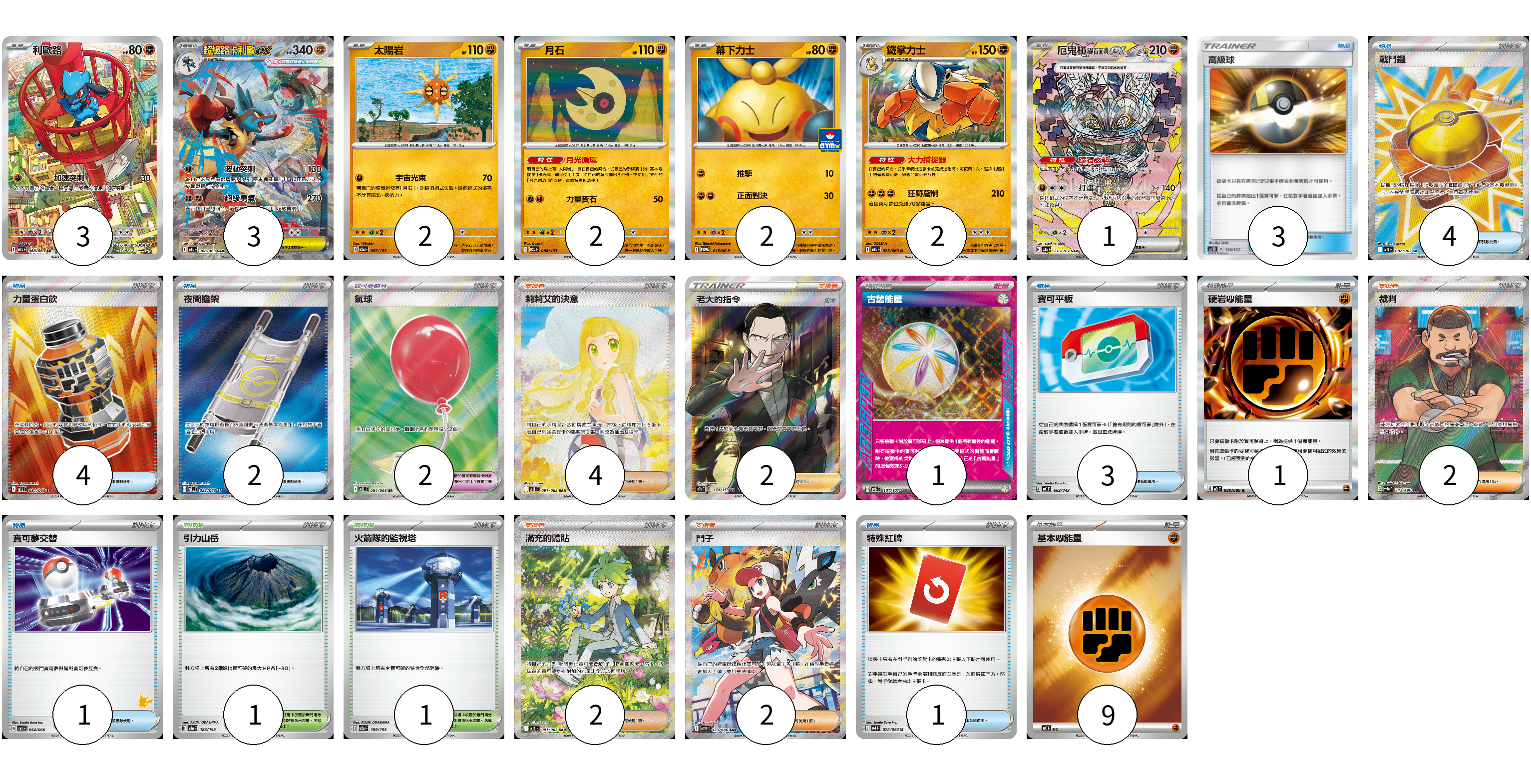 牌組構築方案 以此牌組為基礎新構築牌組 顯示卡面 顯示列表 寶可夢卡(15) 3 3 2 2 2 2 1 寶可夢道具(2) 2 物品卡(18) 3 4 4 2 3 1 1 支援者卡(12) 4 2 2 2 2 競技場卡(2) 1 1 能量卡(11) 1 1 9 寶可夢卡(15) 卡牌名稱 張數 卡牌名稱 張數 利歐路 M1L 068/063 03 超級路卡利歐ex M1L 088/063 03 太陽岩 M2a 087/193 02 月石 M2a 086/193 02 幕下力士 M-P 015/M-P 02 鐵掌力士 M1L 025/063 02 厄鬼椪 礎石面具ex SV8a 216/187 01 寶可夢道具(2) 卡牌名稱 張數 卡牌名稱 張數 氣球 M1L 084/063 02 物品卡(18) 卡牌名稱 張數 卡牌名稱 張數 高級球 AC1D 139/157 03 戰鬥鑼 M1L 082/063 04 力量蛋白飲 M1L 081/063 04 夜間擔架 M1L 083/063 02 寶可平板 MC 662/742 03 寶可夢交替 SVI 054/066 01 特殊紅牌 M4 072/083 01 支援者卡(12) 卡牌名稱 張數 卡牌名稱 張數 莉莉艾的決意 M1L 091/063 04 老大的指令(坂木) SC1b 170/153 02 裁判 SV4a 342/190 02 滿充的體貼 M1S 091/063 02 鬥子 SV11W 173/086 02 競技場卡(2) 卡牌名稱 張數 卡牌名稱 張數 引力山岳 M2a 183/193 01 火箭隊的監視塔 M2a 189/193 01 能量卡(11) 卡牌名稱 張數 卡牌名稱 張數 古舊能量 SV6 101/101 01 硬岩【鬥】能量 M3 080/080 01 基本【鬥】能量 MC FIG 09 以此牌組為基礎新構築牌組 牌組編碼 rJsmLq-JPRsZK-NXzPkf copy 列印牌組單 牌組編碼已複製 分享至SNS