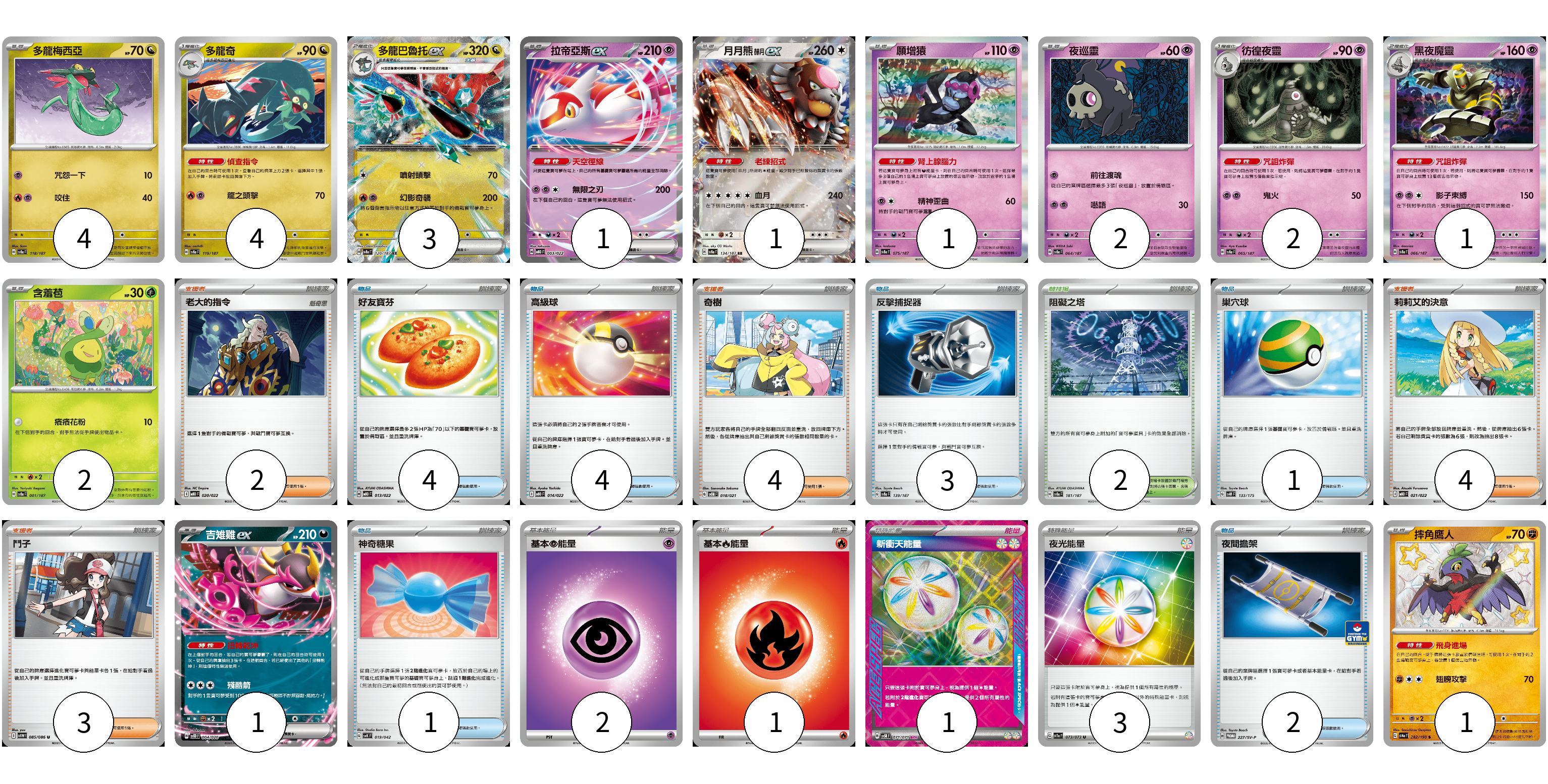 牌組構築方案 以此牌組為基礎新構築牌組 顯示卡面 顯示列表 寶可夢卡(23) 4 4 3 1 1 1 2 2 1 2 1 1 物品卡(15) 4 4 3 1 1 2 支援者卡(13) 2 4 4 3 競技場卡(2) 2 能量卡(7) 2 1 1 3 寶可夢卡(23) 卡牌名稱 張數 卡牌名稱 張數 多龍梅西亞 SV8a 118/187 04 多龍奇 SV8a 119/187 04 多龍巴魯托ex SV8a 120/187 03 拉帝亞斯ex MBD 003/022 01 月月熊 赫月ex SV8a 134/187 01 願增猿 SV8a 075/187 01 夜巡靈 SV8a 064/187 02 彷徨夜靈 SV8a 065/187 02 黑夜魔靈 SV8a 066/187 01 含羞苞 SV8a 001/187 02 吉雉雞ex SVOD 004/020 01 摔角鷹人 SV4a 282/190 01 物品卡(15) 卡牌名稱 張數 卡牌名稱 張數 好友寶芬 MBD 013/022 04 高級球 MBD 014/022 04 反擊捕捉器 SV8a 139/187 03 巢穴球 SVM 133/175 01 神奇糖果 SVK 019/042 01 夜間擔架 SV-P 227/SV-P 02 支援者卡(13) 卡牌名稱 張數 卡牌名稱 張數 老大的指令 MBD 020/022 02 奇樹 SVOM 018/021 04 莉莉艾的決意 MBD 021/022 04 鬥子 SV11W 085/086 03 競技場卡(2) 卡牌名稱 張數 卡牌名稱 張數 阻礙之塔 SV8a 181/187 02 能量卡(7) 卡牌名稱 張數 卡牌名稱 張數 基本【超】能量 M-P PSY 02 基本【火】能量 M-P FIR 01 新衝天能量 SV5K 071/071 01 夜光能量 SV1a 073/073 03 以此牌組為基礎新構築牌組 牌組編碼 rLmNZq-MzTrWu-nWuqJO copy 列印牌組單 牌組編碼已複製 分享至SNS