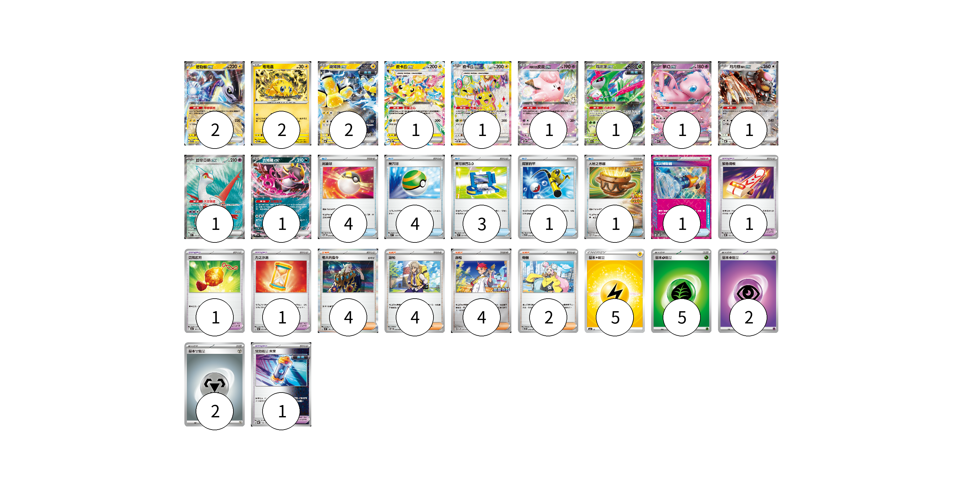 牌組構築方案 以此牌組為基礎新構築牌組 顯示卡面 顯示列表 寶可夢卡(14) 2 2 2 1 1 1 1 1 1 1 1 寶可夢道具(6) 1 1 1 2 1 物品卡(14) 4 4 3 1 1 1 支援者卡(12) 4 4 4 能量卡(14) 5 5 2 2 寶可夢卡(14) 卡牌名稱 張數 卡牌名稱 張數 密勒頓ex SVTR 008/021 02 電電蟲 SV7 032/102 02 鐵臂膀ex SV8a 054/187 02 皮卡丘ex SV8 033/106 01 皮卡丘ex SV8 122/106 01 莉莉艾的皮皮ex SV9 033/100 01 鐵斑葉ex SV5M 016/071 01 夢幻ex SVK 001/042 01 月月熊 赫月ex SV8a 134/187 01 拉帝亞斯ex SV7a 078/064 01 吉雉雞ex SV6a 038/064 01 寶可夢道具(6) 卡牌名稱 張數 卡牌名稱 張數 緊急滑板 SV8a 153/187 01 勇氣護符 SV4a 169/190 01 力之沙漏 SV6a 058/064 01 奇樹 SVTL 018/021 02 驅勁能量 未來 SV8a 158/187 01 物品卡(14) 卡牌名稱 張數 卡牌名稱 張數 高級球 SVOD 012/020 04 巢穴球 SVM 133/175 04 寶可裝置3.0 SVK 021/042 03 厲害釣竿 SVTR 012/021 01 大地之容器 SV-P 084/SV-P 01 頂尖捕捉器 SV5M 062/071 01 支援者卡(12) 卡牌名稱 張數 卡牌名稱 張數 老大的指令 SV4a 181/190 04 派帕 SVOD 018/020 04 赤松 SV-P 150/SV-P 04 能量卡(14) 卡牌名稱 張數 卡牌名稱 張數 基本雷能量 SN LIG 05 基本草能量 sv-p GRA 05 基本超能量 sv-p PSY 02 基本鋼能量 sv-p MET 02 以此牌組為基礎新構築牌組 牌組編碼 rNKPDt-sVotGk-jUMarA copy 列印牌組單 牌組編碼已複製 分享至SNS