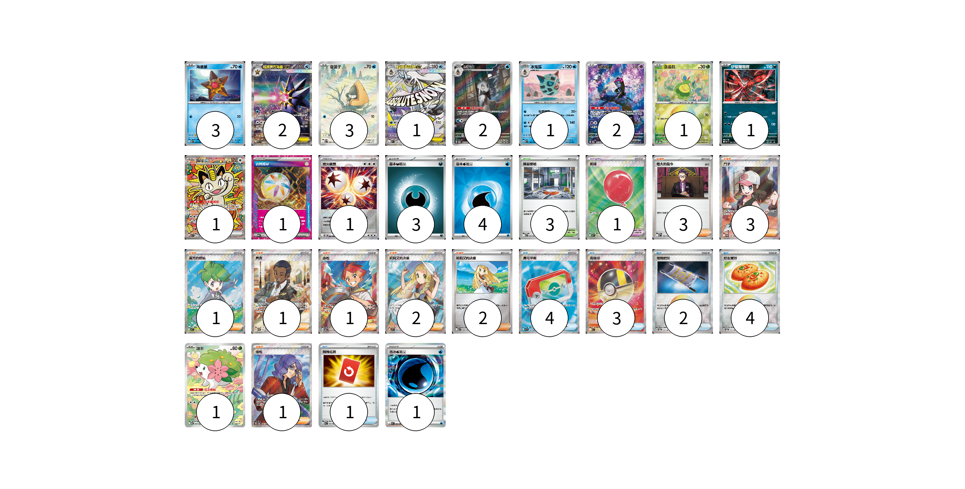 牌組構築方案 以此牌組為基礎新構築牌組 顯示卡面 顯示列表 寶可夢卡(18) 3 2 3 1 2 1 2 1 1 1 1 寶可夢道具(1) 1 物品卡(14) 4 3 2 4 1 支援者卡(14) 3 3 1 1 1 2 2 1 競技場卡(3) 3 能量卡(10) 1 1 3 4 1 寶可夢卡(18) 卡牌名稱 張數 卡牌名稱 張數 海星星 M3 020/080 03 超級寶石海星ex M3 111/080 02 雪童子 M2a 200/193 03 超級雪妖女ex M2a 224/193 01 雪妖女 SV6 104/101 02 冰鬼護 MC 187/742 01 願增猿 SV6 107/101 02 含羞苞 SV8a 001/187 01 伊裴爾塔爾 MC 481/742 01 喵喵ex M3 114/080 01 謝米 SV9a 066/063 01 寶可夢道具(1) 卡牌名稱 張數 卡牌名稱 張數 氣球 M1L 084/063 01 物品卡(14) 卡牌名稱 張數 卡牌名稱 張數 寶可平板 M3 103/080 04 高級球 M2a 216/193 03 夜間擔架 SV8a 151/187 02 好友寶芬 SV8a 147/187 04 特殊紅牌 M4 072/083 01 支援者卡(14) 卡牌名稱 張數 卡牌名稱 張數 老大的指令 MC 724/742 03 鬥子 SV11W 166/086 03 滿充的體貼 M1S 085/063 01 賽吉 SV5M 091/071 01 赤松 SV7 123/102 01 莉莉艾的決意 M1L 086/063 02 莉莉艾的決意 MC 729/742 02 悟松 SV5a 086/066 01 競技場卡(3) 卡牌名稱 張數 卡牌名稱 張數 險惡廢墟 M1L 063/063 03 能量卡(10) 卡牌名稱 張數 卡牌名稱 張數 古舊能量 SV8a 187/187 01 燃火能量 SV11W 086/086 01 基本【惡】能量 MC DAR 03 基本【水】能量 SVM WAT 04 泡沫【水】能量 M4 082/083 01 以此牌組為基礎新構築牌組 牌組編碼 rNvuIl-HqzcTD-Mfdzcf copy 列印牌組單 牌組編碼已複製 分享至SNS