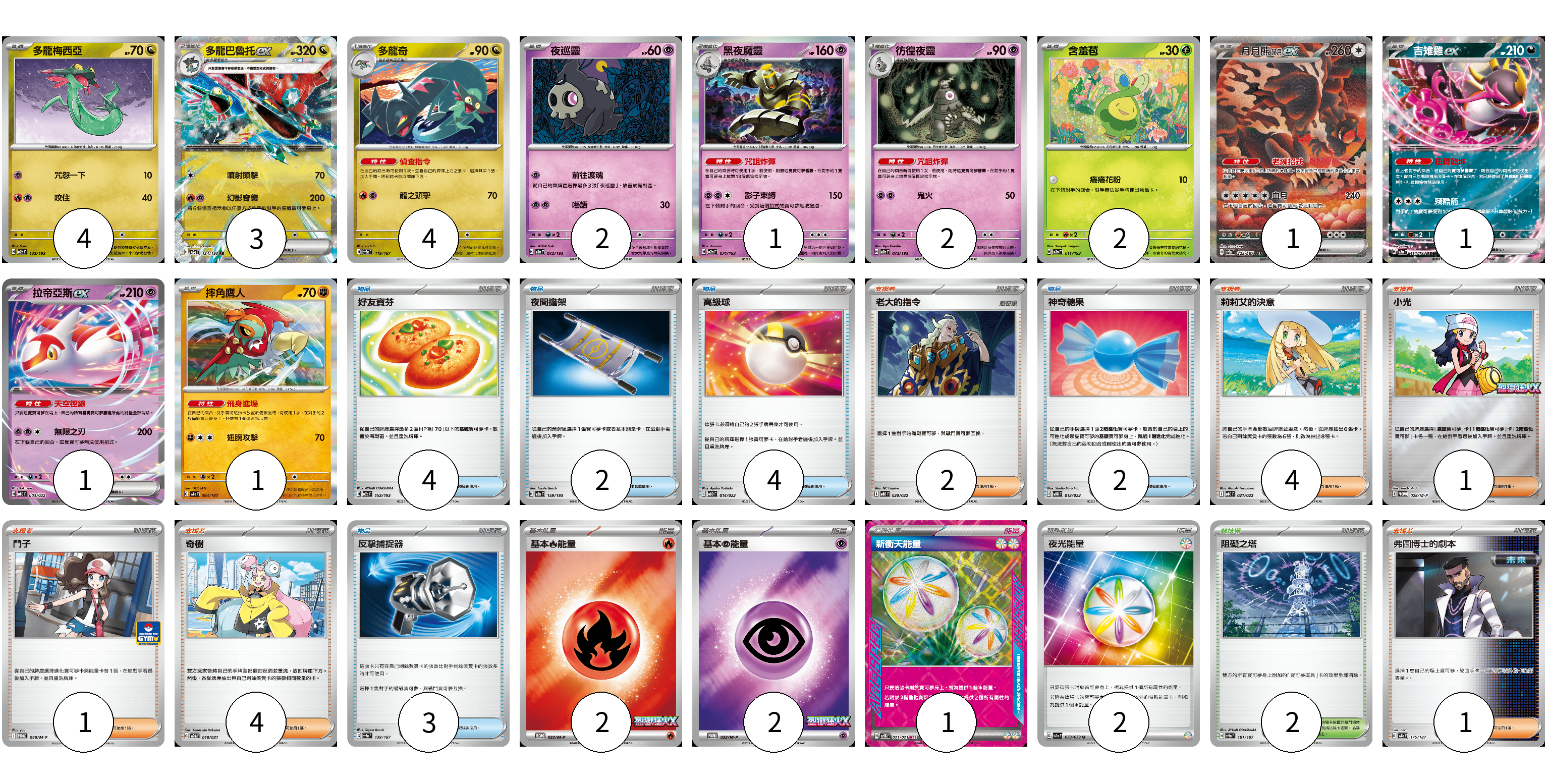 牌組構築方案 以此牌組為基礎新構築牌組 顯示卡面 顯示列表 寶可夢卡(22) 4 3 4 2 1 2 2 1 1 1 1 物品卡(15) 4 2 4 2 3 支援者卡(13) 2 4 1 1 4 1 競技場卡(2) 2 能量卡(7) 2 2 1 2 寶可夢卡(22) 卡牌名稱 張數 卡牌名稱 張數 多龍梅西亞 M2a 132/193 04 多龍巴魯托ex M2a 134/193 03 多龍奇 SV8a 119/187 04 夜巡靈 M2a 072/193 02 黑夜魔靈 M2a 074/193 01 彷徨夜靈 M2a 073/193 02 含羞苞 M2a 011/193 02 月月熊 赫月ex SV8a 225/187 01 吉雉雞ex M2a 114/193 01 拉帝亞斯ex MBD 003/022 01 摔角鷹人 SV8a 084/187 01 物品卡(15) 卡牌名稱 張數 卡牌名稱 張數 好友寶芬 M2a 153/193 04 夜間擔架 M2a 159/193 02 高級球 MBD 014/022 04 神奇糖果 MBG 013/022 02 反擊捕捉器 SV8a 139/187 03 支援者卡(13) 卡牌名稱 張數 卡牌名稱 張數 老大的指令 MBD 020/022 02 莉莉艾的決意 MBD 021/022 04 小光 M-P 028/M-P 01 鬥子 M-P 048/M-P 01 奇樹 SVOM 018/021 04 弗圖博士的劇本 SV8a 175/187 01 競技場卡(2) 卡牌名稱 張數 卡牌名稱 張數 阻礙之塔 SV8a 181/187 02 能量卡(7) 卡牌名稱 張數 卡牌名稱 張數 基本【火】能量 M-P 032/M-P 02 基本【超】能量 M-P 033/M-P 02 新衝天能量 SV5K 071/071 01 夜光能量 SV1a 073/073 02 以此牌組為基礎新構築牌組 牌組編碼 rRRRKp-cmHNbC-TLuDTc copy 列印牌組單 牌組編碼已複製 分享至SNS