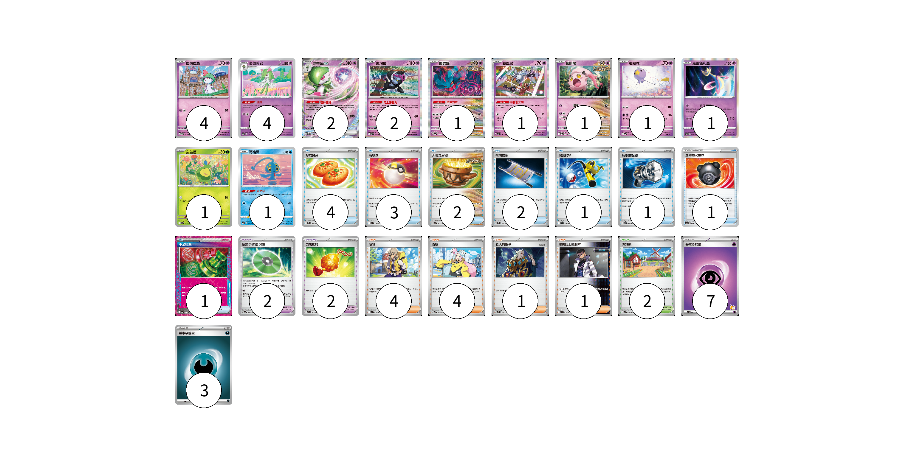 牌組構築方案 以此牌組為基礎新構築牌組 顯示卡面 顯示列表 寶可夢卡(19) 4 4 2 2 1 1 1 1 1 1 1 寶可夢道具(4) 2 2 物品卡(15) 4 3 2 2 1 1 1 1 支援者卡(10) 4 4 1 1 競技場卡(2) 2 能量卡(10) 7 3 寶可夢卡(19) 卡牌名稱 張數 卡牌名稱 張數 拉魯拉絲 SVTS 002/022 04 奇魯莉安 S11a 037/068 04 沙奈朵ex SVTS 004/022 02 願增猿 SV6 055/101 02 振翼髮 SV8a 072/187 01 鑰圈兒 SV4a 087/190 01 吼叫尾 SV8a 071/187 01 飄飄球 SV4a 083/190 01 克雷色利亞 S10D 028/067 01 含羞苞 SV8a 001/187 01 瑪納霏 SVF 003/038 01 寶可夢道具(4) 卡牌名稱 張數 卡牌名稱 張數 招式學習器 演進 SV8a 160/187 02 勇氣護符 SV4a 169/190 02 物品卡(15) 卡牌名稱 張數 卡牌名稱 張數 好友寶芬 SV8a 147/187 04 高級球 SVM 134/175 03 大地之容器 SV8a 143/187 02 夜間擔架 SV8a 151/187 02 厲害釣竿 SVK 011/042 01 反擊捕捉器 SVTS 009/022 01 洗翠的沉重球 SVF 019/038 01 不公印章 SV5a 053/066 01 支援者卡(10) 卡牌名稱 張數 卡牌名稱 張數 派帕 SVK 035/042 04 奇樹 SVK 031/042 04 老大的指令 SVM 172/175 01 弗圖博士的劇本 SVK 034/042 01 競技場卡(2) 卡牌名稱 張數 卡牌名稱 張數 深缽鎮 SVK 039/042 02 能量卡(10) 卡牌名稱 張數 卡牌名稱 張數 基本【超】能量 SVI PSY 07 基本【惡】能量 SVF DAR 03 以此牌組為基礎新構築牌組 牌組編碼 rRhYoG-JIWItR-XuwCpq copy 列印牌組單 牌組編碼已複製 分享至SNS