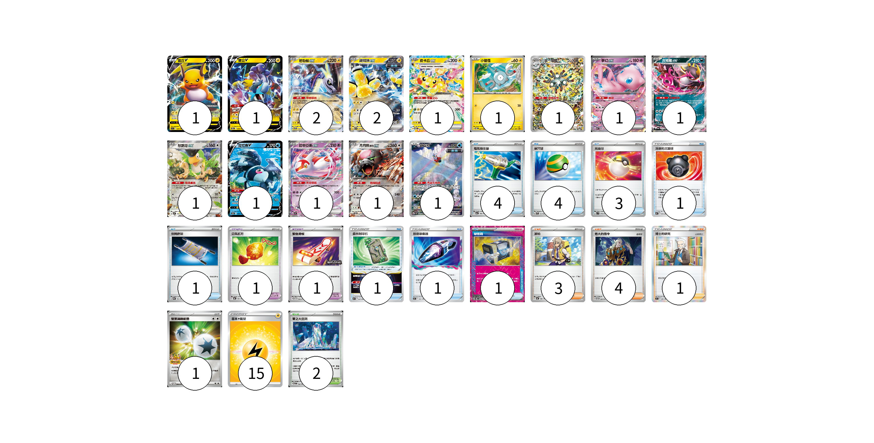 牌組構築方案 以此牌組為基礎新構築牌組 顯示卡面 顯示列表 寶可夢卡(16) 1 1 2 2 1 1 1 1 1 1 1 1 1 1 寶可夢道具(2) 1 1 物品卡(16) 4 4 3 1 1 1 1 1 支援者卡(8) 3 4 1 競技場卡(2) 2 能量卡(16) 1 15 寶可夢卡(16) 卡牌名稱 張數 卡牌名稱 張數 雷丘V S9 034/100 01 雷公V S12a 038/172 01 密勒頓ex SVTR 008/021 02 鐵臂膀ex SV4M 027/066 02 皮卡丘ex SV8 033/106 01 小磁怪 SV8 034/106 01 三合一磁怪 SV8 112/106 01 夢幻ex SVK 001/042 01 吉雉雞ex SV6a 038/064 01 怒鸚哥ex SV4a 154/190 01 霓虹魚V S12a 026/172 01 拉帝亞斯ex SV7a 019/064 01 月月熊 赫月 ex SV5a 052/066 01 鐵包袱 SV4M 071/066 01 寶可夢道具(2) 卡牌名稱 張數 卡牌名稱 張數 勇氣護符 SV4a 169/190 01 緊急滑板 SV-P 140/SV-P 01 物品卡(16) 卡牌名稱 張數 卡牌名稱 張數 電氣發生器 SV4a 156/190 04 巢穴球 SVAW 014/023 04 高級球 SV1V 070/078 03 洗翠的沉重球 SVF 019/038 01 夜間擔架 SV8a 151/187 01 森林封印石 SVF 024/038 01 放逐吸塵器 S11 093/100 01 秘密箱 SV6 092/101 01 支援者卡(8) 卡牌名稱 張數 卡牌名稱 張數 派帕 SV4a 180/190 03 老大的指令 SVTM 020/022 04 博士的研究(山梨博士) S9 095/100 01 競技場卡(2) 卡牌名稱 張數 卡牌名稱 張數 零之大空洞 SV7 102/102 02 能量卡(16) 卡牌名稱 張數 卡牌名稱 張數 雙重渦輪能量 SV-P 086/SV-P 01 基本【雷】能量 SI LIG 15 以此牌組為基礎新構築牌組 牌組編碼 rUiUEv-aIUEbK-ngvaeK copy 列印牌組單 牌組編碼已複製 分享至SNS