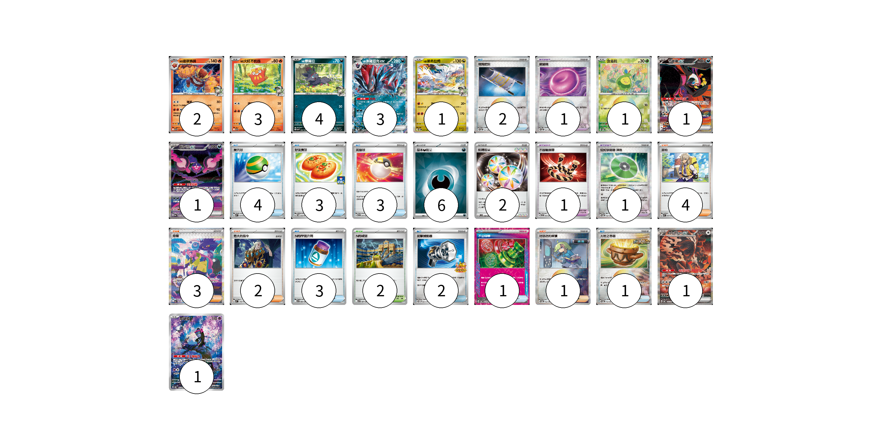 牌組構築方案 以此牌組為基礎新構築牌組 顯示卡面 顯示列表 寶可夢卡(18) 2 3 4 3 1 1 1 1 1 1 寶可夢道具(3) 1 1 1 物品卡(19) 2 4 3 3 3 2 1 1 支援者卡(10) 4 3 2 1 競技場卡(2) 2 能量卡(8) 6 2 寶可夢卡(18) 卡牌名稱 張數 卡牌名稱 張數 N的達摩狒狒 SV9 016/100 02 N的火紅不倒翁 SV9 015/100 03 N的索羅亞 SV9 060/100 04 N的索羅亞克ex SV9 061/100 03 N的萊希拉姆 SV9 074/100 01 含羞苞 SV8a 001/187 01 吉雉雞ex SV6a 089/064 01 桃歹郎ex SV6a 090/064 01 月月熊 赫月ex SV8a 225/187 01 願增猿 SV6 107/101 01 寶可夢道具(3) 卡牌名稱 張數 卡牌名稱 張數 鎖鏈糬 SV8a 154/187 01 不服輸頭帶 SVTL 016/021 01 招式學習器 演進 SV8a 160/187 01 物品卡(19) 卡牌名稱 張數 卡牌名稱 張數 夜間擔架 SV8a 151/187 02 巢穴球 SVK 016/042 04 好友寶芬 SV-P 212/SV-P 03 高級球 SVTR 014/021 03 N的PP提升劑 SV9 089/100 03 反擊捕捉器 SV-P 083/SV-P 02 不公印章 SV5a 053/066 01 大地之容器 SV8a 143/187 01 支援者卡(10) 卡牌名稱 張數 卡牌名稱 張數 派帕 SVK 035/042 04 奇樹 SV4a 350/190 03 老大的指令 SVM 172/175 02 暗碼迷的解讀 SV8a 165/187 01 競技場卡(2) 卡牌名稱 張數 卡牌名稱 張數 N的城堡 SV9 097/100 02 能量卡(8) 卡牌名稱 張數 卡牌名稱 張數 基本【惡】能量 SVK DAR 06 反轉能量 SVD 139/139 02 以此牌組為基礎新構築牌組 牌組編碼 rUjNin-avrCoG-TBQjUT copy 列印牌組單 牌組編碼已複製 分享至SNS