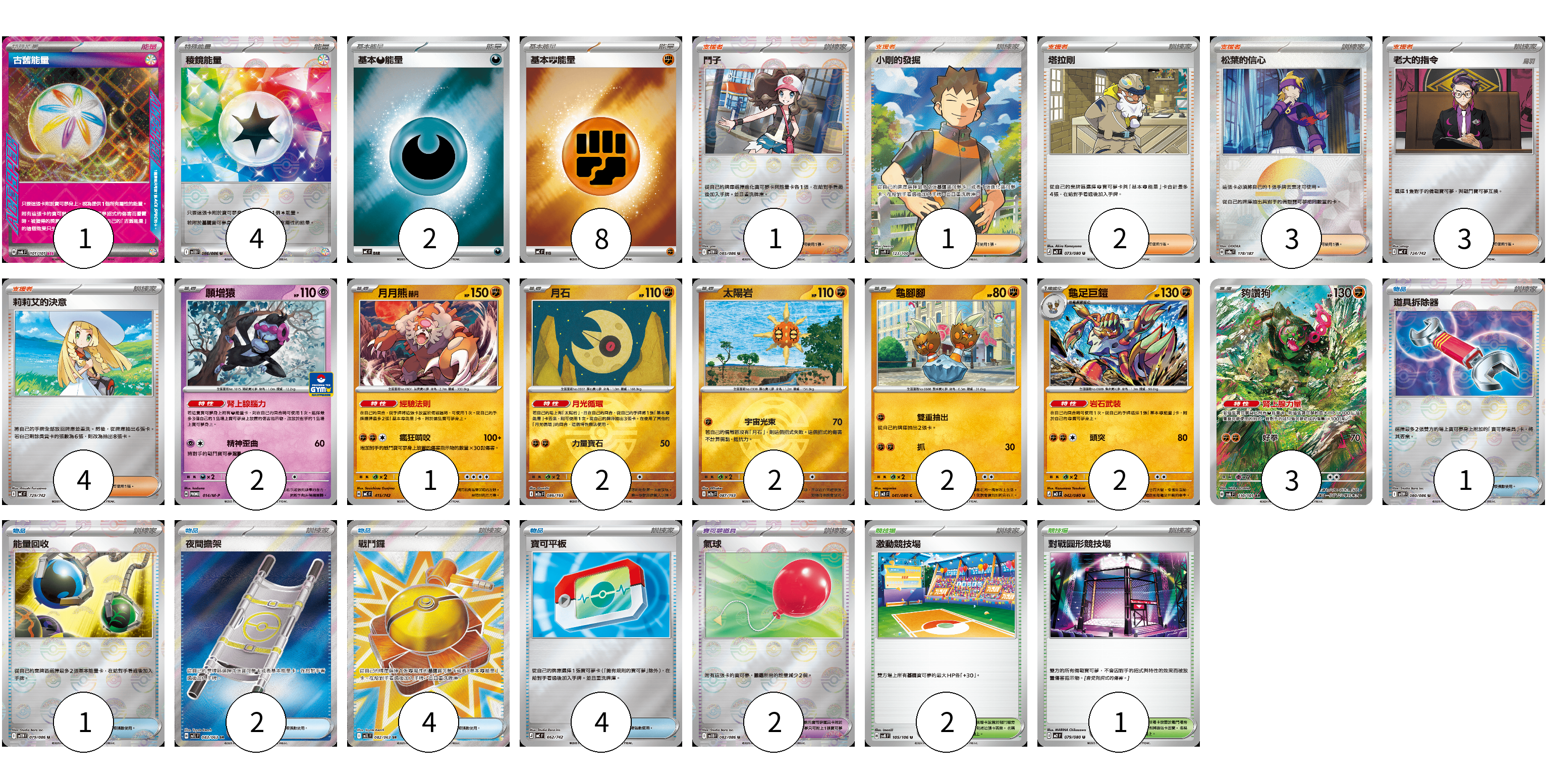 牌組構築方案 以此牌組為基礎新構築牌組 顯示卡面 顯示列表 寶可夢卡(14) 2 1 2 2 2 2 3 寶可夢道具(2) 2 物品卡(12) 1 1 2 4 4 支援者卡(14) 1 1 2 3 3 4 競技場卡(3) 2 1 能量卡(15) 1 4 2 8 寶可夢卡(14) 卡牌名稱 張數 卡牌名稱 張數 願增猿 M-P 014/M-P 02 月月熊 赫月 MC 415/742 01 月石 M2a 086/193 02 太陽岩 M2a 087/193 02 龜腳腳 M3 041/080 02 龜足巨鎧 M3 042/080 02 夠讚狗 SV6 110/101 03 寶可夢道具(2) 卡牌名稱 張數 卡牌名稱 張數 氣球 SV11B 082/086 02 物品卡(12) 卡牌名稱 張數 卡牌名稱 張數 道具拆除器 SV11W 080/086 01 能量回收 SV11W 079/086 01 夜間擔架 M1L 083/063 02 戰鬥鑼 M1L 082/063 04 寶可平板 MC 662/742 04 支援者卡(14) 卡牌名稱 張數 卡牌名稱 張數 鬥子 SV11W 085/086 01 小剛的發掘 SV9 123/100 01 塔拉剛 M3 073/080 02 松葉的信心 SV8a 178/187 03 老大的指令 MC 724/742 03 莉莉艾的決意 MC 729/742 04 競技場卡(3) 卡牌名稱 張數 卡牌名稱 張數 激動競技場 SV8 105/106 02 對戰圓形競技場 M2 079/080 01 能量卡(15) 卡牌名稱 張數 卡牌名稱 張數 古舊能量 SV6 101/101 01 稜鏡能量 SV11B 086/086 04 基本【惡】能量 MC DAR 02 基本【鬥】能量 MC FIG 08 以此牌組為基礎新構築牌組 牌組編碼 rVFAZK-yIIFjf-oBViEB copy 列印牌組單 牌組編碼已複製 分享至SNS