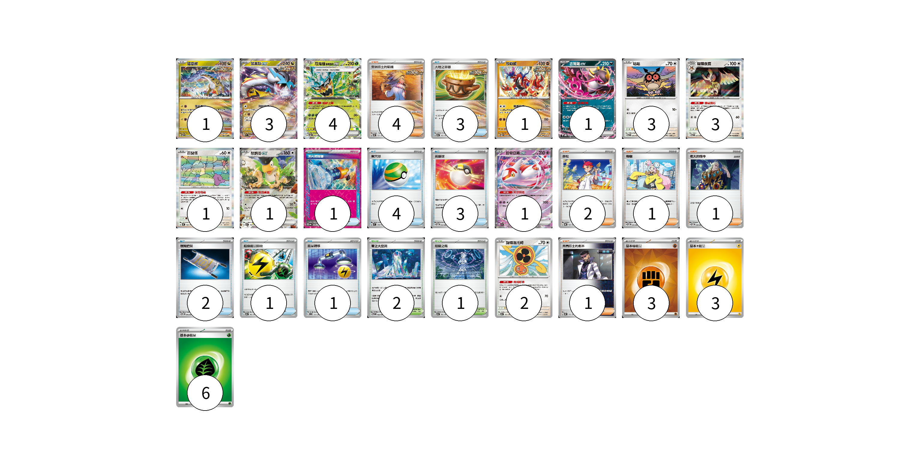 牌組構築方案 以此牌組為基礎新構築牌組 顯示卡面 顯示列表 寶可夢卡(21) 1 3 4 1 1 3 3 1 1 1 2 物品卡(15) 3 1 4 3 2 1 1 支援者卡(9) 4 2 1 1 1 競技場卡(3) 2 1 能量卡(12) 3 3 6 寶可夢卡(21) 卡牌名稱 張數 卡牌名稱 張數 猛雷鼓 SV7 075/102 01 猛雷鼓ex SV5K 053/071 03 厄鬼椪 碧草面具ex SV6 016/101 04 故勒頓 SV8 069/106 01 吉雉雞ex SVOD 004/020 01 咕咕 SV7 076/102 03 貓頭夜鷹 SV7 077/102 03 百變怪 SV4a 144/190 01 怒鸚哥ex SV4a 154/190 01 拉帝亞斯ex SV7a 019/064 01 旋轉洛托姆 SV8a 131/187 02 物品卡(15) 卡牌名稱 張數 卡牌名稱 張數 大地之容器 SV8a 143/187 03 頂尖捕捉器 SV8a 148/187 01 巢穴球 SVM 133/175 04 高級球 SVOD 012/020 03 夜間擔架 SVOM 016/021 02 超級能量回收 SV8a 141/187 01 能量轉移 SVD 111/139 01 支援者卡(9) 卡牌名稱 張數 卡牌名稱 張數 奧琳博士的氣魄 SV8a 167/187 04 赤松 SV8a 163/187 02 奇樹 SVOD 016/020 01 老大的指令 SVOD 019/020 01 弗圖博士的劇本 SV8a 175/187 01 競技場卡(3) 卡牌名稱 張數 卡牌名稱 張數 零之大空洞 SV7 102/102 02 阻礙之塔 SV8a 181/187 01 能量卡(12) 卡牌名稱 張數 卡牌名稱 張數 基本【鬥】能量 SVK FIG 03 基本【雷】能量 SVHM LIG 03 基本【草】能量 SVF GRA 06 以此牌組為基礎新構築牌組 牌組編碼 rVZXcM-rsyEWt-gQHJrI copy 列印牌組單 牌組編碼已複製 分享至SNS